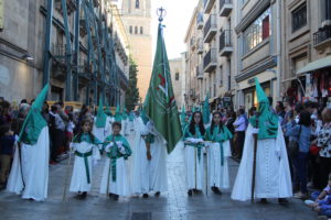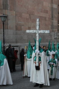 El cortejo de los capirotes verdes siguen su recorrido por la calle San Pablo, y en la plaza de Concilio de Trento celebran una oración por los difuntos, en esta ocasión, como señala el hermano mayor, “por los fallecidos en la pandemia, y por todos los que están sufriendo, como en la guerra de Ucrania”. Y de nuevo en la puerta de la iglesia del Carmen de Abajo, finaliza su procesión.