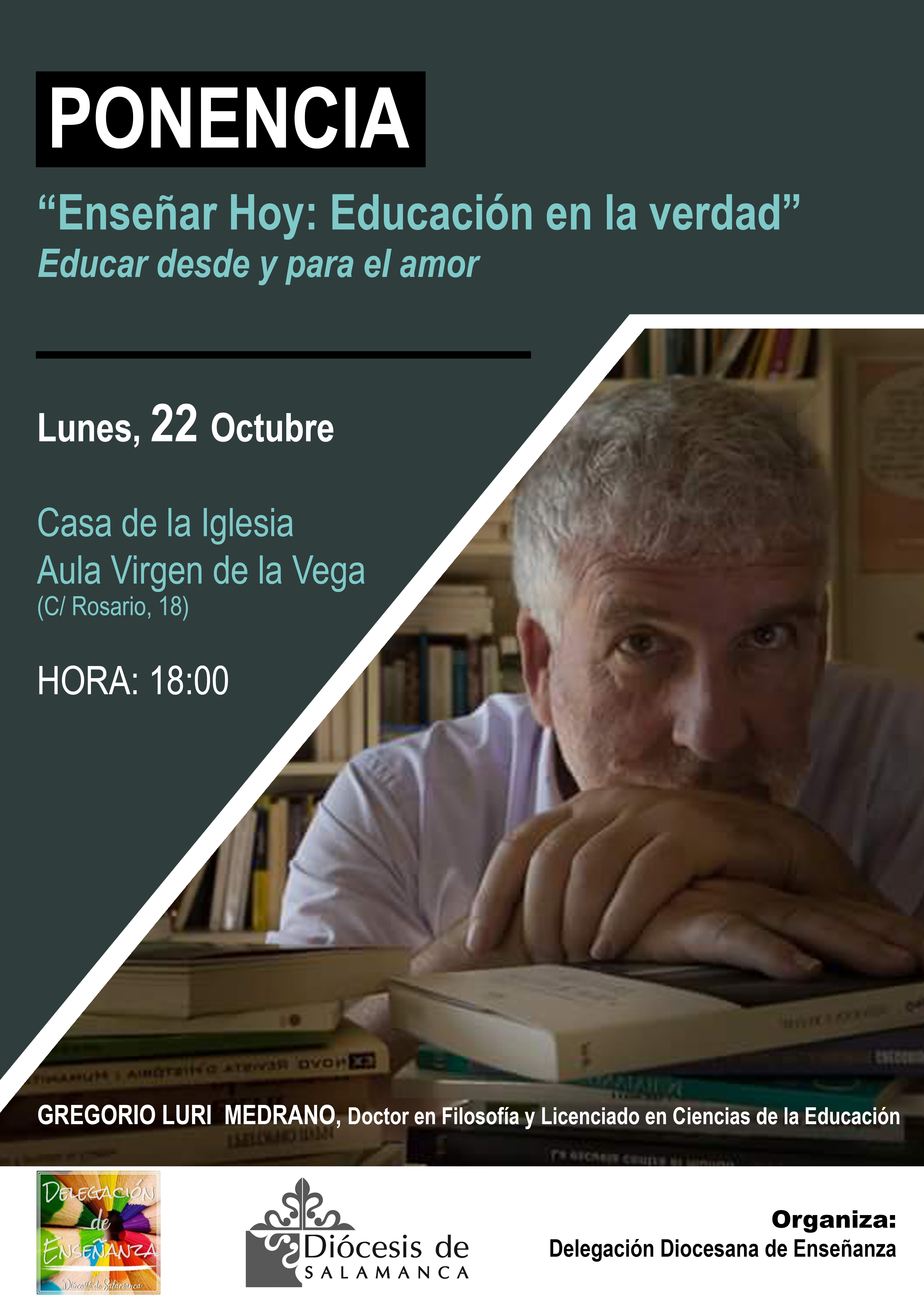 La Delegación diocesana de Enseñanza organiza la conferencia: “Enseñar hoy: Educación en la verdad. Educar desde y para el amor”, que será impartida por el filósofo, pedagogo y escritor Gregorio Luri Medrano el lunes 22 de octubre, a las 18.00 horas en el Aula Virgen Vega de la Casa de la Iglesia (C/ Rosario, 18).