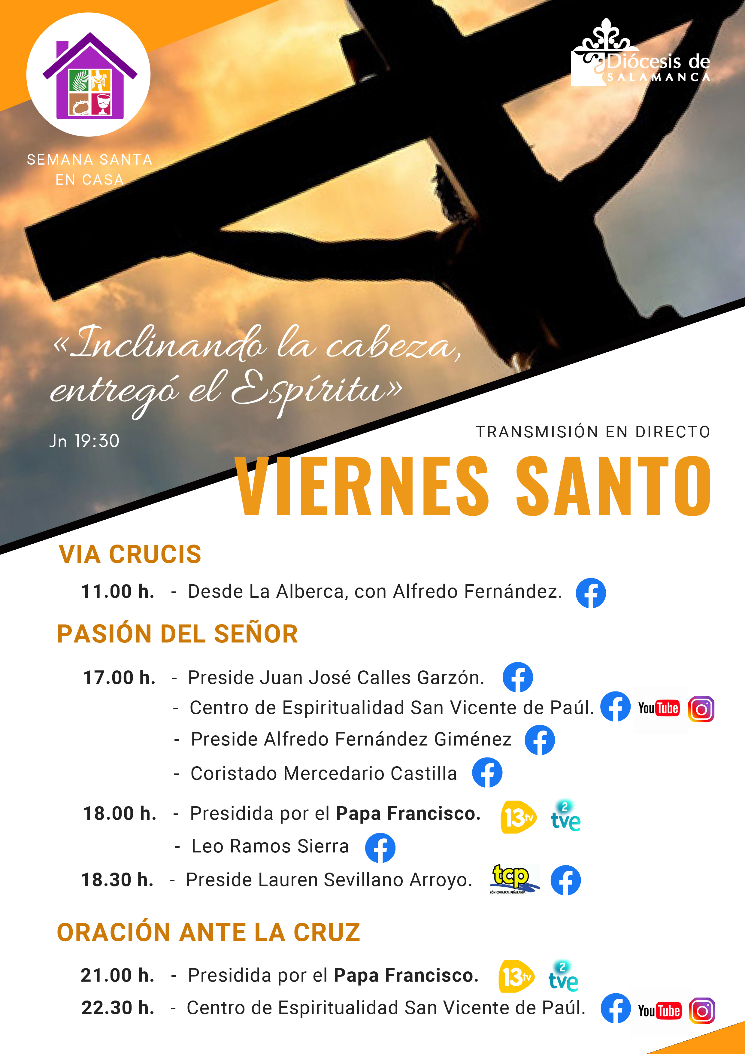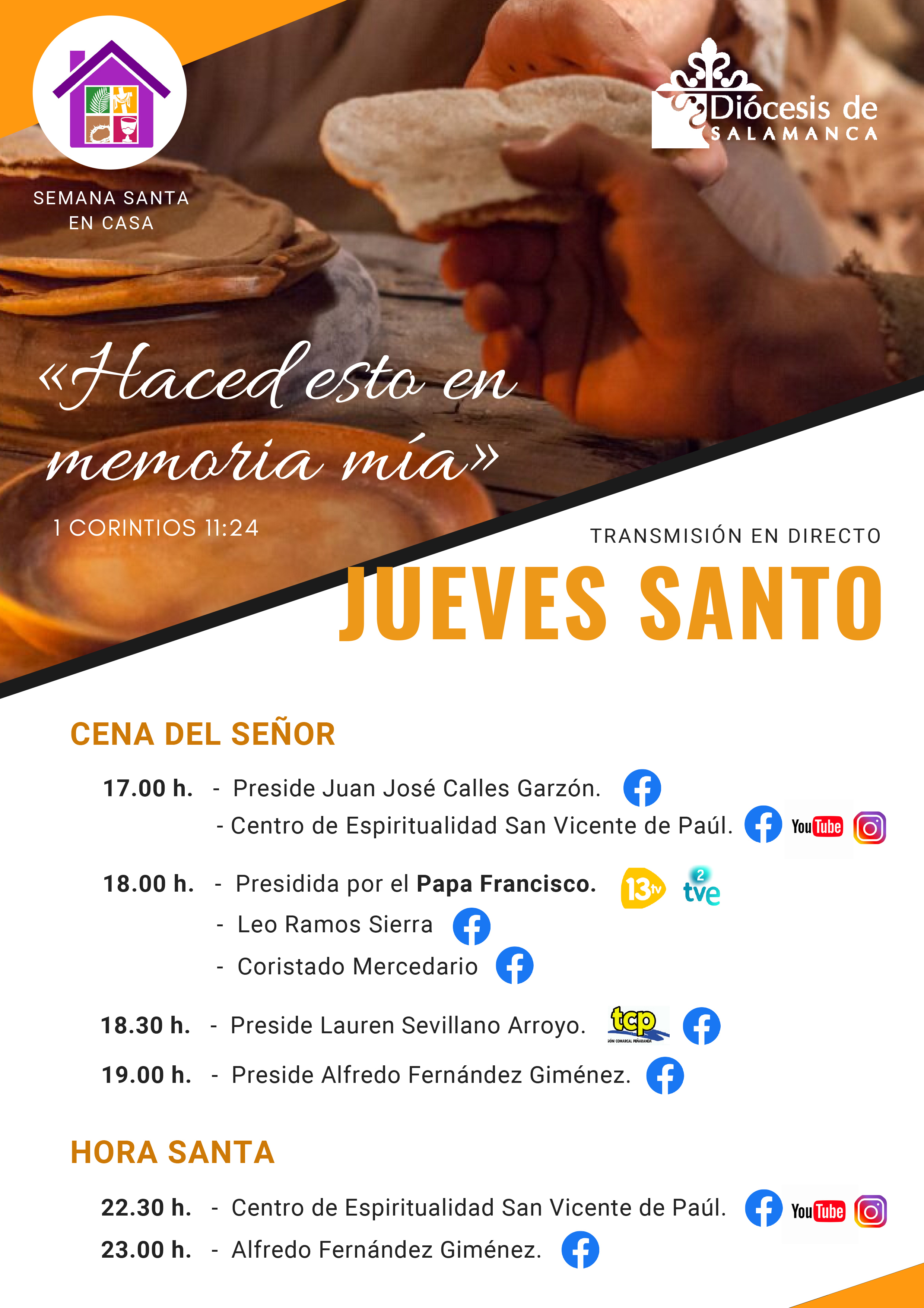 Desde el confinamiento por el Estado de Alarma, varios sacerdotes y comunidades de religiosos de la Diócesis de Salamanca celebran desde su hogar a diario, o los domingos, la eucaristía y la transmiten en directo a través de las redes sociales. En estos días del Triduo pascual también lo harán y así se refleja en la guía que puedes descargar pulsando aquí.