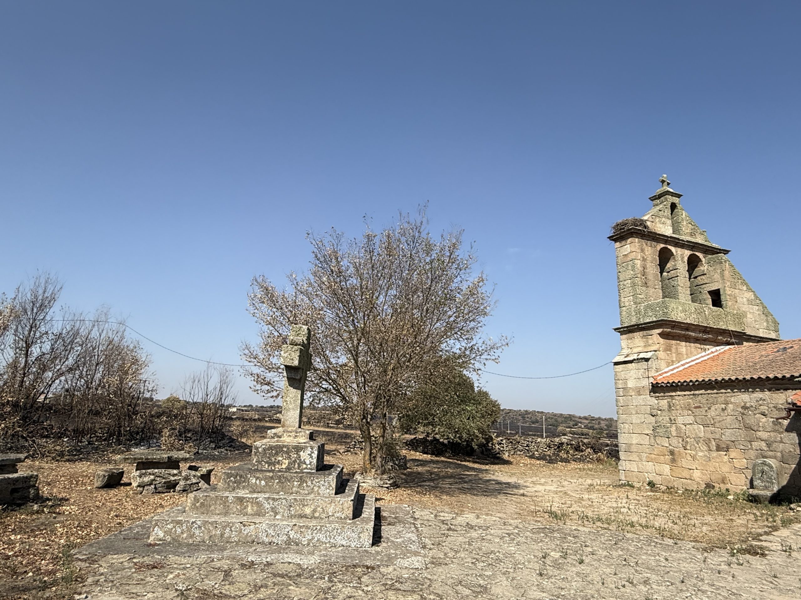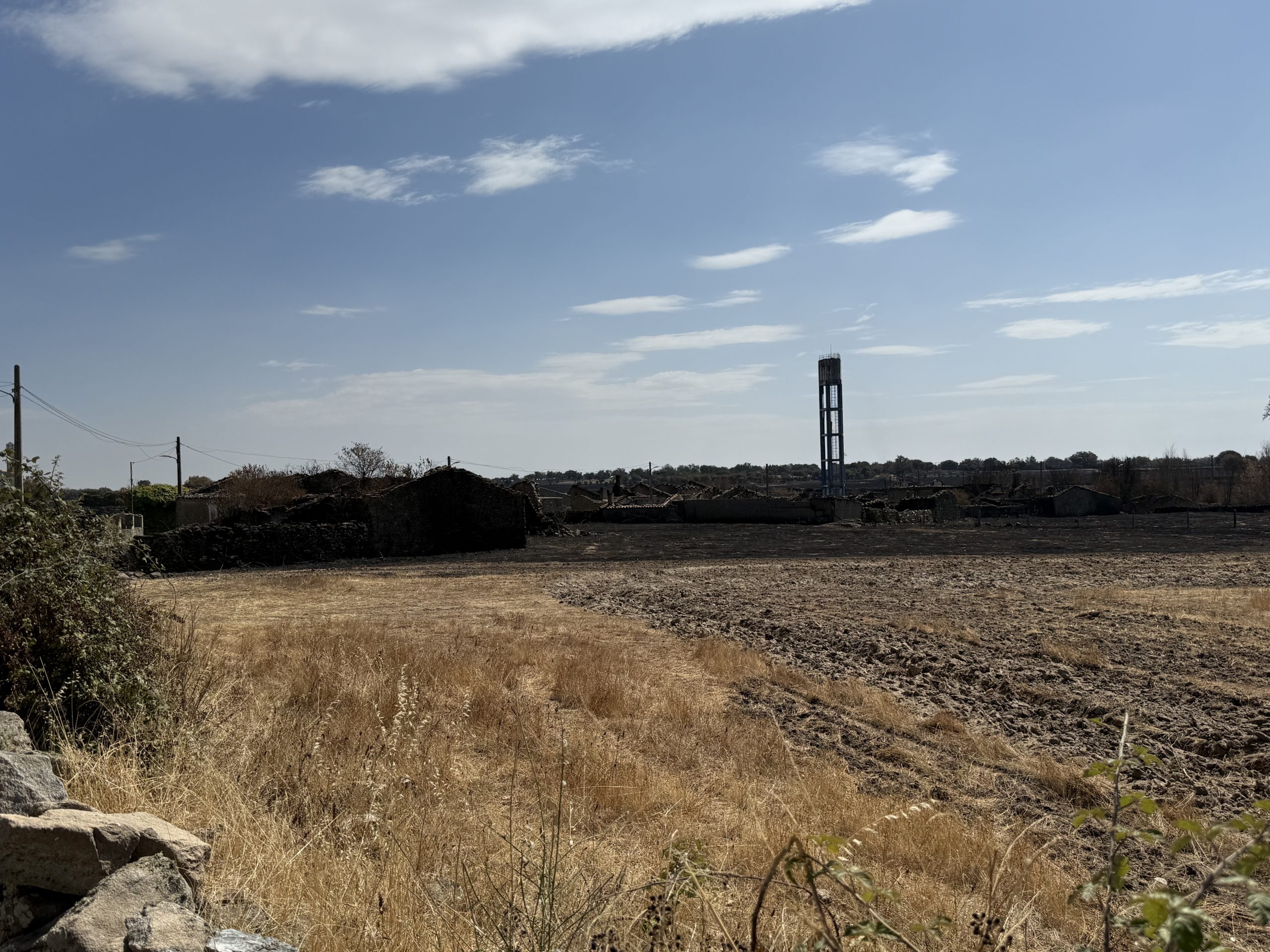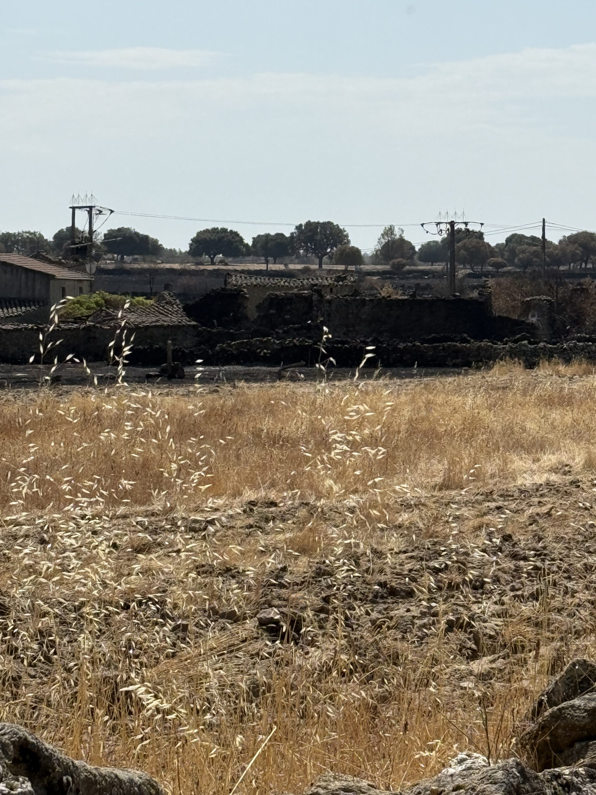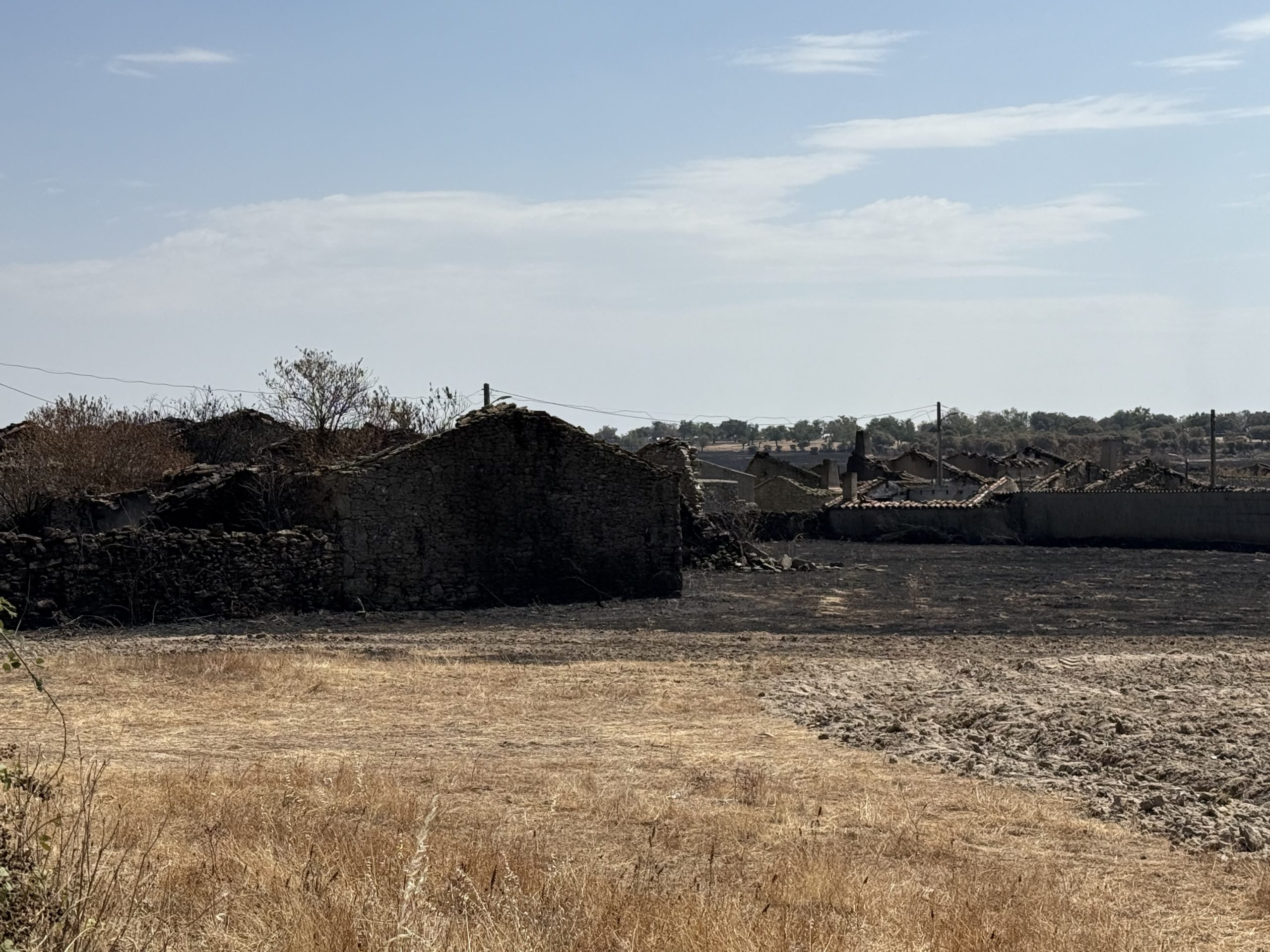 A ambos lados del camino que une Gejo de los Reyes y El Groo ha dejado su rastro el fuego que asoló más de 11.000 hectáreas. Se aprecia el esqueleto de una nave que estaba llena de paja, que ahora está calcinada. En El Groo, la iglesia también se libró por pocos metros, pero muchas casas, ya deshabitadas, fueron pasto de las llamas, y el escenario es desolador.