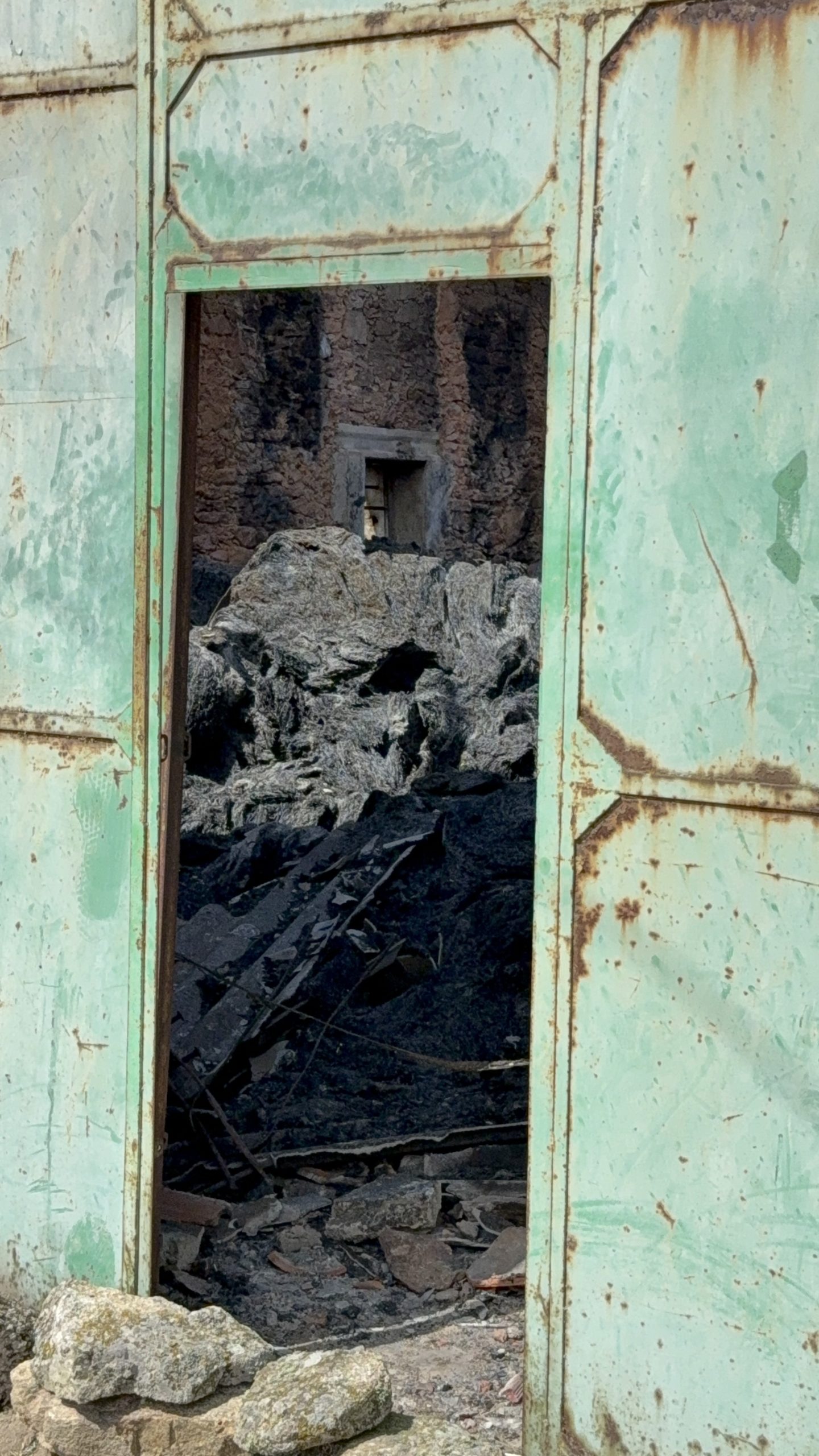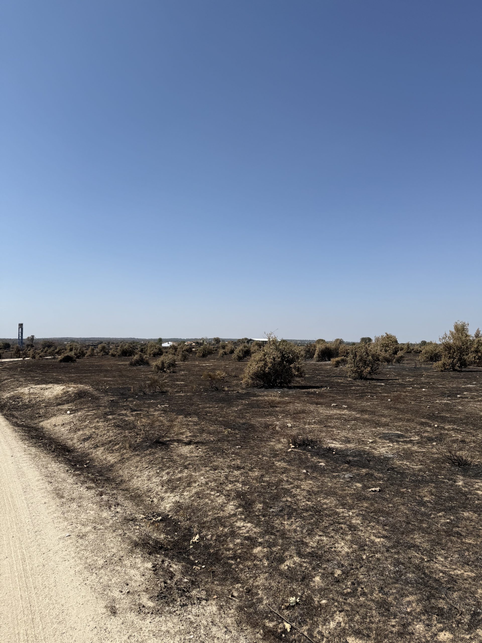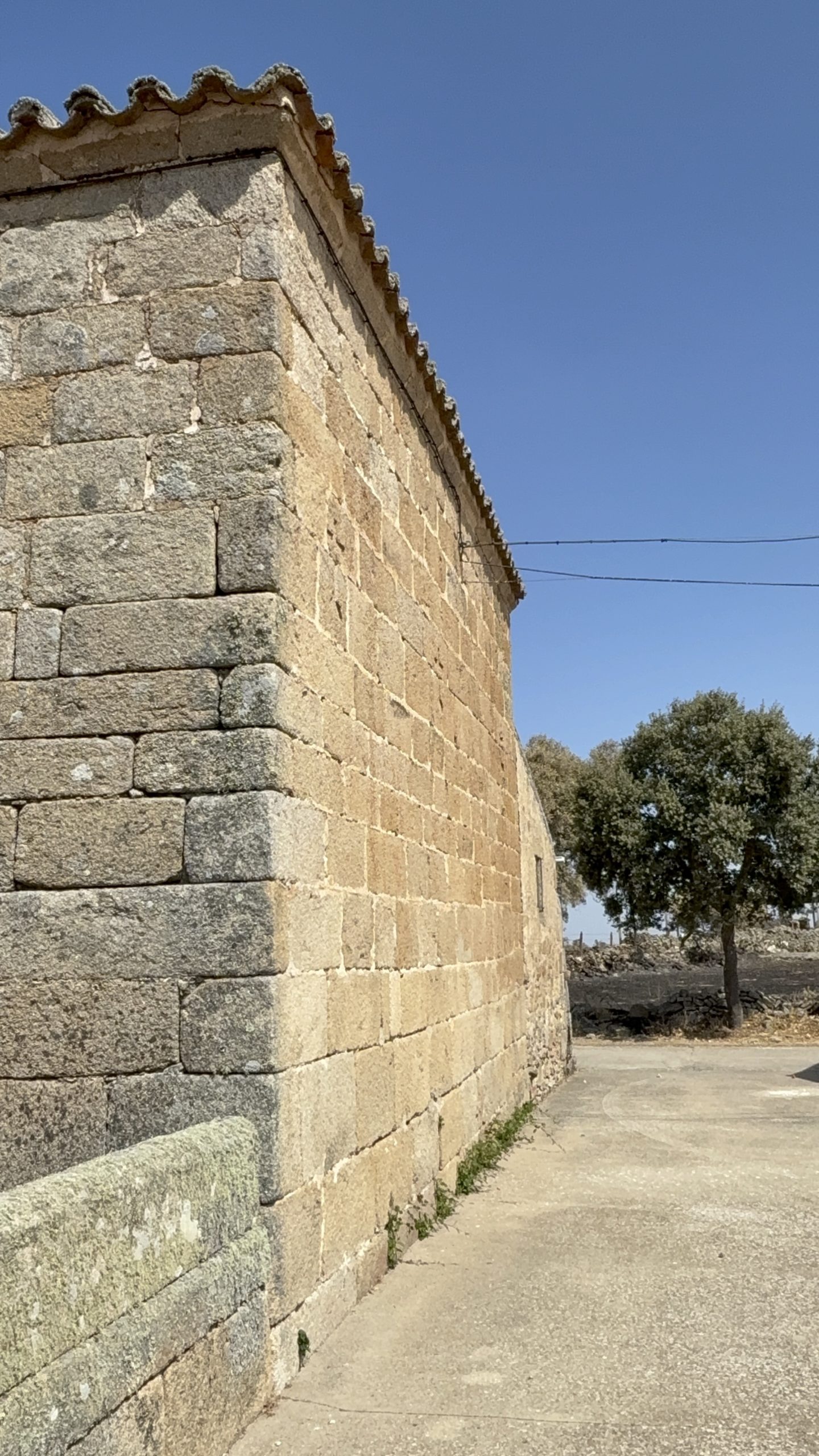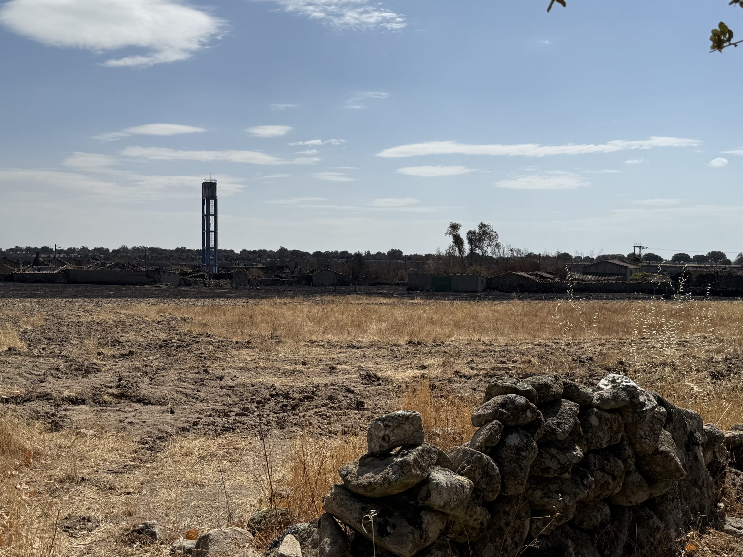 A ambos lados del camino que une Gejo de los Reyes y El Groo ha dejado su rastro el fuego que asoló más de 11.000 hectáreas. Se aprecia el esqueleto de una nave que estaba llena de paja, que ahora está calcinada. En El Groo, la iglesia también se libró por pocos metros, pero muchas casas, ya deshabitadas, fueron pasto de las llamas, y el escenario es desolador.