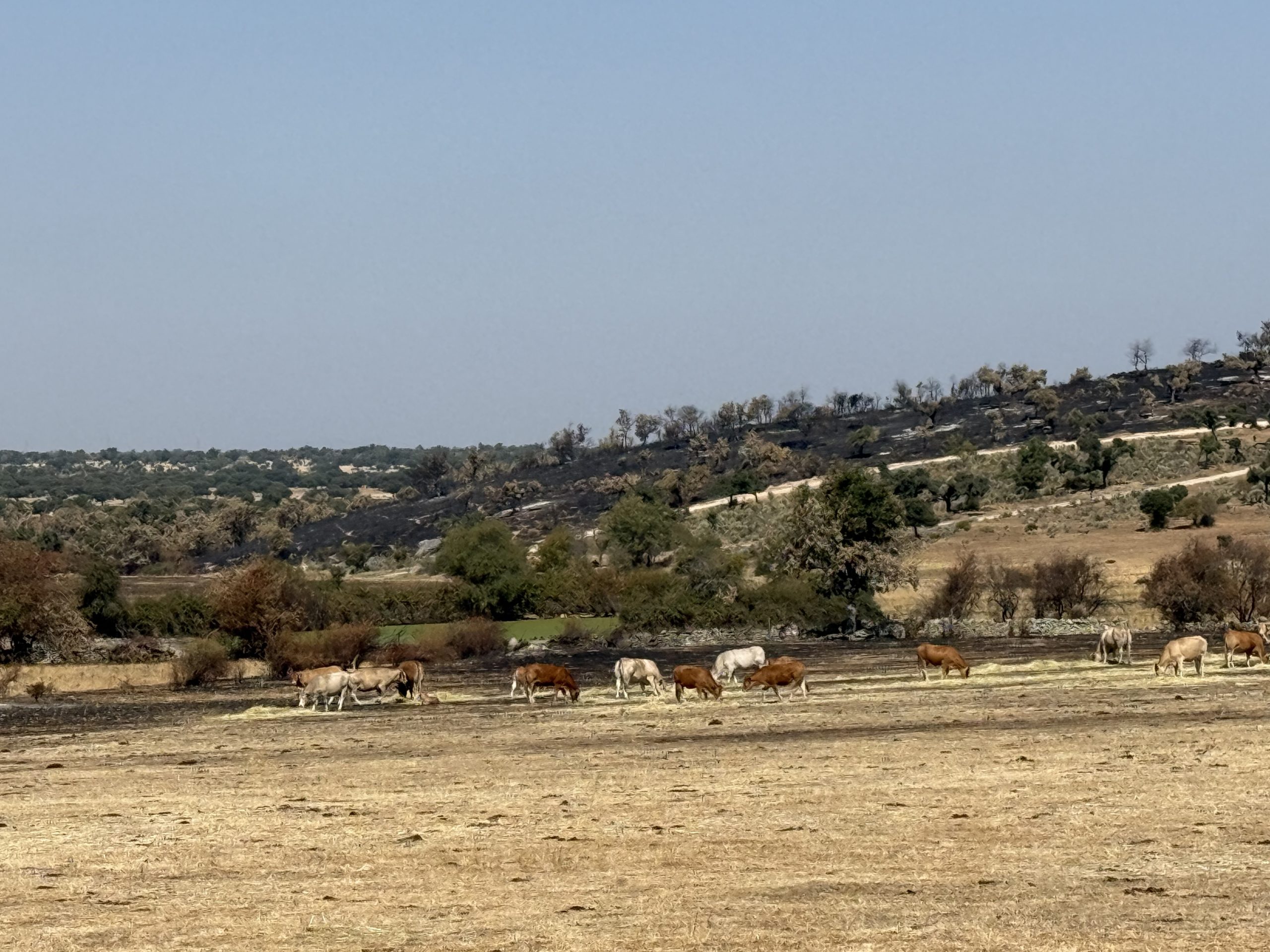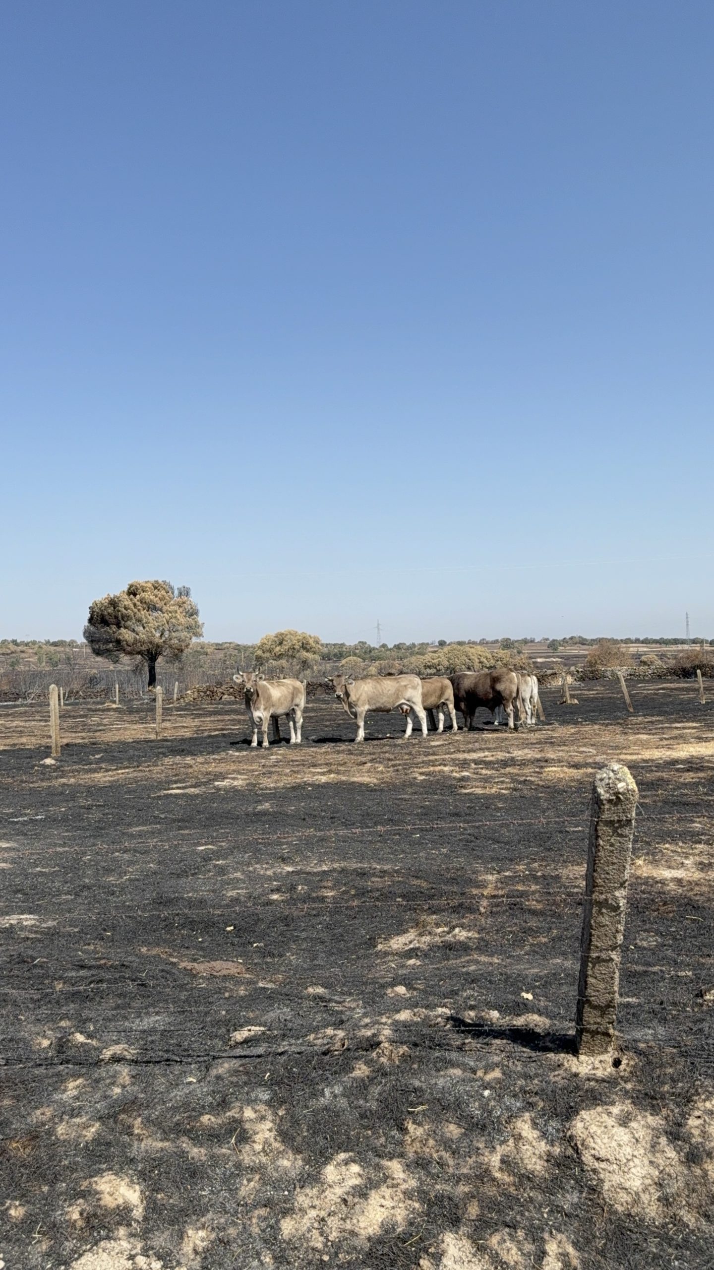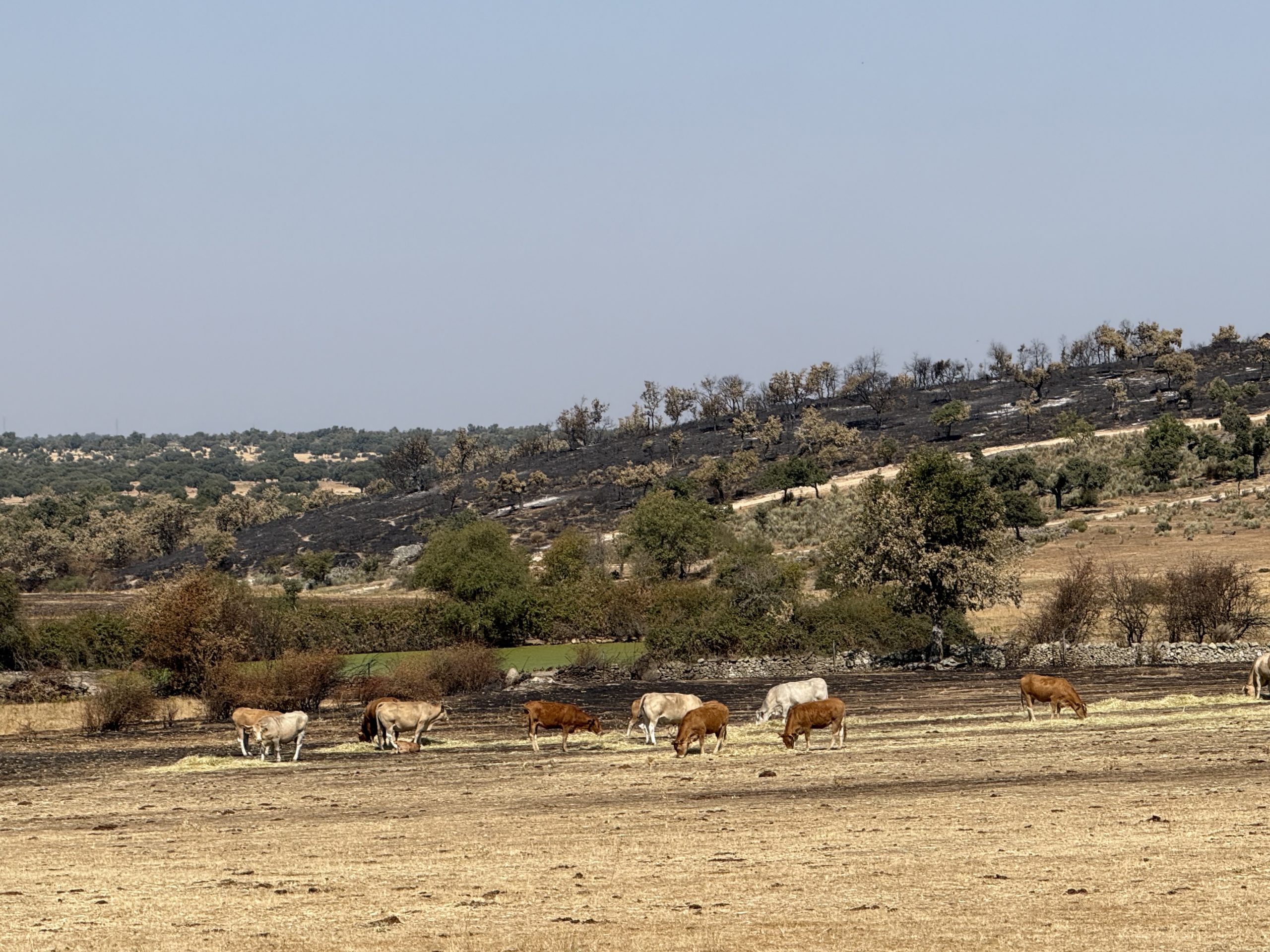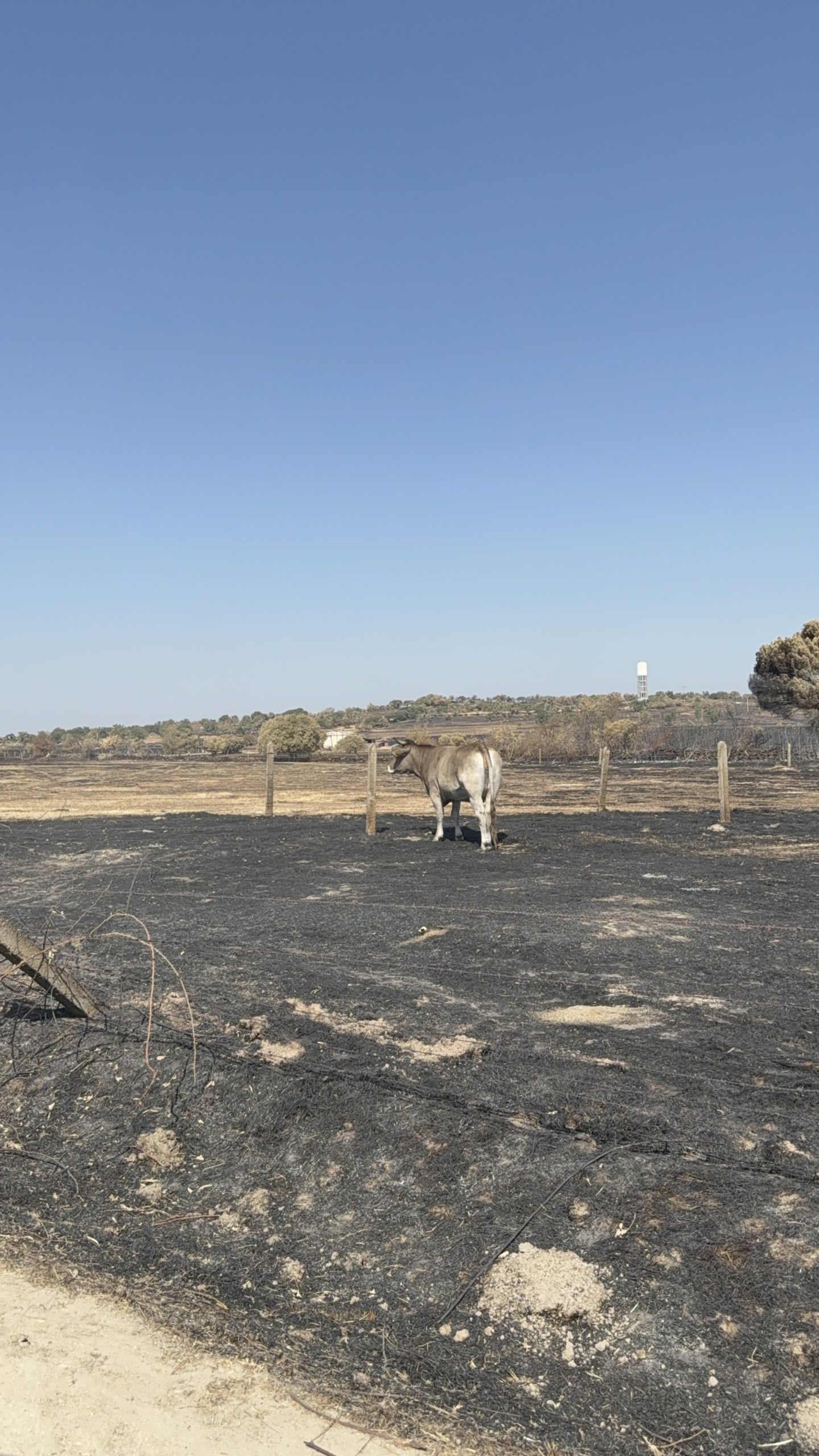 Las vacas de Herminio Mangas pastan en campos quemados gracias a las pacas de paja que se salvaron del incendio. “Fue un milagro”, y se emociona al señalar el lugar. Entre el paisaje quemado hasta donde se pierde la vista, se aprecia un montón de forraje almacenado amarillo, que libró de las llamas: “Nos ayudaron los bomberos y un sobrino con la manguera, porque teníamos un grifo, pero ha sido un milagro, y creo que en algo así, Dios algo habrá hecho”. Su pequeño huerto también se salvó del incendio por estar levantado sobre muros de piedra.