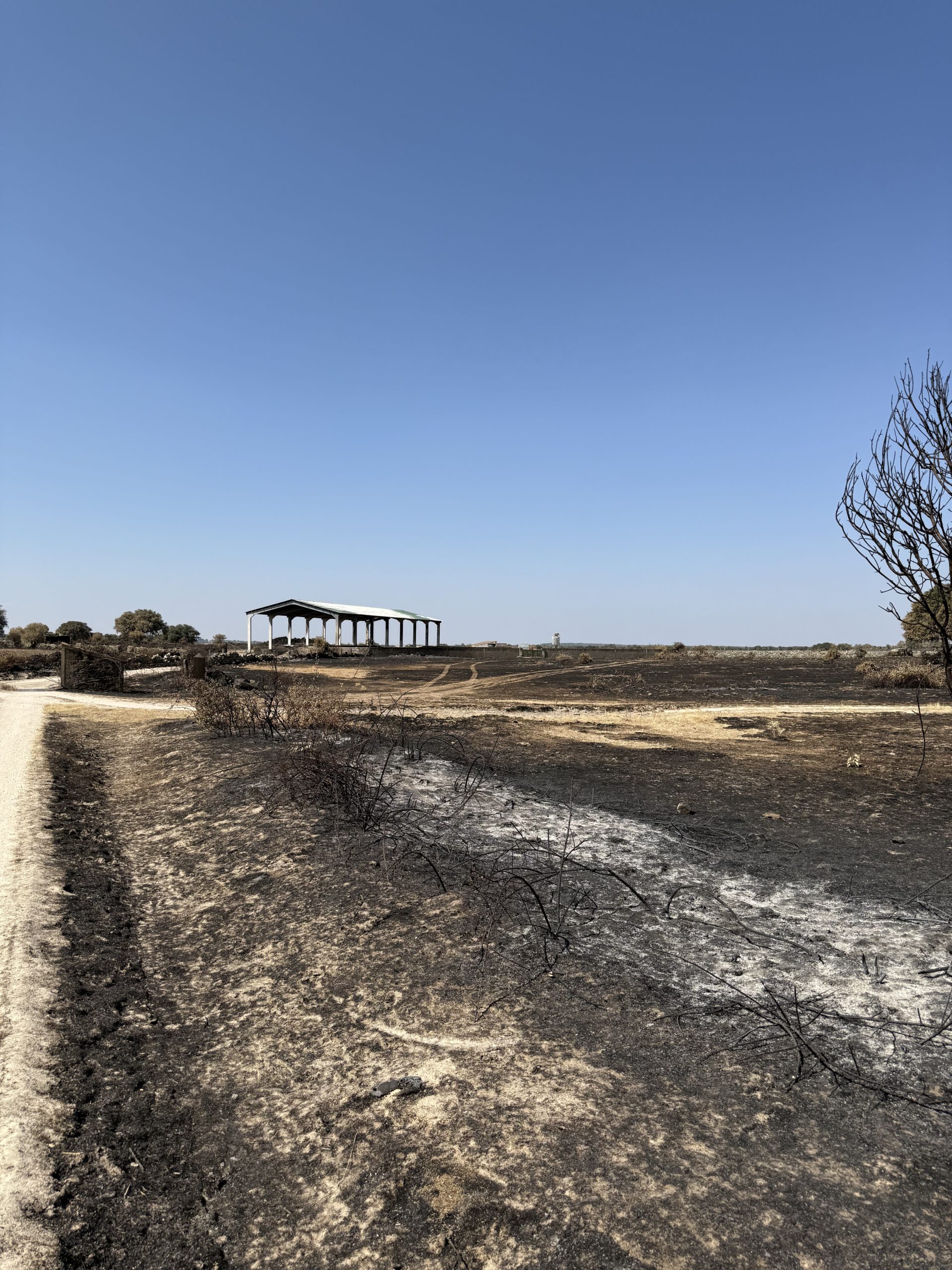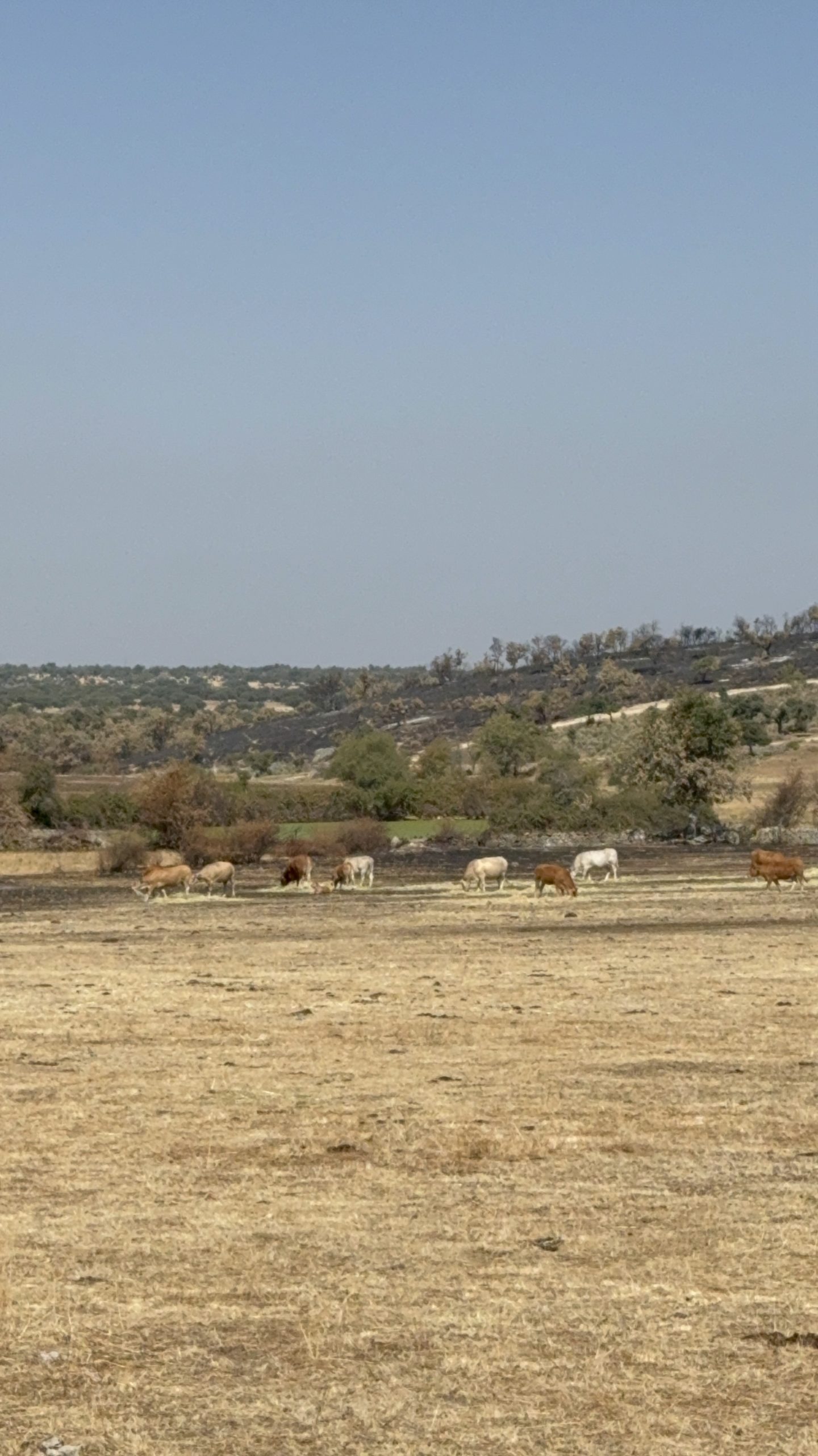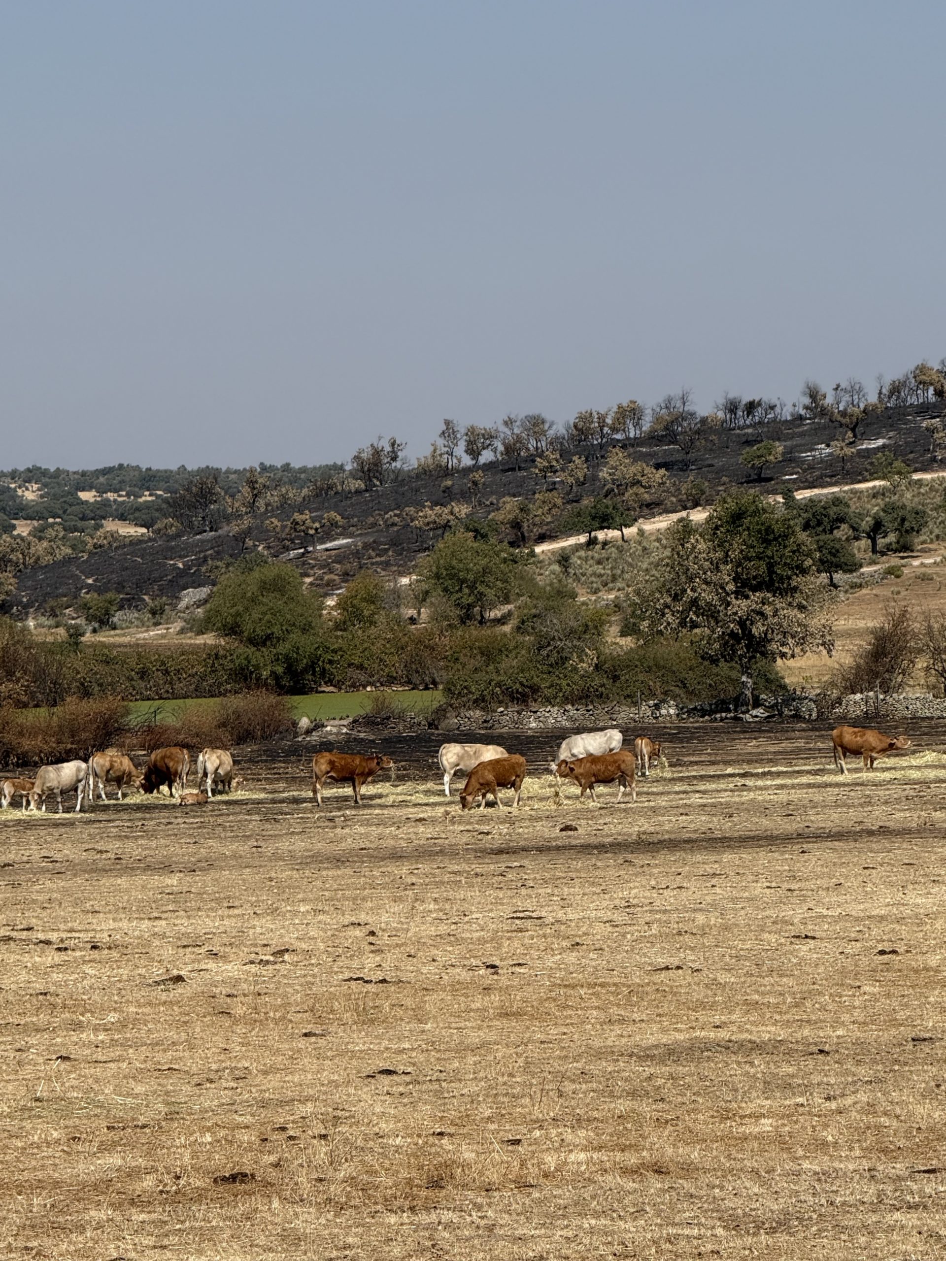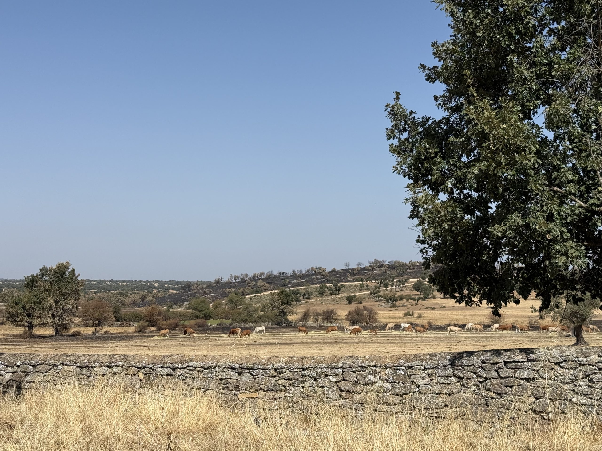 Las vacas de Herminio Mangas pastan en campos quemados gracias a las pacas de paja que se salvaron del incendio. “Fue un milagro”, y se emociona al señalar el lugar. Entre el paisaje quemado hasta donde se pierde la vista, se aprecia un montón de forraje almacenado amarillo, que libró de las llamas: “Nos ayudaron los bomberos y un sobrino con la manguera, porque teníamos un grifo, pero ha sido un milagro, y creo que en algo así, Dios algo habrá hecho”. Su pequeño huerto también se salvó del incendio por estar levantado sobre muros de piedra.