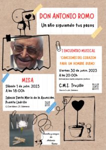 Al cumplirse el primer aniversario de su muerte, sus familiares y amigos han organizado dos actos para recordarle, bajo el título: “Don Antonio Romo. Un año siguiendo tus pasos”. El primero de ellos tendrá lugar este viernes, 30 de junio, a las 20:00 horas, en el Centro Municipal Integrado Trujillo, en la plaza Trujillo, con el I Encuentro Musical “Canciones del corazón para un hombre bueno”. Como apuntan sus organizadores, la música siempre ha marcado los pasos de Romo, y en esta ocasión, le acompañarán amigos a través de este medio. La entrada es libre hasta completar el aforo.