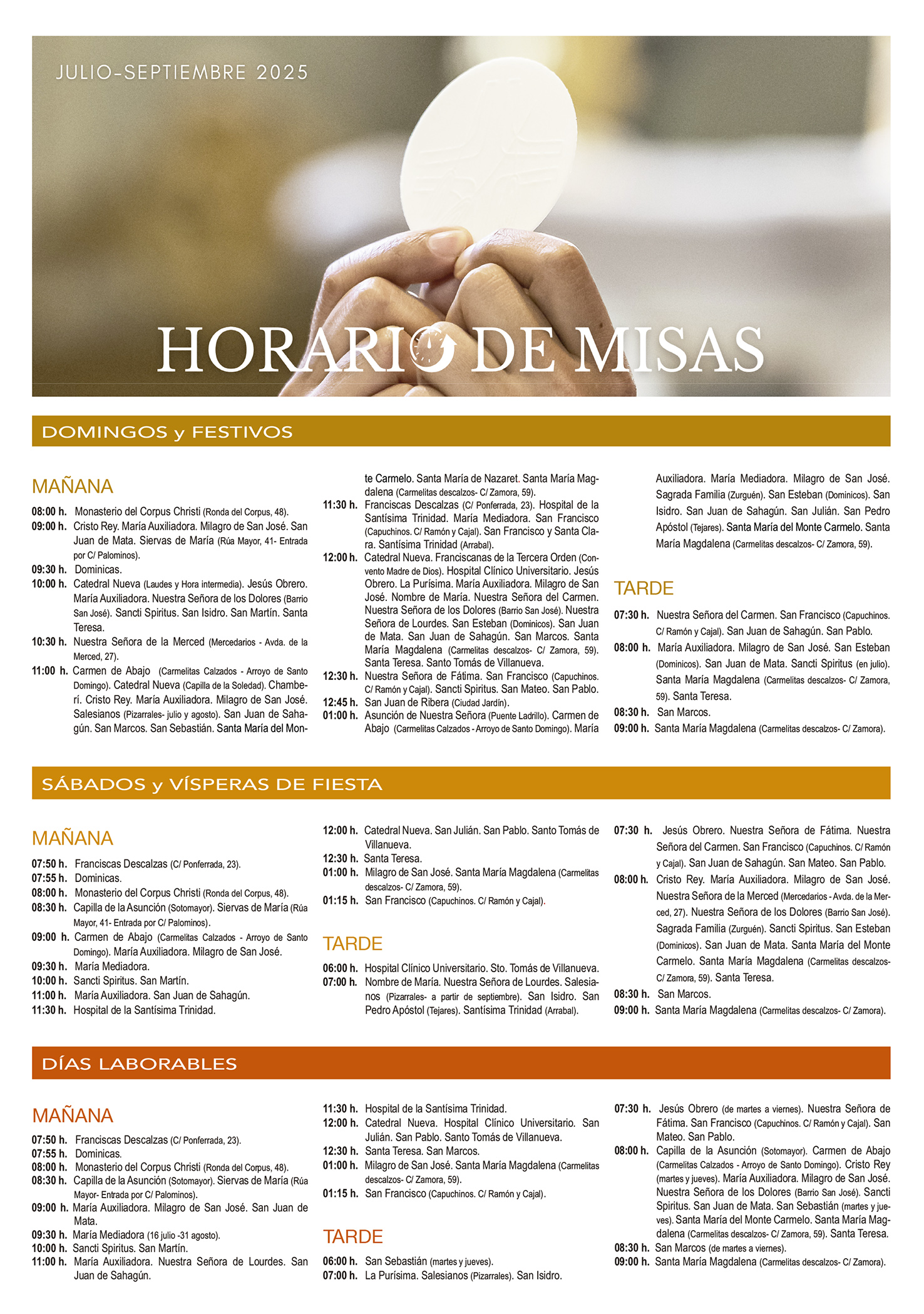 El horario recoge, de manera detallada, las celebraciones en domingos y solemnidades, así como las de los sábados y vísperas de fiesta, y las de los días laborables.