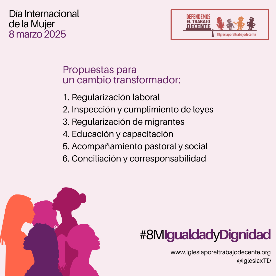Entre ellas, figuran la regularización laboral en sectores como el doméstico, agrícola y de servicios; el fortalecimiento de la inspección laboral para combatir abusos y explotación; la regularización de personas migrantes, garantizando derechos laborales y sociales; la formación y capacitación para mejorar el acceso a empleos de calidad; el acompañamiento pastoral y social, con un compromiso firme de la Iglesia en la defensa de las trabajadoras más vulnerables y la conciliación y corresponsabilidad, promoviendo políticas que equilibren la vida laboral y familiar.