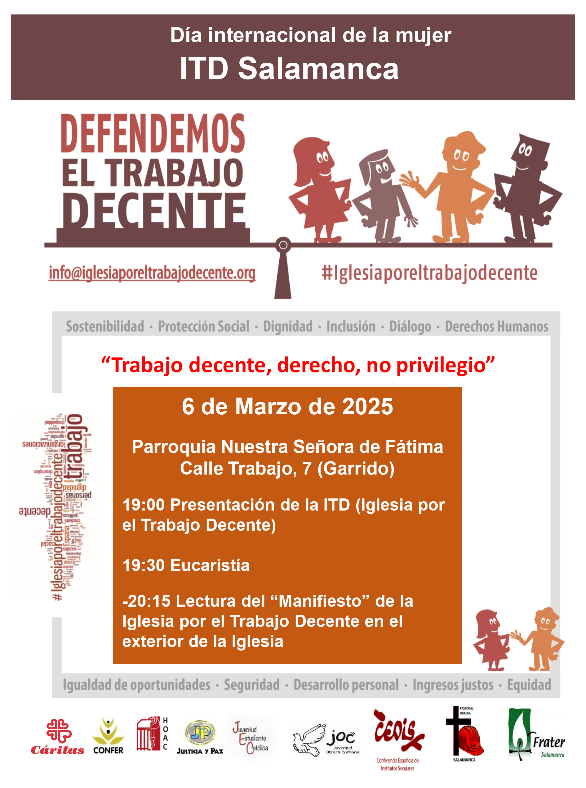 Iglesia por el Trabajo Decente denuncia que la desigualdad, la explotación y la precariedad afecta especialmente a las mujeres en el ámbito laboral, y lo hace con motivo de la celebración del Día Internacional de la Mujer, que se conmemora el 8 de marzo. En Salamanca, se dedicará una jornada a la sensibilización de este tema, en concreto, el jueves, 6 de marzo, en la parroquia de Nuestra Señora de Fátima.