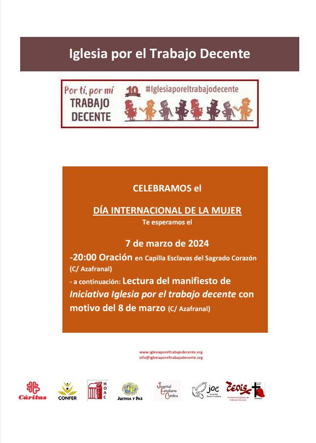 El próximo 8 de marzo se conmemora el Día Internacional de la Mujer Trabajadora. Con este motivo, las entidades y movimientos que componen la plataforma Iglesia por el Trabajo Decente en Salamanca (ITD), ha convocado una oración el 7 de marzo, en la iglesia de las Esclavas del Sagrado Corazón, en la calle Azafranal. La oración se iniciará a las 20:00 horas, y al concluir se animará a participar en el exterior en una concentración en la que se hará lectura del manifiesto preparado por esta plataforma eclesial.