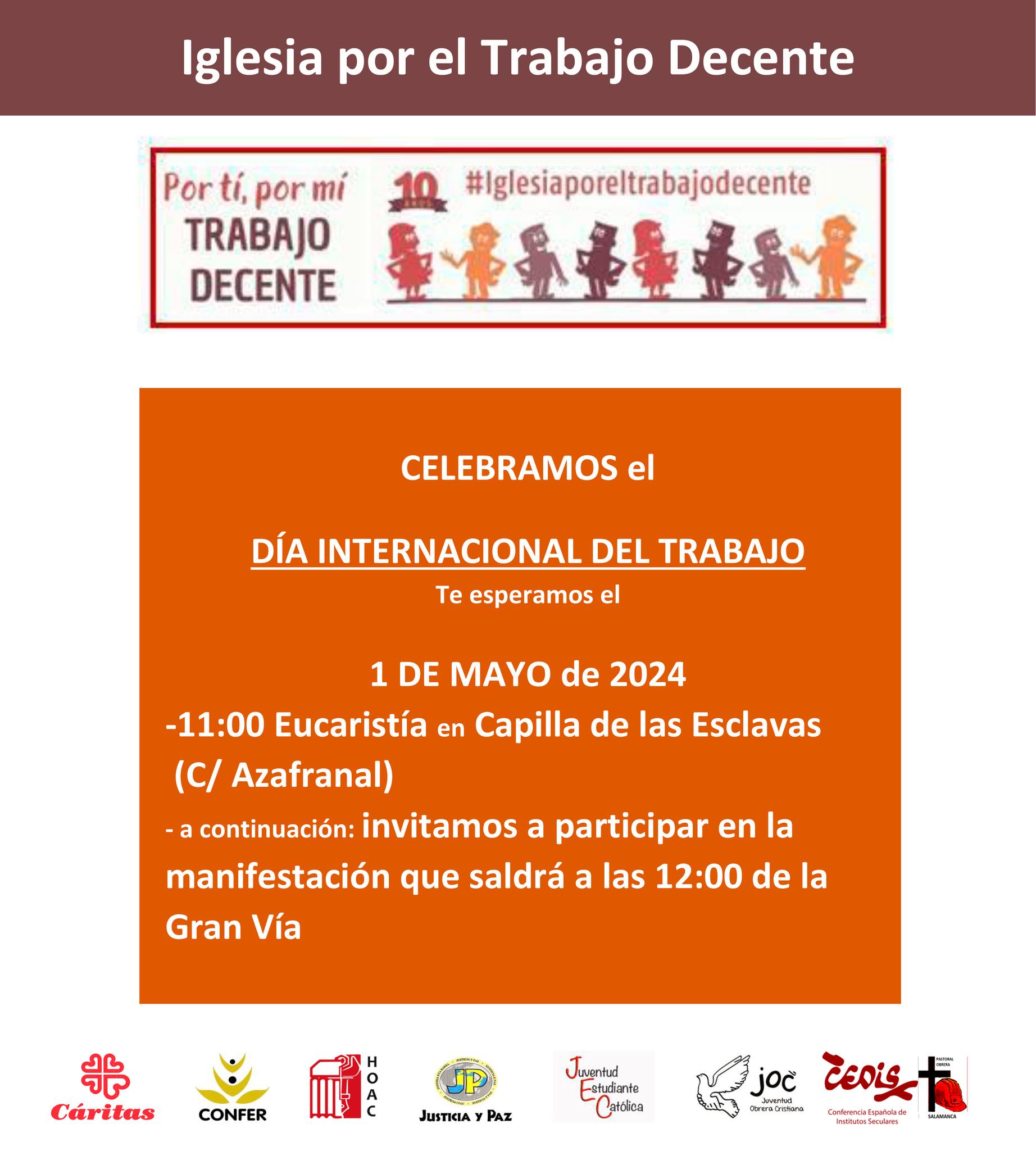 El próximo 1 de mayo, coincidiendo con la festividad de San José Obrero, se conmemora el Día Internacional del Trabajo. Ese día, la plataforma salmantina de Iglesia por el Trabajo Decente (ITD), que integran Cáritas diocesana, CONFER, la Hermandad Obrera de Acción Católica (HOAC), CEDIS, Justicia y Paz, la Juventud Estudiante Católica (JEC) y Pastoral Obrera, invita a la comunidad diocesana a participar en la celebración diocesana del 1º de Mayo, que tendrá lugar en la capilla de las Esclavas del Sagrado Corazón (C/Azafranal), a las 11:00 horas. La Misa será presidida por el obispo de Salamanca, Mons. José Luis Retana. Al terminar, se animará a los fieles a sumarse en la manifestación que tradicionalmente se lleva a cabo ese día en Salamanca, partiendo desde la Gran Vía, con el propósito de reivindicar la dignidad de las personas y abogar una cultura del cuidado en el mundo laboral.