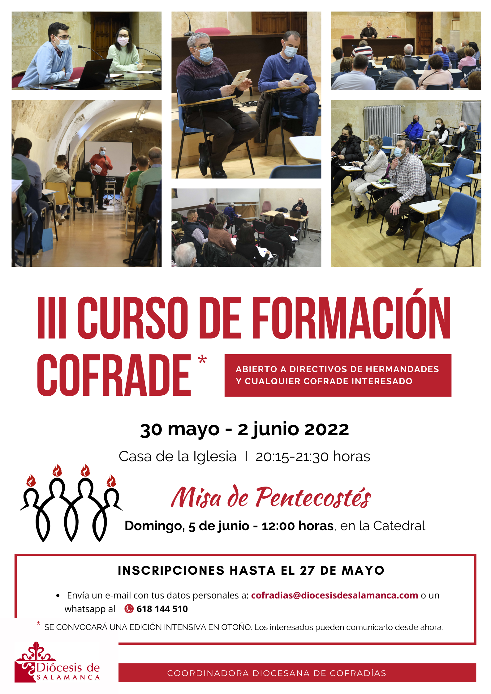 Para participar en este III Curso de Formación Cofrade es necesario inscribirse previamente, antes del 27 de mayo, remitiendo un correo electrónico o un whatsapp, con los datos personales a: cofradias@diocesisdesalamanca.com, o al teléfono 618 144 510 (Tomás González, miembro del equipo de la Coordinadora).