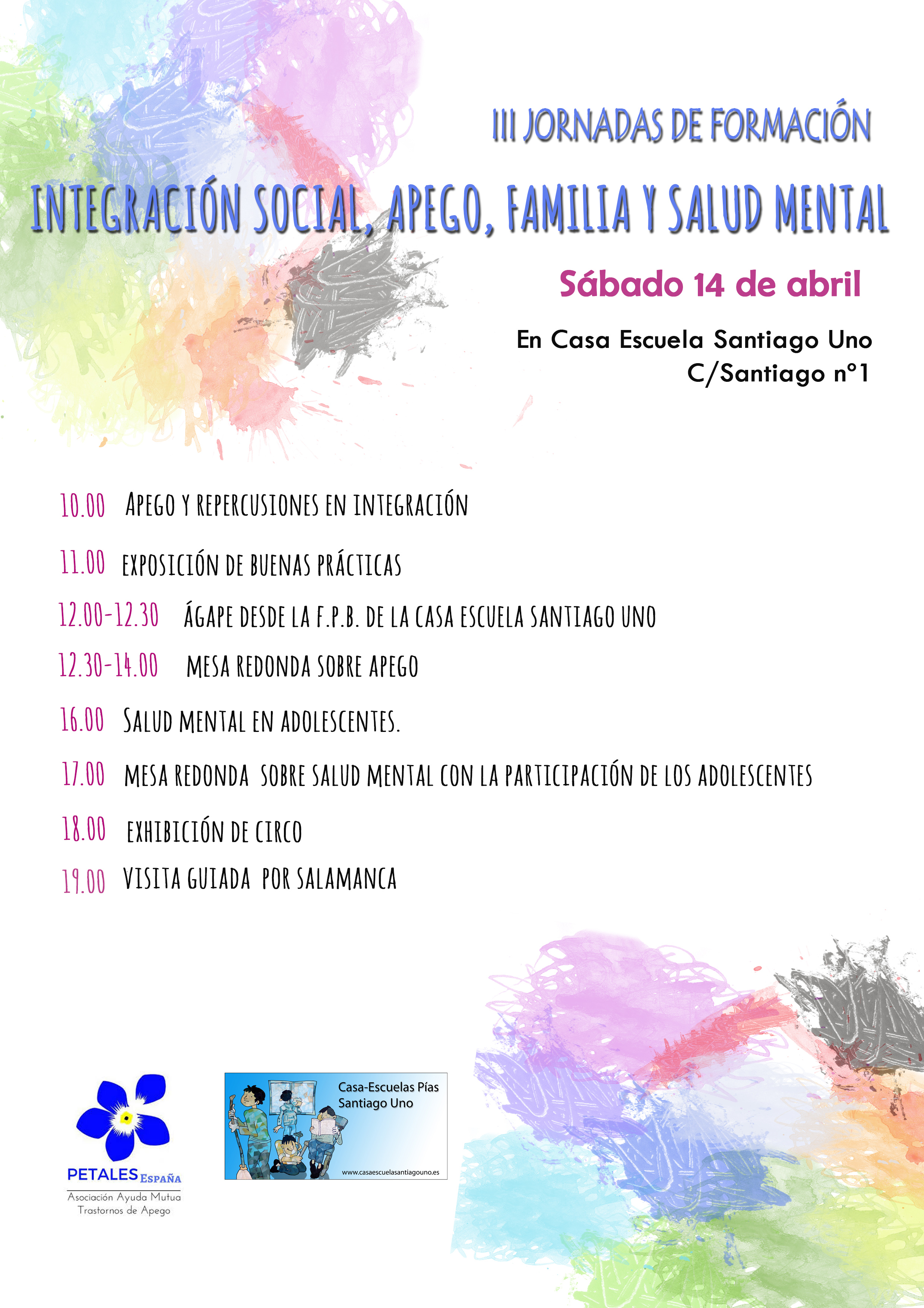 La Casa Escuela Santiago Uno acoge este próximo sábado, 14 de abril, la III Jornada práctica de formación “Integración social, apego, familia y salud mental”, una jornada abierta organizada junto con la Asociación Pétales, una asociación de ayuda y apoyo para padres y familiares y personas que presentan trastornos del vínculo afectivo o apego.