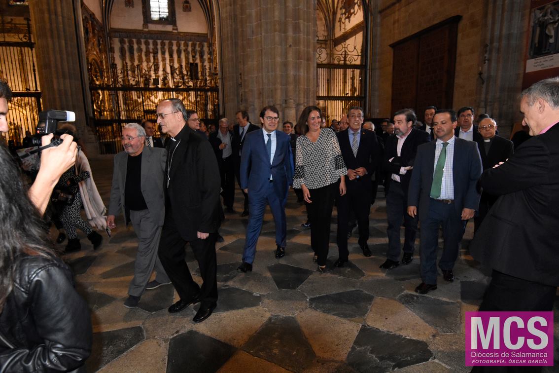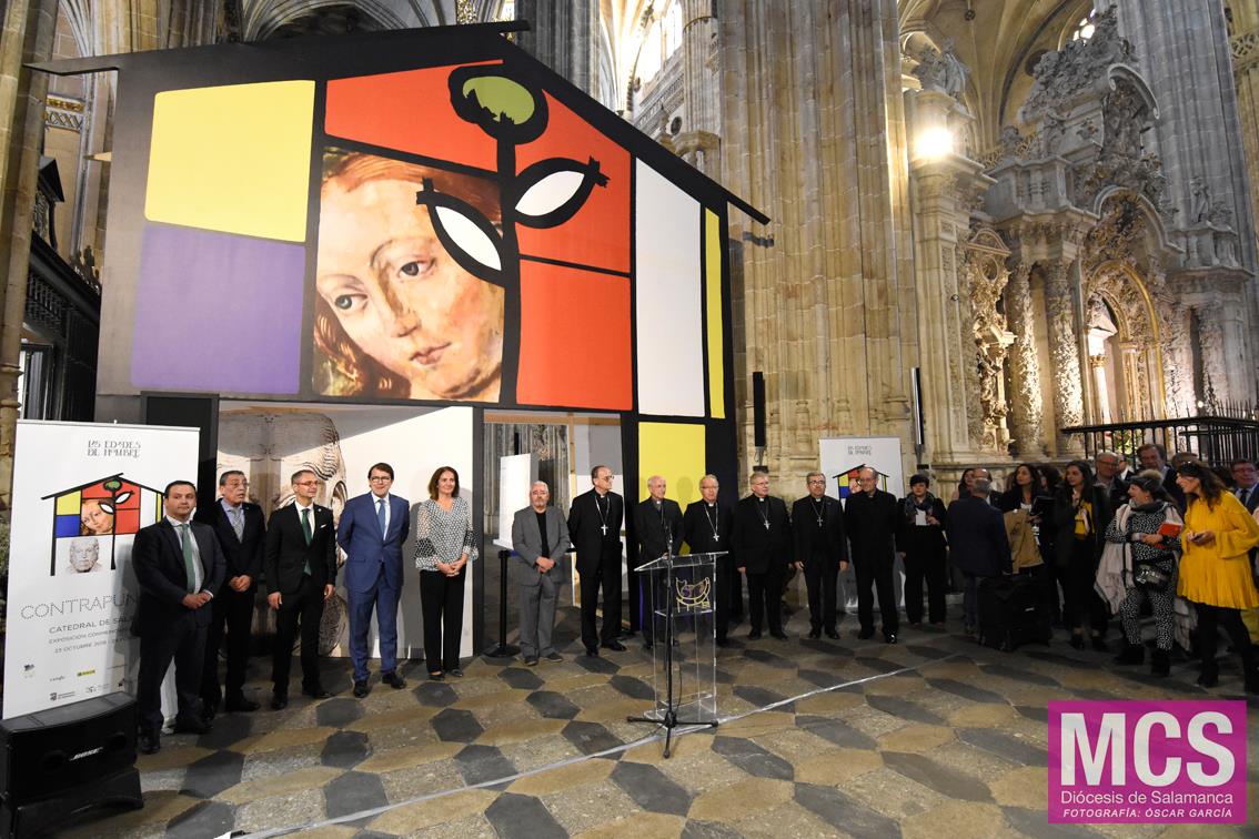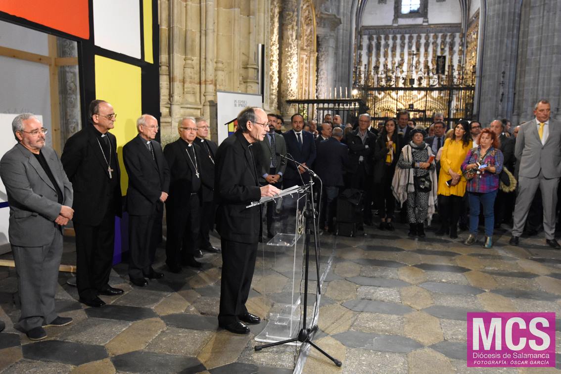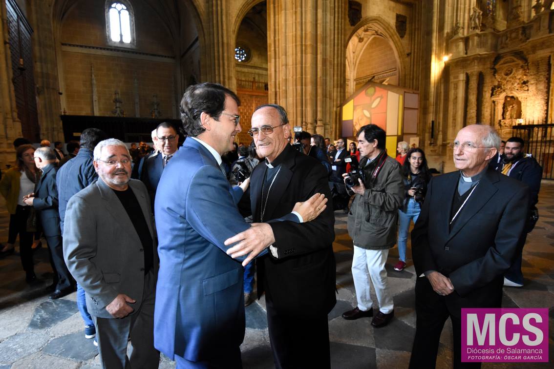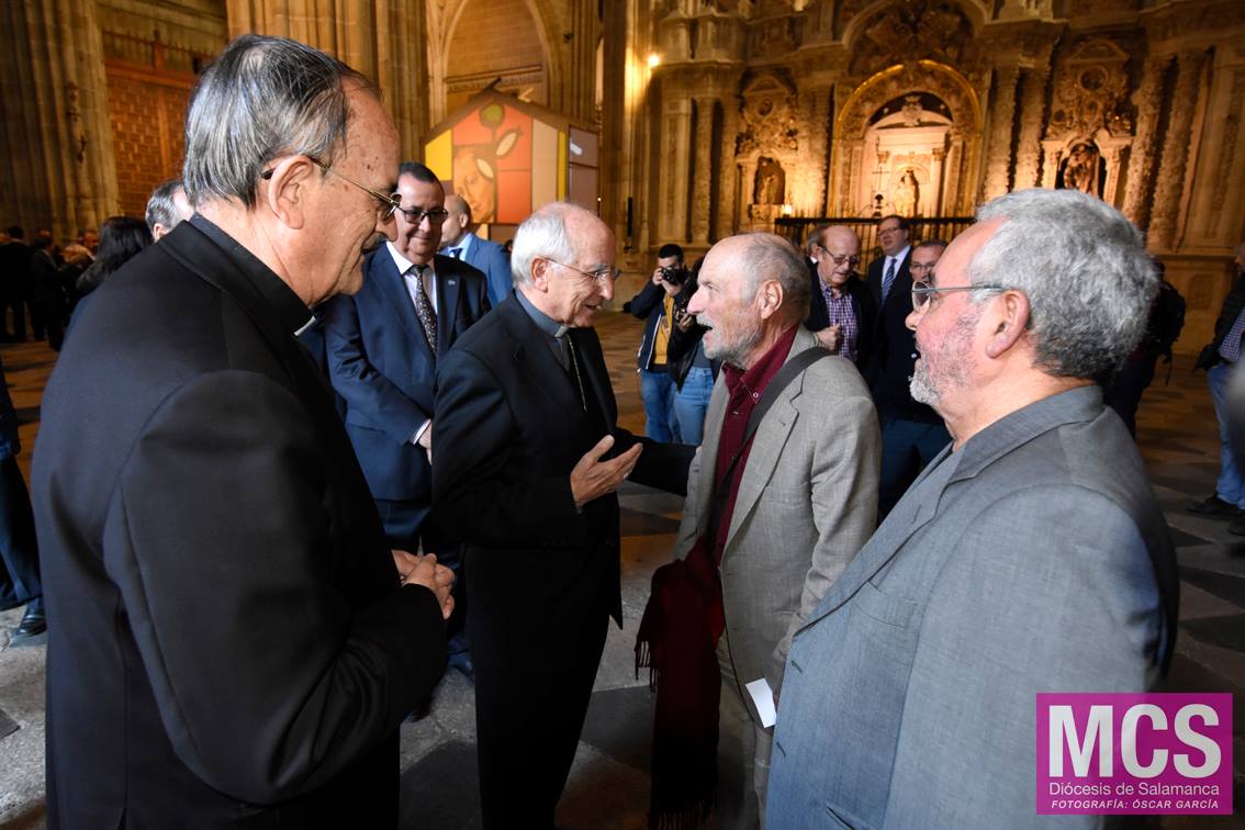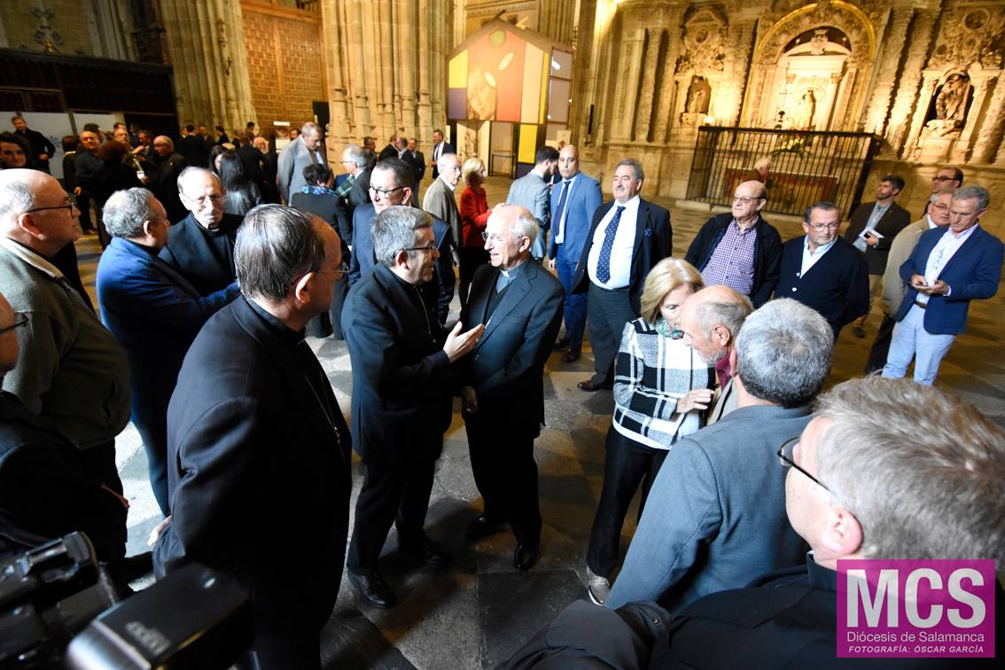 La Catedral Nueva de Salamanca ha acogido esta tarde el acto de inauguración de la exposición Contrapunto 2.0, una muestra conmemorativa de los 25 años de la mítica edición de Las Edades de 1993 en Salamanca ‘El contrapunto y su morada’. Además la Fundación Las Edades del Hombre celebra este año también el 30º aniversario del nacimiento de su proyecto (Valladolid, 1988), para revivir estas dos conmemoraciones y sumarse además al VIII Centenario de la Universidad de Salamanca ha presentado esta pequeña muestra ‘Contrapunto 2.0’ que vamos a poder disfrutar hasta el 24 de febrero de 2019. En el acto de inauguración se han dado cita numerosas autoridades eclesiásticas, del mundo de la cultura, la Universidad y la política, entre las que se encontraban nuestro Obispo Mons. Carlos López, el obispo de Ávila y presidente de la Fundación Las Edades Mons. Jesús G. Burillo, el obispo de Astorga Mons. Juan Antonio Menéndez, el de Zamora Mons. Gregorio Martínez y el obispo auxiliar de Valladolid Mons. Luis Argüello; los artistas Luciano Díaz-Castilla, Clara Gangutia y Antonio López; la consejera de Cultura y Turismo de la Junta de Castilla y León María Josefa García Cirac; el alcalde de Salamanca Alfonso Fernández Mañueco; el rector de la Universidad de Salamanca Ricardo Rivero; el delegado territorial de la Junta de Castilla y León en Salamanca Bienvenido Mena; Adolfo Domínguez, jefe del Servicio Territorial de Cultura de la Junta de Castilla y León en Salamanca y el excalde de Salamanca, Jesús Málaga, entre otros.