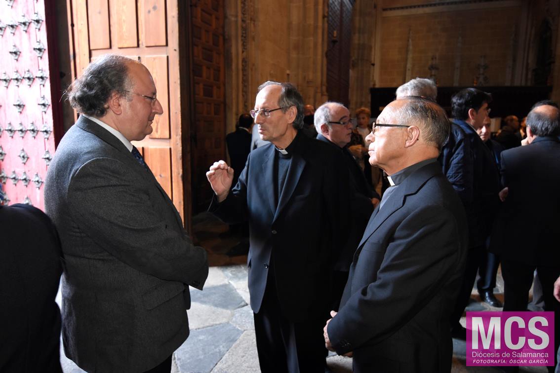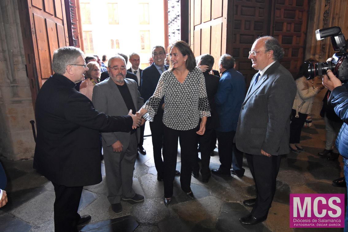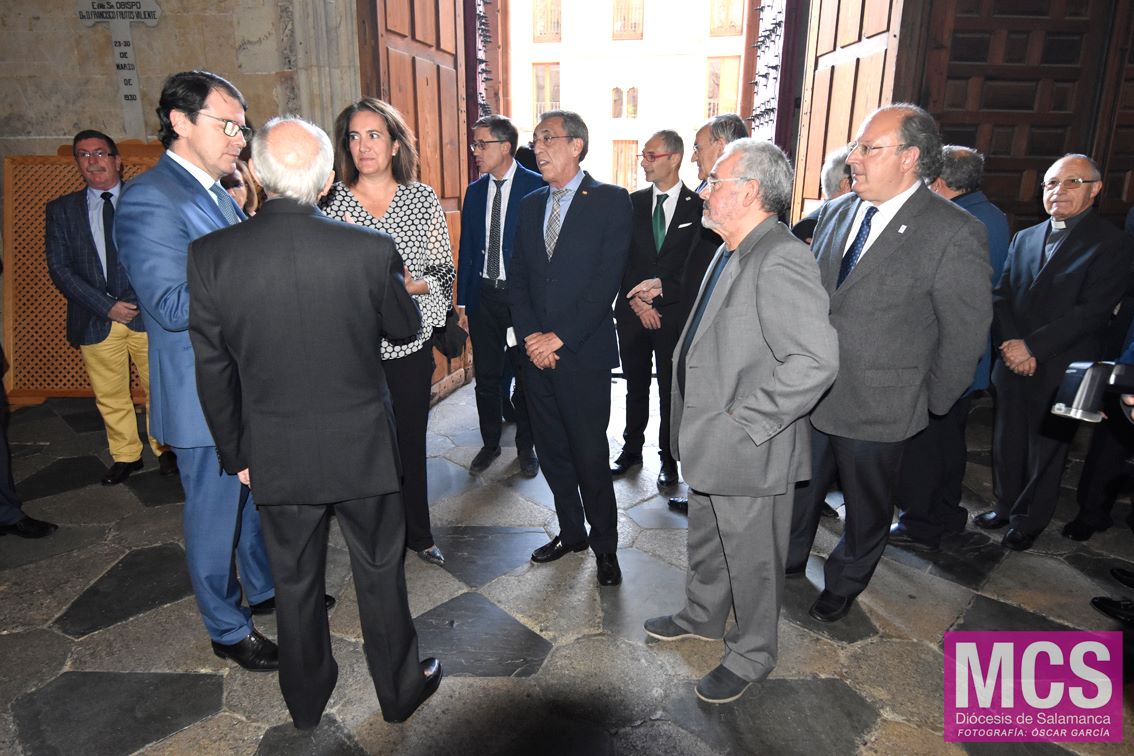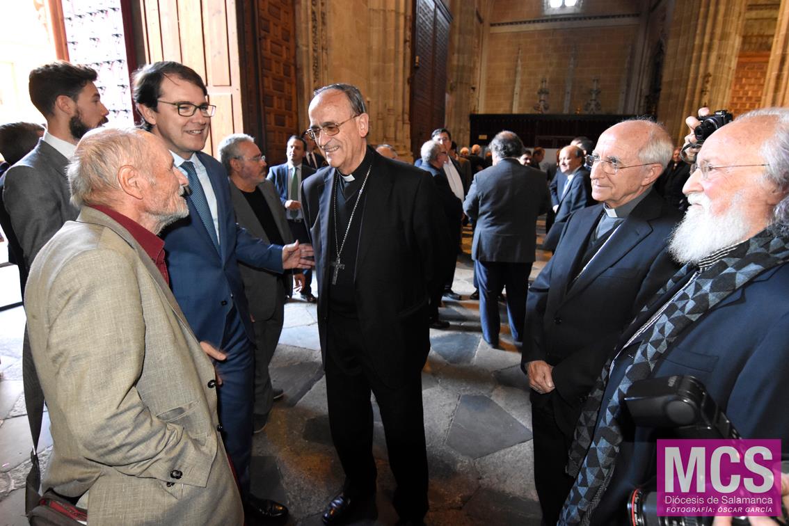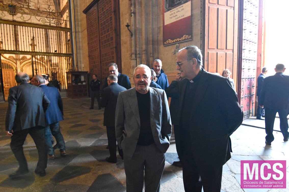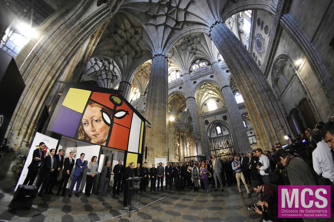 La Catedral Nueva de Salamanca ha acogido esta tarde el acto de inauguración de la exposición Contrapunto 2.0, una muestra conmemorativa de los 25 años de la mítica edición de Las Edades de 1993 en Salamanca ‘El contrapunto y su morada’. Además la Fundación Las Edades del Hombre celebra este año también el 30º aniversario del nacimiento de su proyecto (Valladolid, 1988), para revivir estas dos conmemoraciones y sumarse además al VIII Centenario de la Universidad de Salamanca ha presentado esta pequeña muestra ‘Contrapunto 2.0’ que vamos a poder disfrutar hasta el 24 de febrero de 2019. En el acto de inauguración se han dado cita numerosas autoridades eclesiásticas, del mundo de la cultura, la Universidad y la política, entre las que se encontraban nuestro Obispo Mons. Carlos López, el obispo de Ávila y presidente de la Fundación Las Edades Mons. Jesús G. Burillo, el obispo de Astorga Mons. Juan Antonio Menéndez, el de Zamora Mons. Gregorio Martínez y el obispo auxiliar de Valladolid Mons. Luis Argüello; los artistas Luciano Díaz-Castilla, Clara Gangutia y Antonio López; la consejera de Cultura y Turismo de la Junta de Castilla y León María Josefa García Cirac; el alcalde de Salamanca Alfonso Fernández Mañueco; el rector de la Universidad de Salamanca Ricardo Rivero; el delegado territorial de la Junta de Castilla y León en Salamanca Bienvenido Mena; Adolfo Domínguez, jefe del Servicio Territorial de Cultura de la Junta de Castilla y León en Salamanca y el excalde de Salamanca, Jesús Málaga, entre otros.