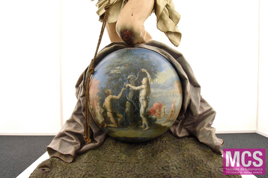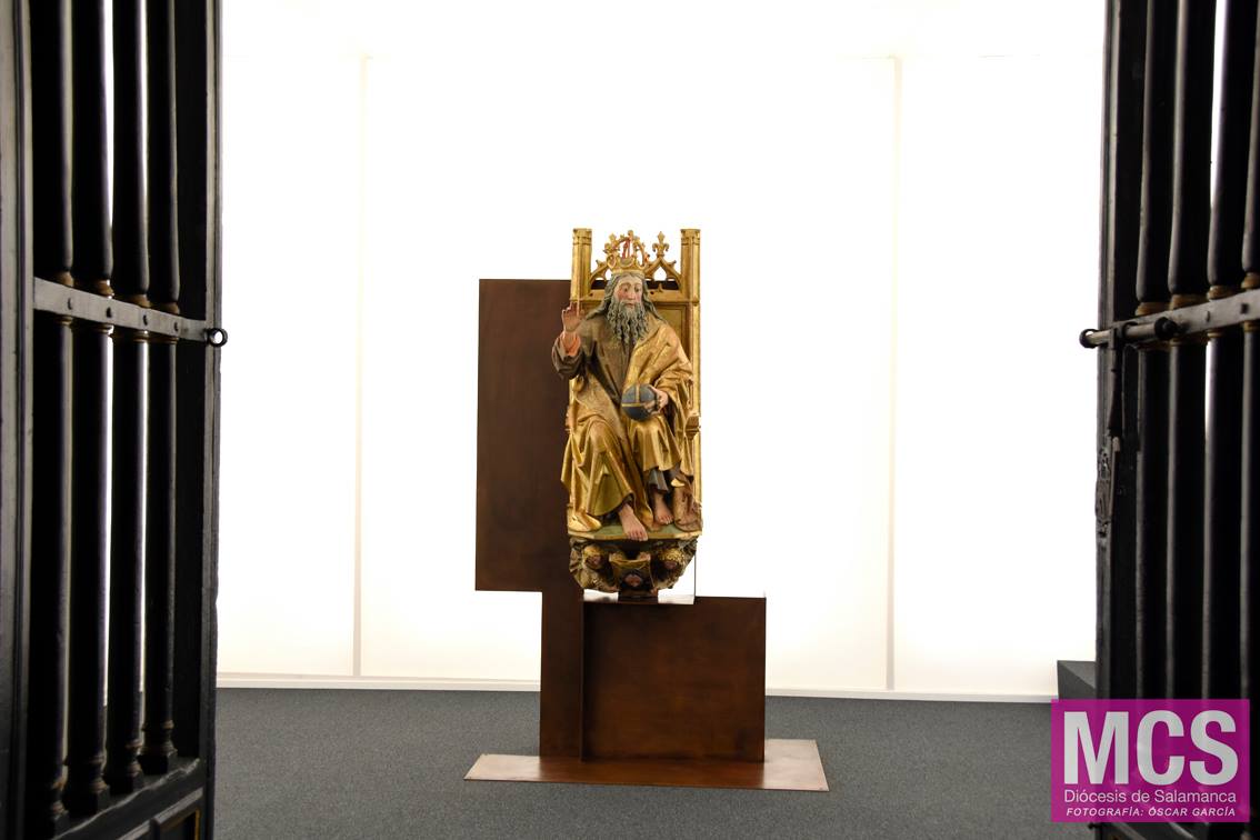 El itinerario expositivo comienza al traspasar la gran puerta confeccionada con la imagen del cartel de la exposición homenaje al diseño que realizó hace 25 años Adolfo Calleja para “El Contrapunto y su morada”. Un cartel actualizado en el que se muestran los rostros de Zacarías, obra anónima del S.XII procedente de la iglesia de San Juan Bautista de Arévalo (Ávila) y de Eva, un detalle de la obra del Maestro de Fromista del 1485 de la iglesia de san Pedro de dicha localidad palentina, ambas obras están presentes en la exposición. La primera obra que podemos contemplar es la magnífica talla de madera policromada el ‘Padre Eterno’, de Alejo Vahía (S.XV). A continuación la ‘Tentación de Adan y Eva’ del Maestro Antonio; las esculturas en bronce de ‘Adán-nada y Eva-Ave’ de Juan Bordes (1986); y ‘El paraíso perdido’ de José Luis Alonso Coomonte (2003). El segundo apartado está representado por los lienzos ‘David y Salomón (hacia 1490) de Pedro Berruguete; ‘Roboam, rey de Judá’ (2018) de Daniel Quintero y las esculturas de ‘Zacarías’ (S.XII. anónimo) y ‘El profeta’ (1933), de Pablo Gargallo. El tercer momento lo integran las obras ‘Arcángel Gabriel y María Anunciada’ (S.XIV. Anónimo); ‘La Anunciación’ (2018) de Luis Mayo; ‘Adoración de los Magos (1537-1538) de Alonso Berruguete; ‘La Adoración de los Reyes Magos’ (2018) de Eduardo Palacios; ‘La Virgen de la Majestad’ (s.XII. Anónimo) y la ‘Virgen de Igartza’ (2011) de Clara Gangutia.