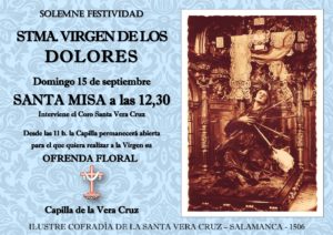 Por otra parte, esta cofradía también celebra la festividad de la Santísima Virgen de los Dolores, el 15 de septiembre, con una santa misa a las 12:30 horas. Además, desde las once de la mañana hasta las dos de la tarde, la capilla de la Vera Cruz permanecerá abierta para que todo el que quiera pueda dejar su ofrenda floral ante la imagen de la Virgen de los Dolores.