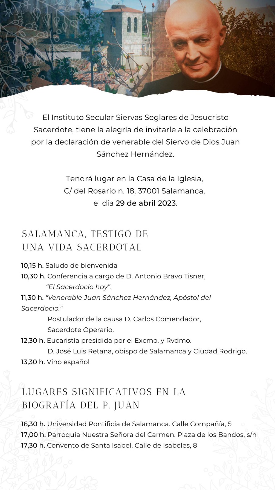 El 5 de agosto de 2022, el papa Francisco aprobaba la promulgación del decreto que reconoce las “virtudes heroicas” del siervo de Dios, Juan Sánchez Hernández (1902-1975), sacerdote Operario diocesano y fundador del Instituto Secular Siervas Seglares de Jesucristo Sacerdote; declarándolo venerable. Avanza así su proceso de canonización, cuya fase diocesana se inició en Madrid el 13 de mayo de 2000.