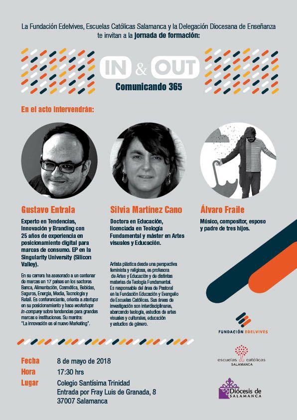 La Fundación Edelvives junto a Escuelas Católicas Salamanca y la Delegación diocesana de Enseñanza han organizado la jornada formativa para el profesorado: “In&Out. Comunicando 365″. El encuentro tendrá lugar el martes 8 de mayo, a las 17.30 horas, en el salón de actos del Colegio Santísima Trinidad de Salamanca y contará con las intervenciones de Gustavo Entrala, experto en tendencias, innovación y posicionamiento digital, creador de la cuenta oficial en Twitter del Papa; Silvia Martínez Cano, artista plástica y teóloga, responsable del área de Pastoral en la Fundación Educación y Evangelio de Escuelas Católicas; y el cantautor Álvaro Fraile.