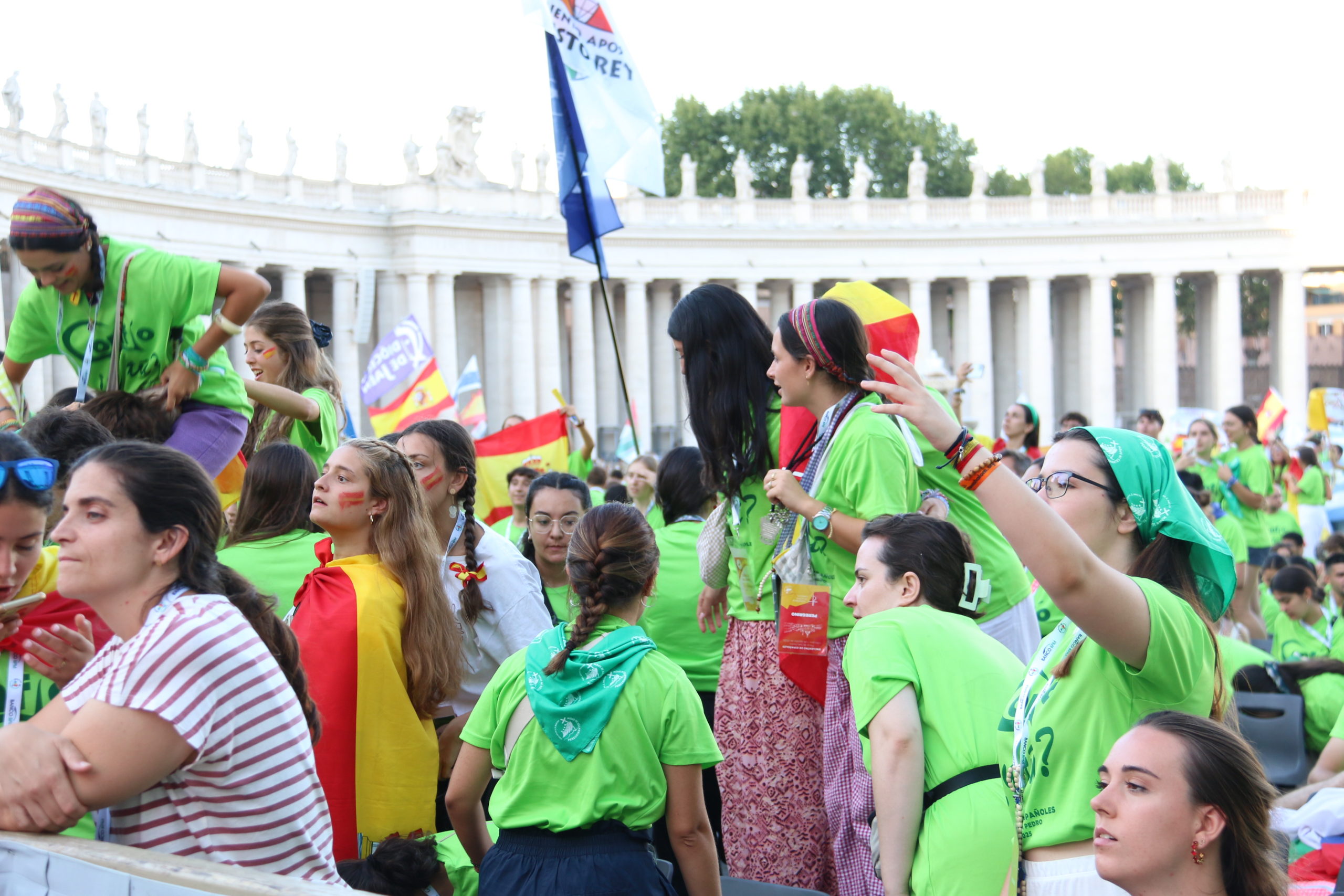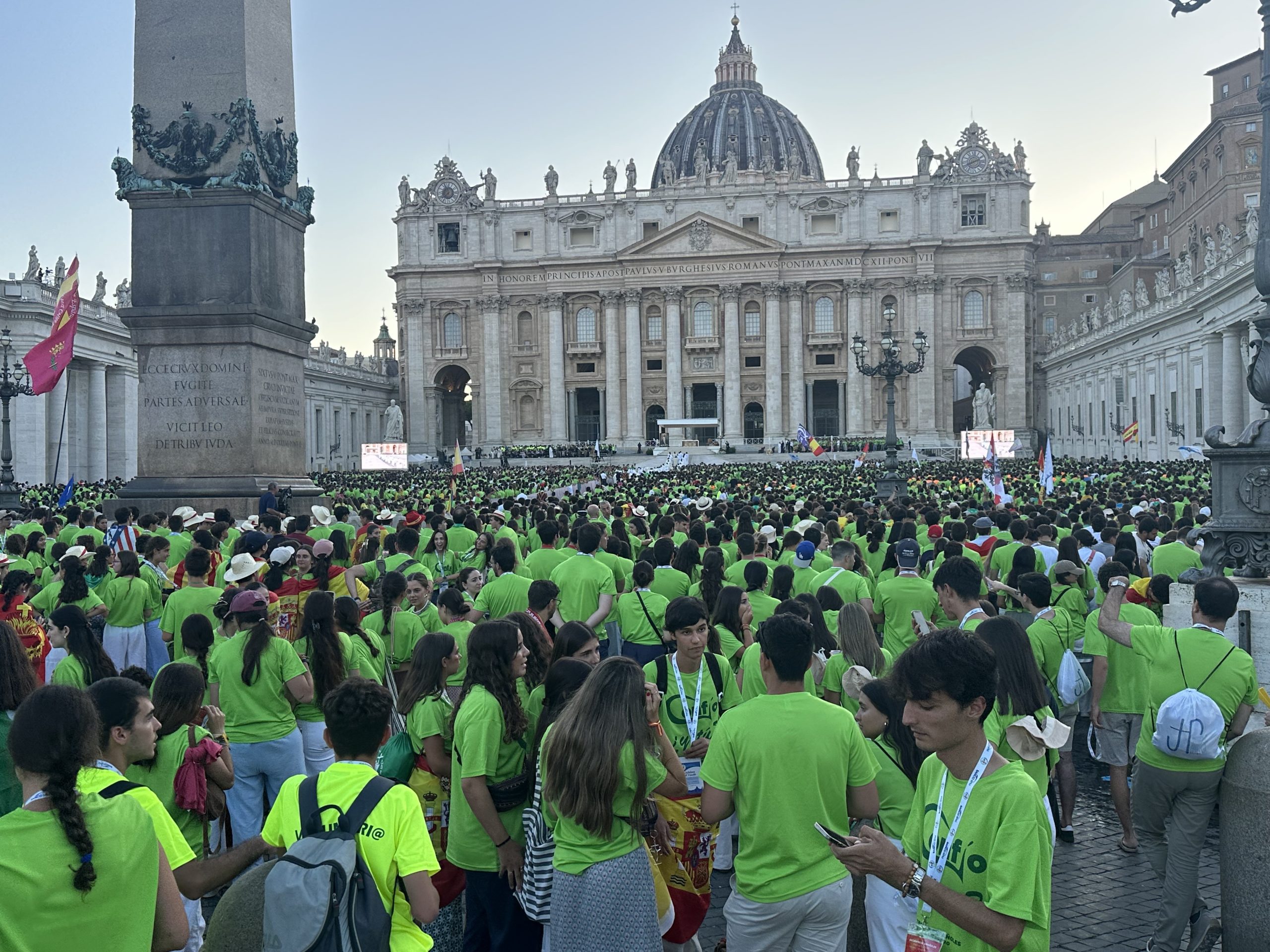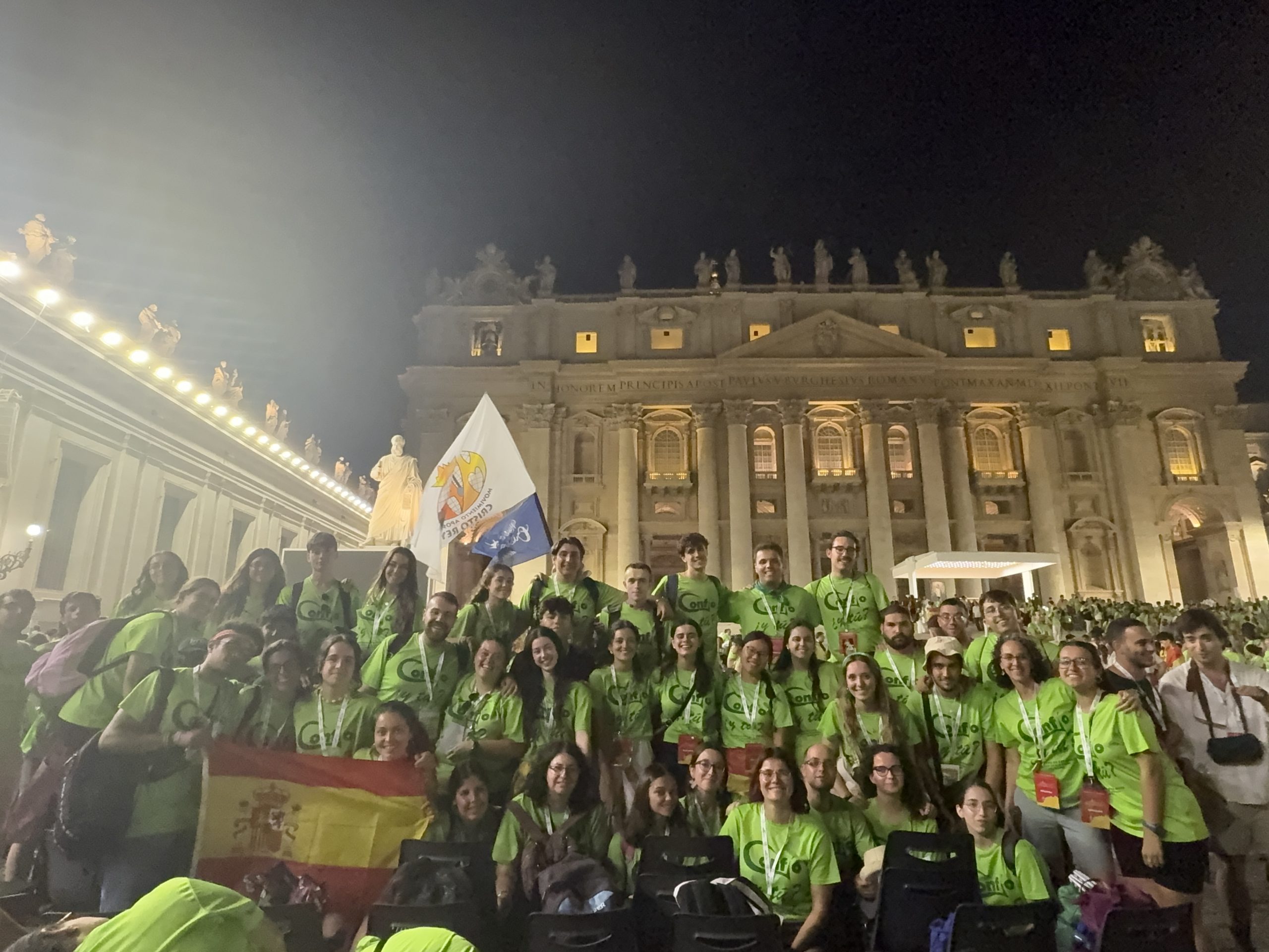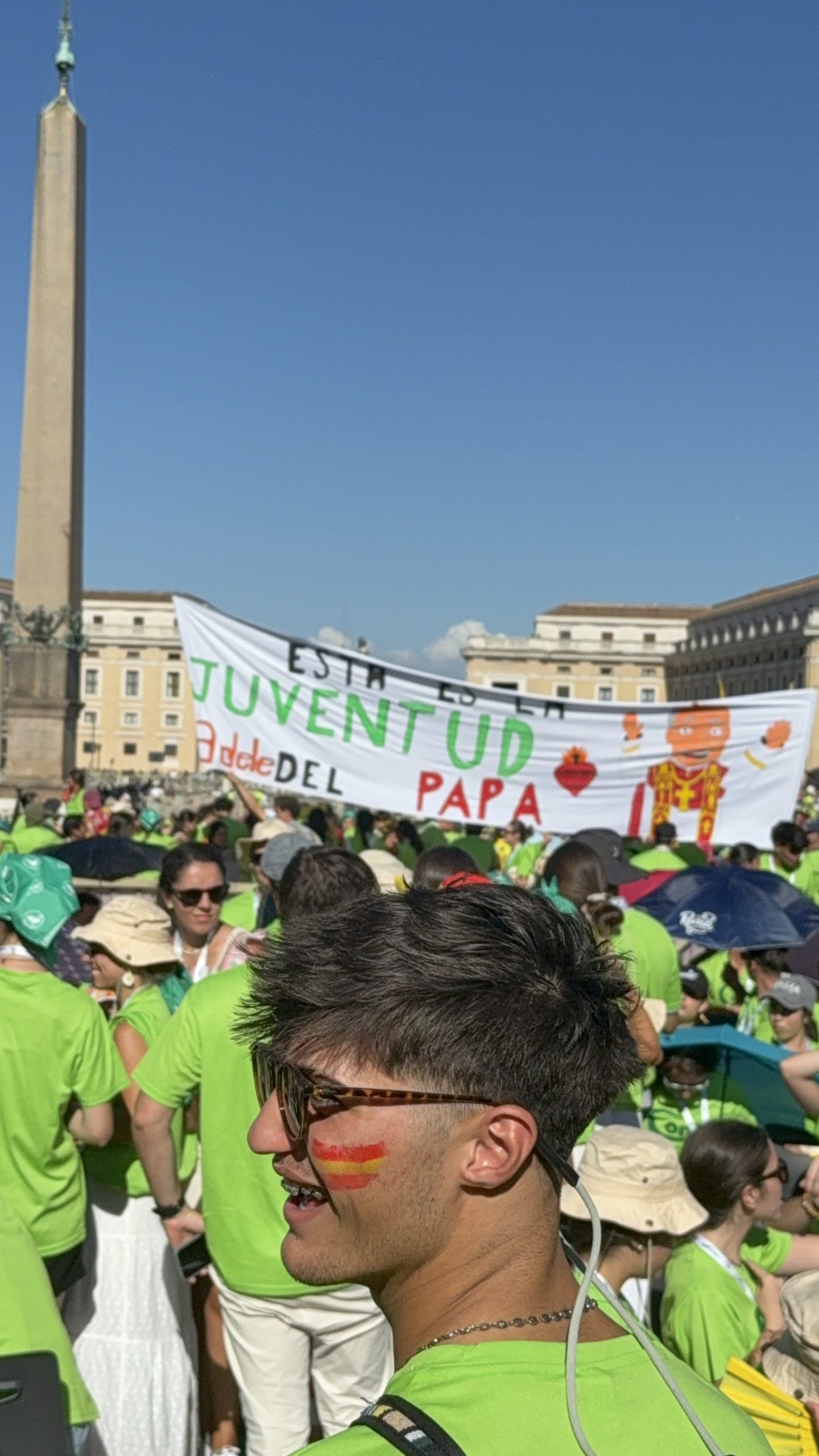 Por la tarde, los jóvenes participaron en el Encuentro de Españoles, que reunió a más de 30.000 personas procedentes de diócesis, movimientos y congregaciones de todo el país. Todos vestían la camiseta verde esperanza con el lema: “Confío, ¿y tú?”, llenando de un solo color la Plaza de San Pedro.