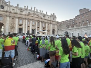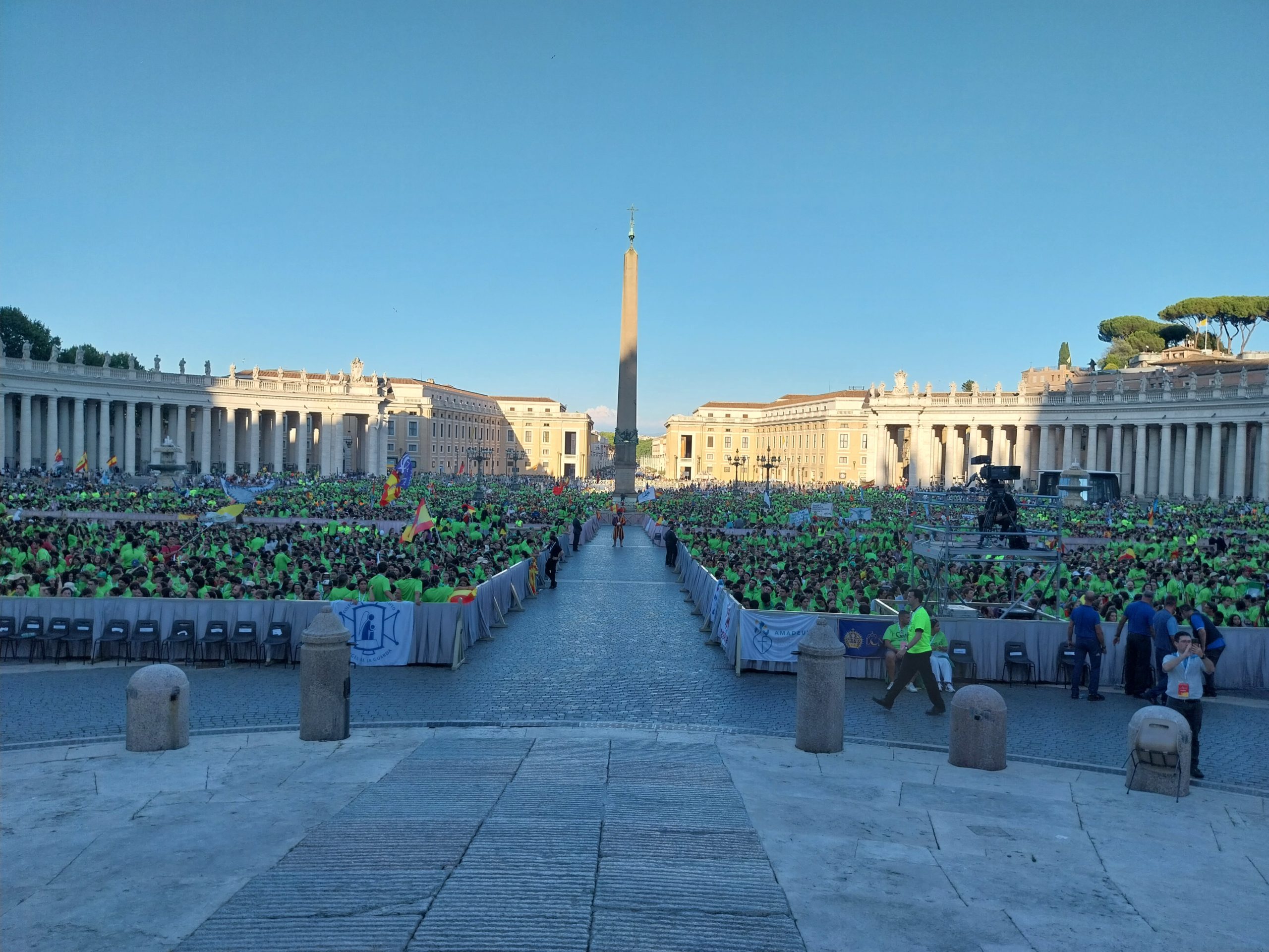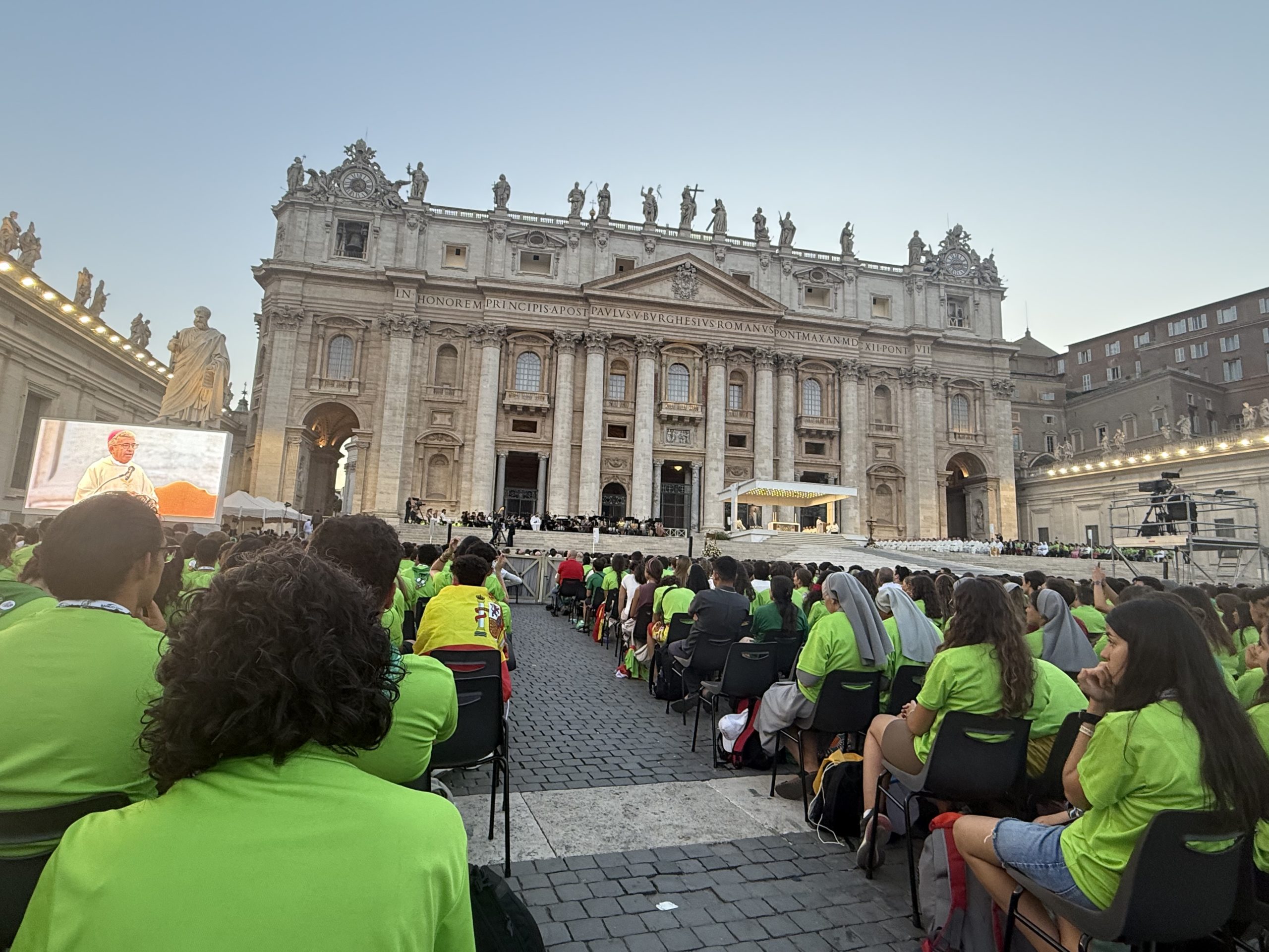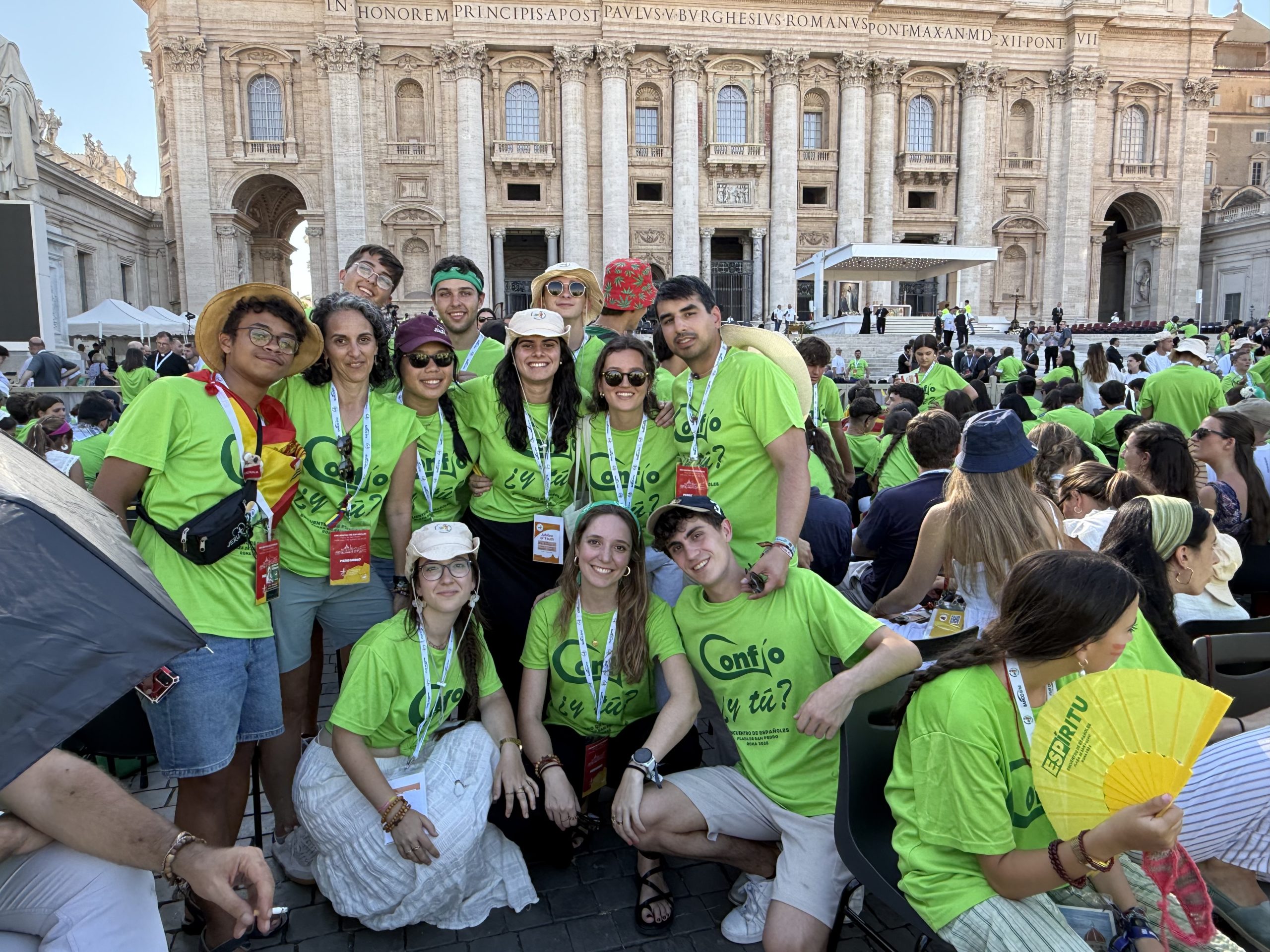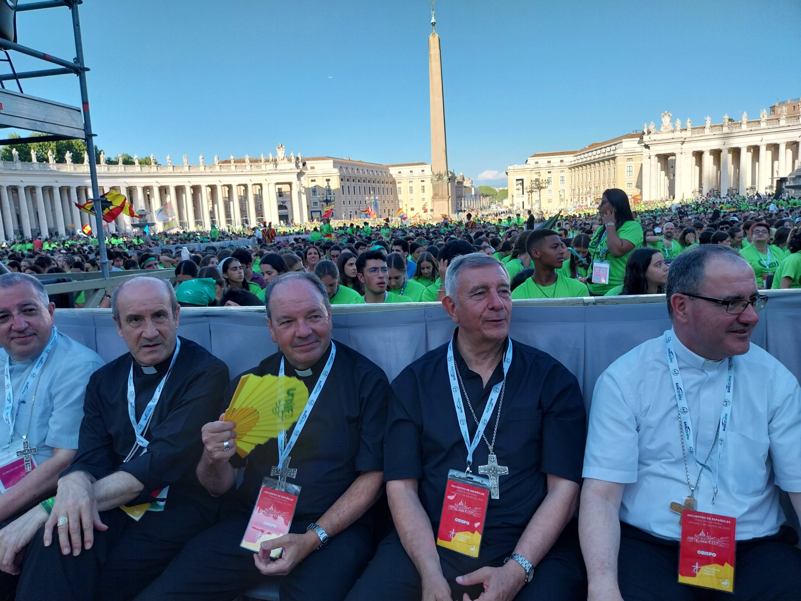 Por la tarde, los jóvenes participaron en el Encuentro de Españoles, que reunió a más de 30.000 personas procedentes de diócesis, movimientos y congregaciones de todo el país. Todos vestían la camiseta verde esperanza con el lema: “Confío, ¿y tú?”, llenando de un solo color la Plaza de San Pedro.