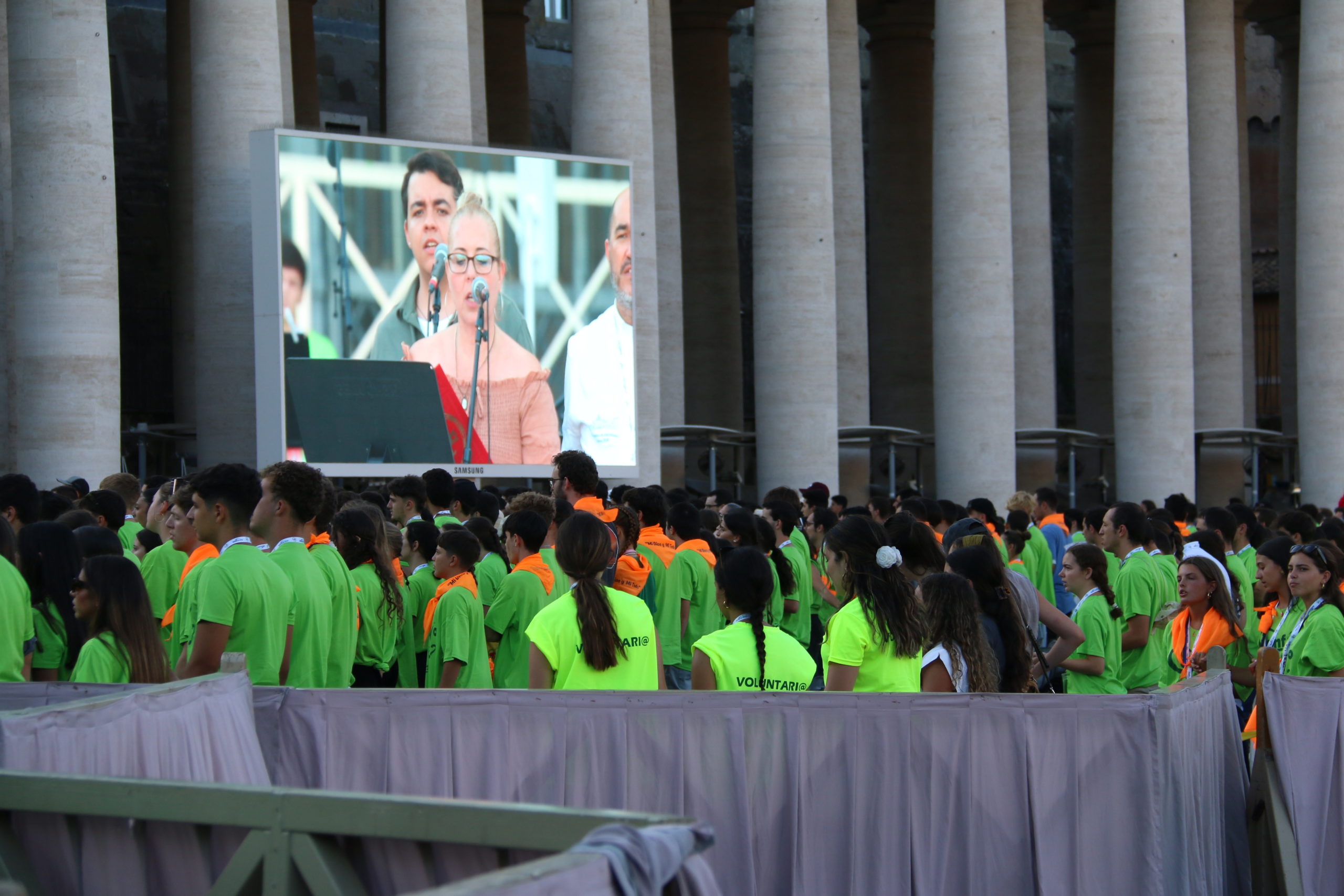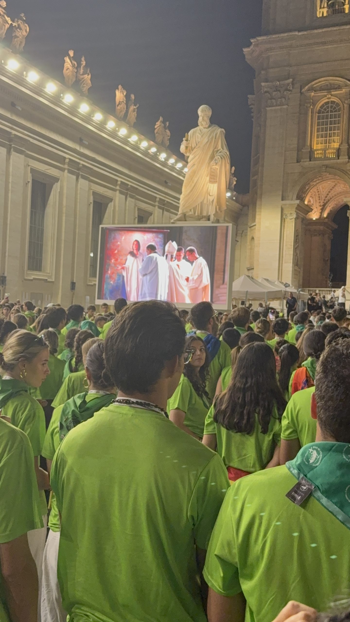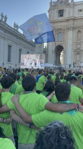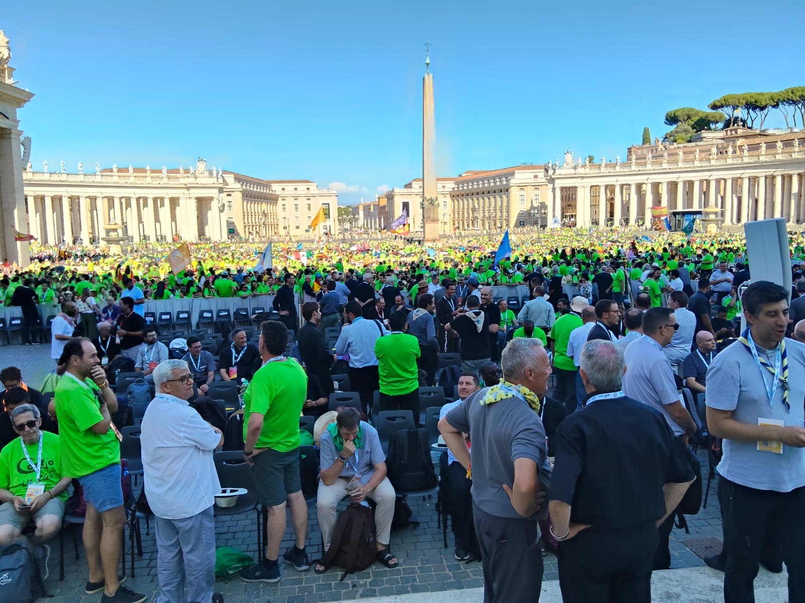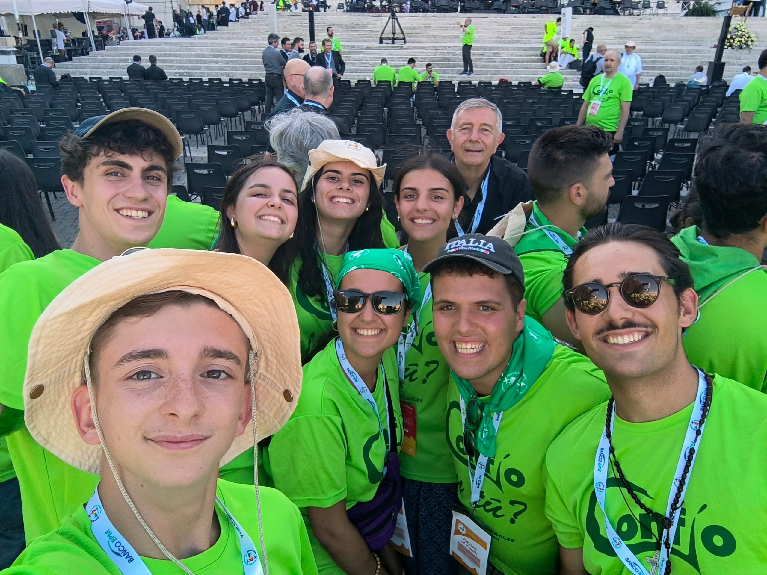 Por la tarde, los jóvenes participaron en el Encuentro de Españoles, que reunió a más de 30.000 personas procedentes de diócesis, movimientos y congregaciones de todo el país. Todos vestían la camiseta verde esperanza con el lema: “Confío, ¿y tú?”, llenando de un solo color la Plaza de San Pedro.