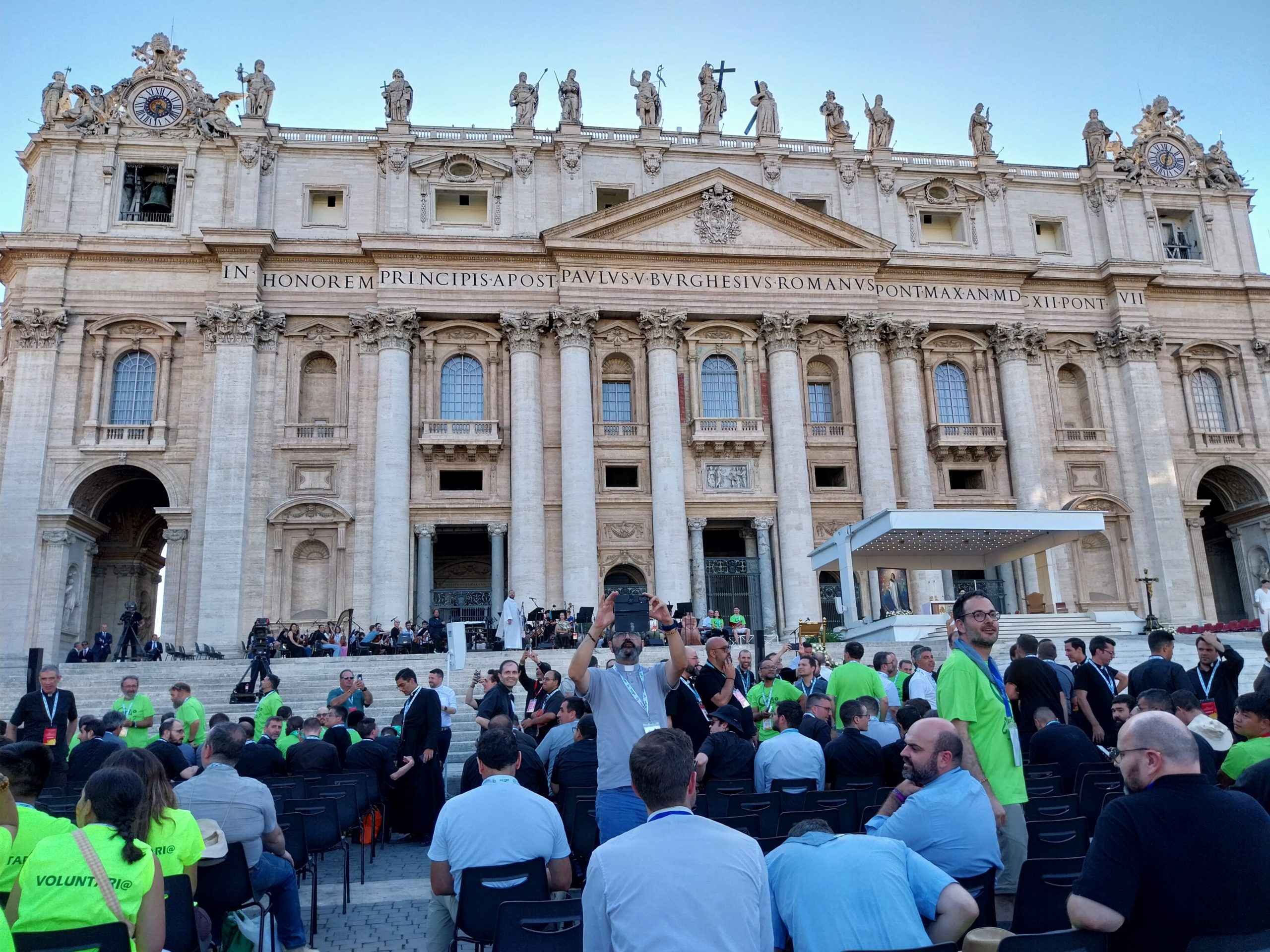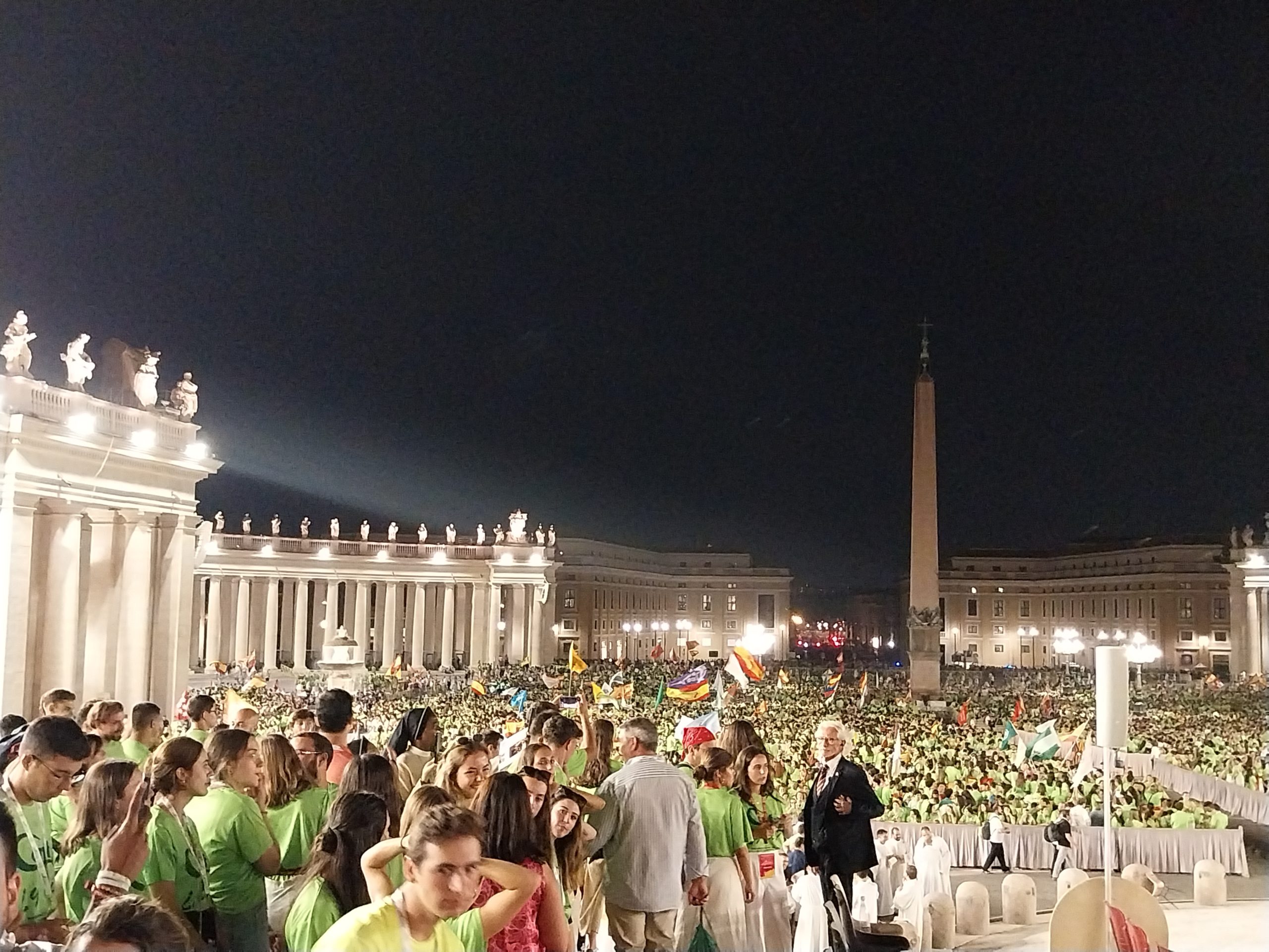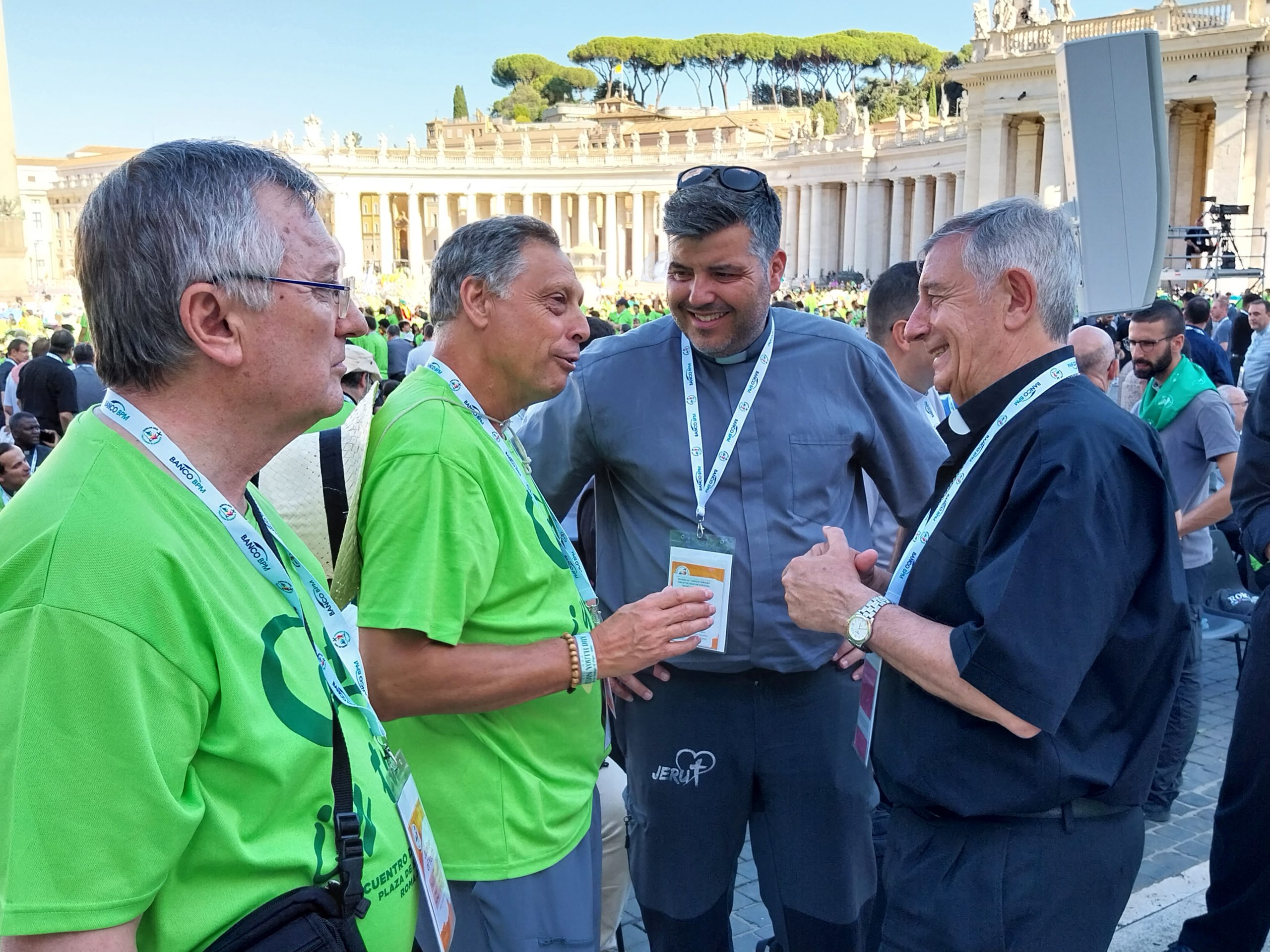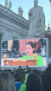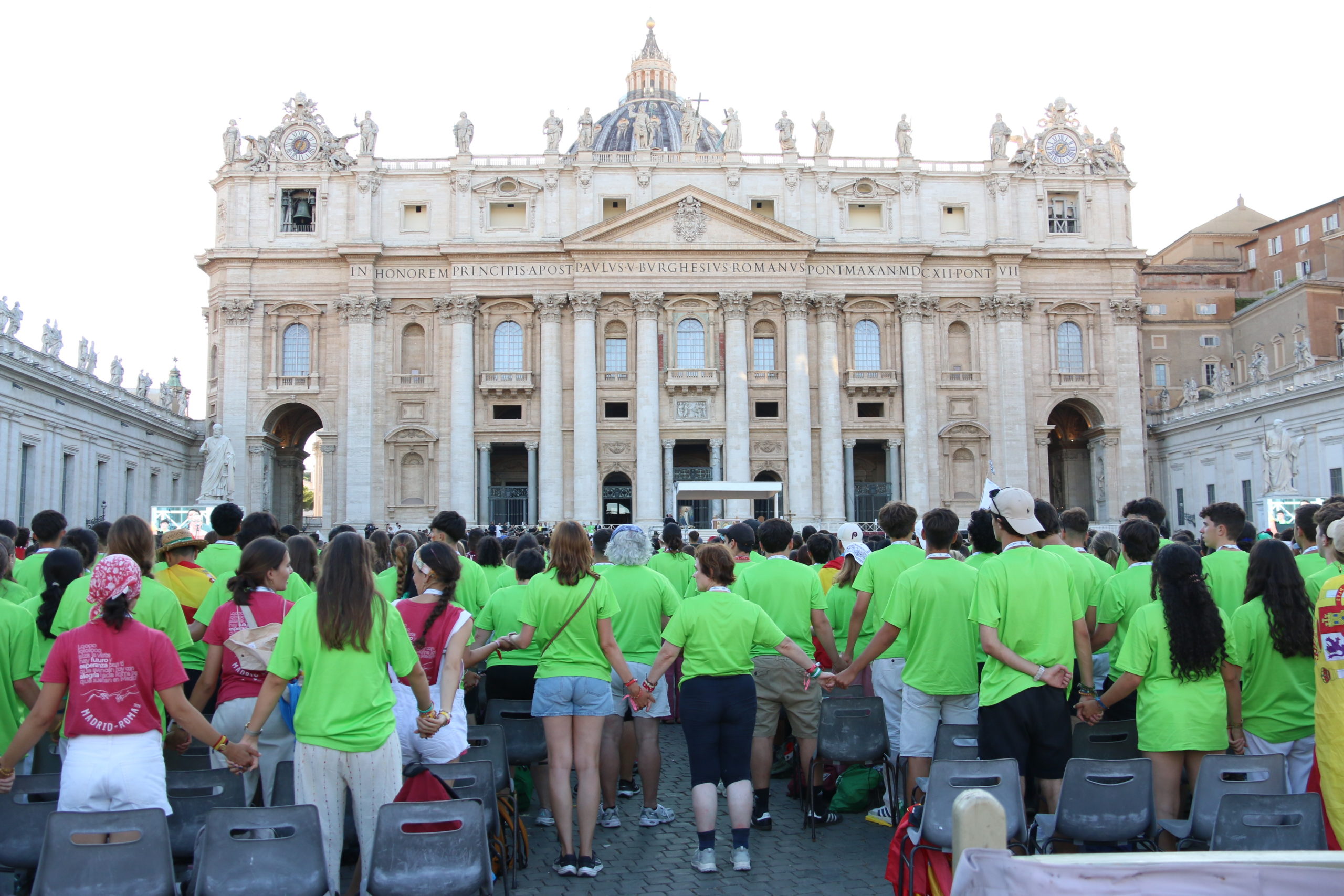 Por la tarde, los jóvenes participaron en el Encuentro de Españoles, que reunió a más de 30.000 personas procedentes de diócesis, movimientos y congregaciones de todo el país. Todos vestían la camiseta verde esperanza con el lema: “Confío, ¿y tú?”, llenando de un solo color la Plaza de San Pedro.