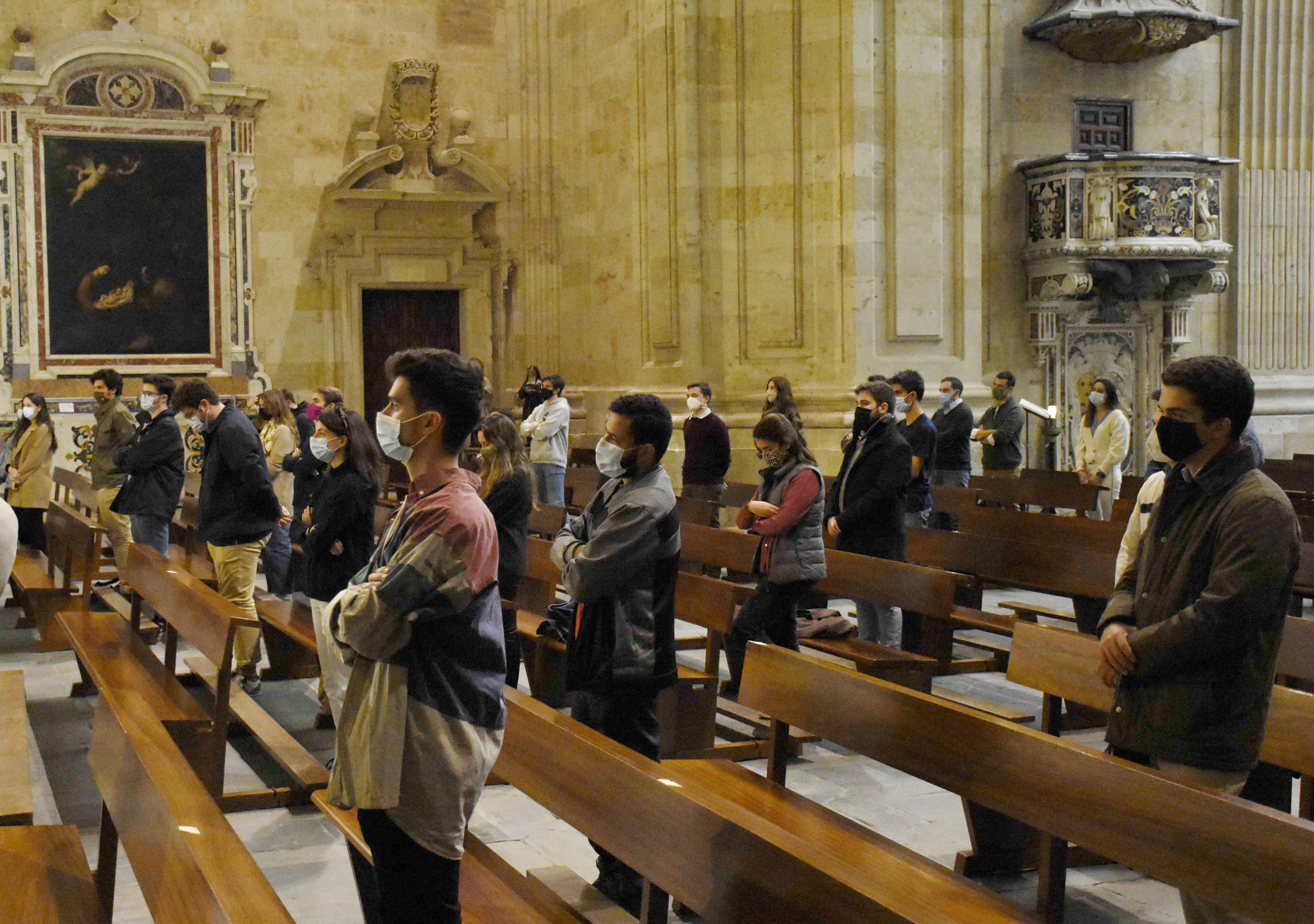 Con motivo de las restricciones y la limitación de aforo por la pandemia, la misa para los universitarios se ha trasladado de San Benito a La Purísima, donde se celebrará en las próximas semanas, y ante el toque de queda establecido por la Junta de Castilla y León para toda la comunidad, en lugar de las 21.00 horas será a las 20.00 de la tarde.