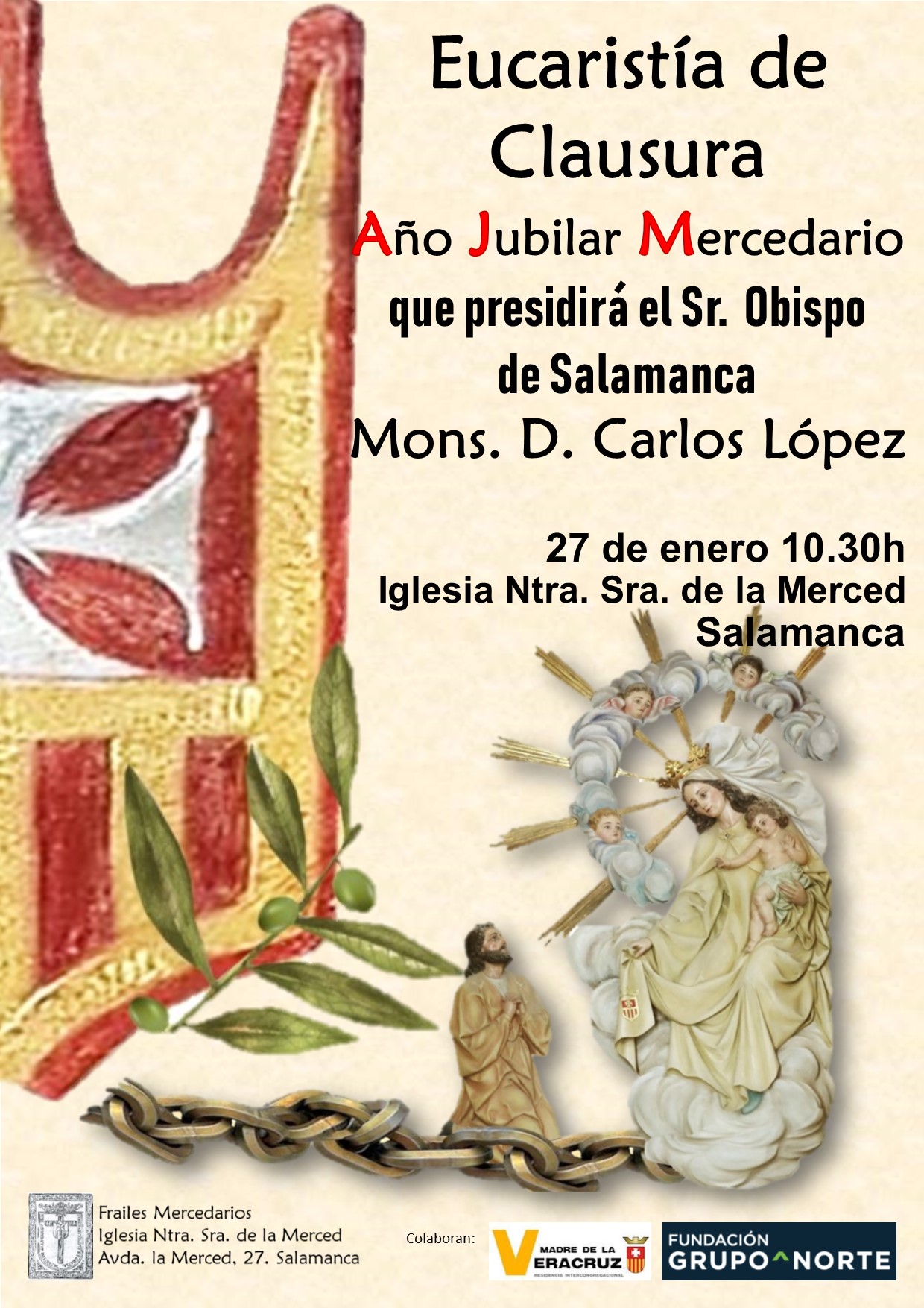 El domingo 27 de enero la comunidad mercedaria de Salamanca celebrará la clausura del Año Jubilar Mercedario en la iglesia Nuestra Señora de la Merced, sita en la Avenida de la Merced nº27, donde se congregarán para “unirse en acción de gracias a Dios por los dones recibidos”. El Obispo de Salamanca Mons. Carlos López presidiría la solemne eucaristía a las 10.30 de la mañana.