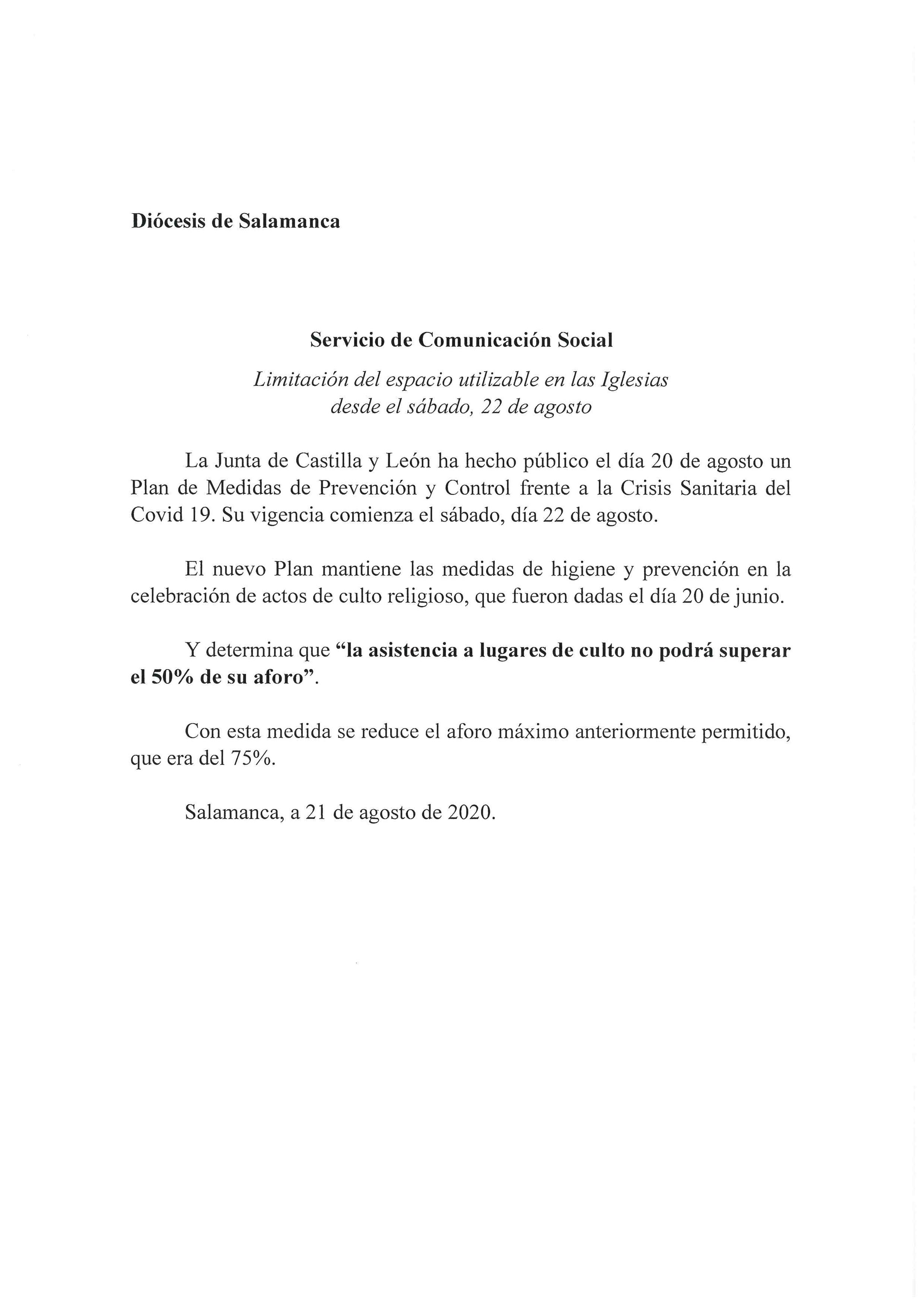 Desde la Diócesis de Salamanca se recuerda la nueva limitación del espacio disponible en las iglesias desde el sábado 22 de agosto, pasando del 75 al 50% del aforo. La Junta de Castilla y León ha hecho público el día 20 de agosto un Plan de Medidas de Prevención y Control frente a la crisis sanitaria del covid-19, cuya vigencia comienza el sábado, 22 de agosto.