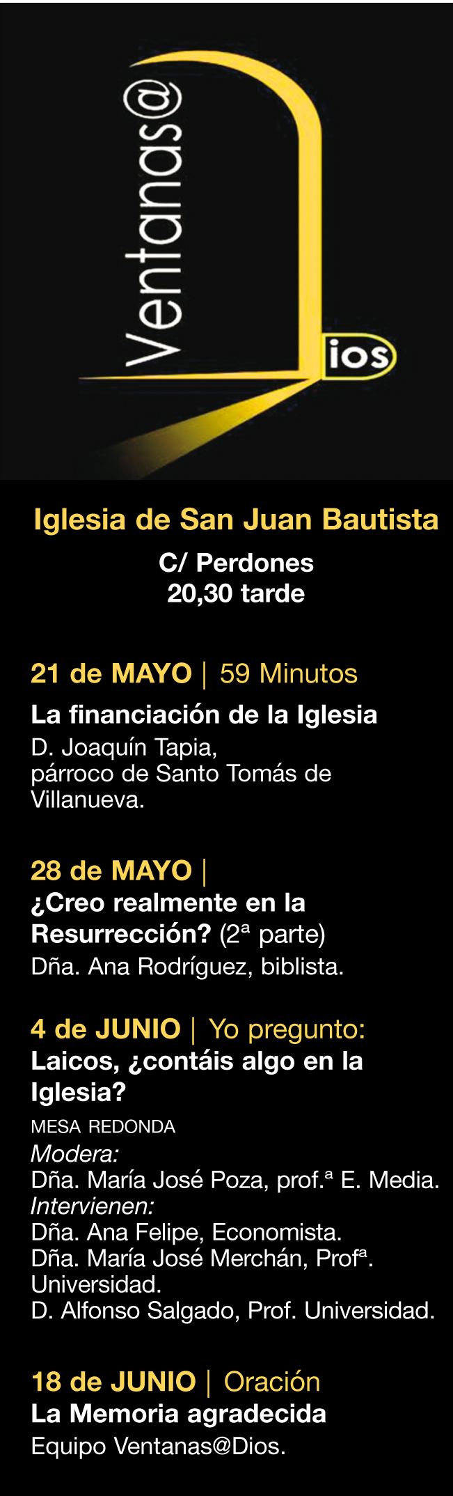 Las actividades de Ventanas@Dios, continuarán el lunes 4 de junio con una una mesa redonda en la que se va a abordar el tema: “Laicos, ¿contáis algo en la Iglesia?”, en la que van a intervenir: Ana Felipe, Economista, María José Merchán, Profesora de la Universidad de Salamanca y D. Alfonso Salgado, profesor de la Universidad Pontificia de Salamanca. La mesa estará moderada por María José Poza, profª. E. Media.
