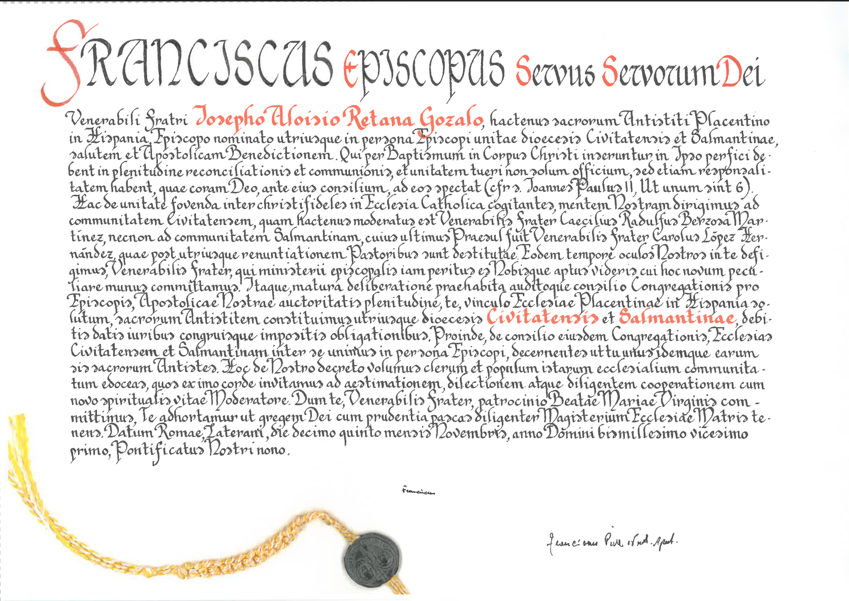 Al Venerable Hermano José Luis Retana Gozalo, hasta ahora Obispo de Plasencia en España, nombrado Obispo de cada una de las Diócesis Civitatense y Salmantina, unidas en la Persona del Obispo, salud y Bendición Apostólica.