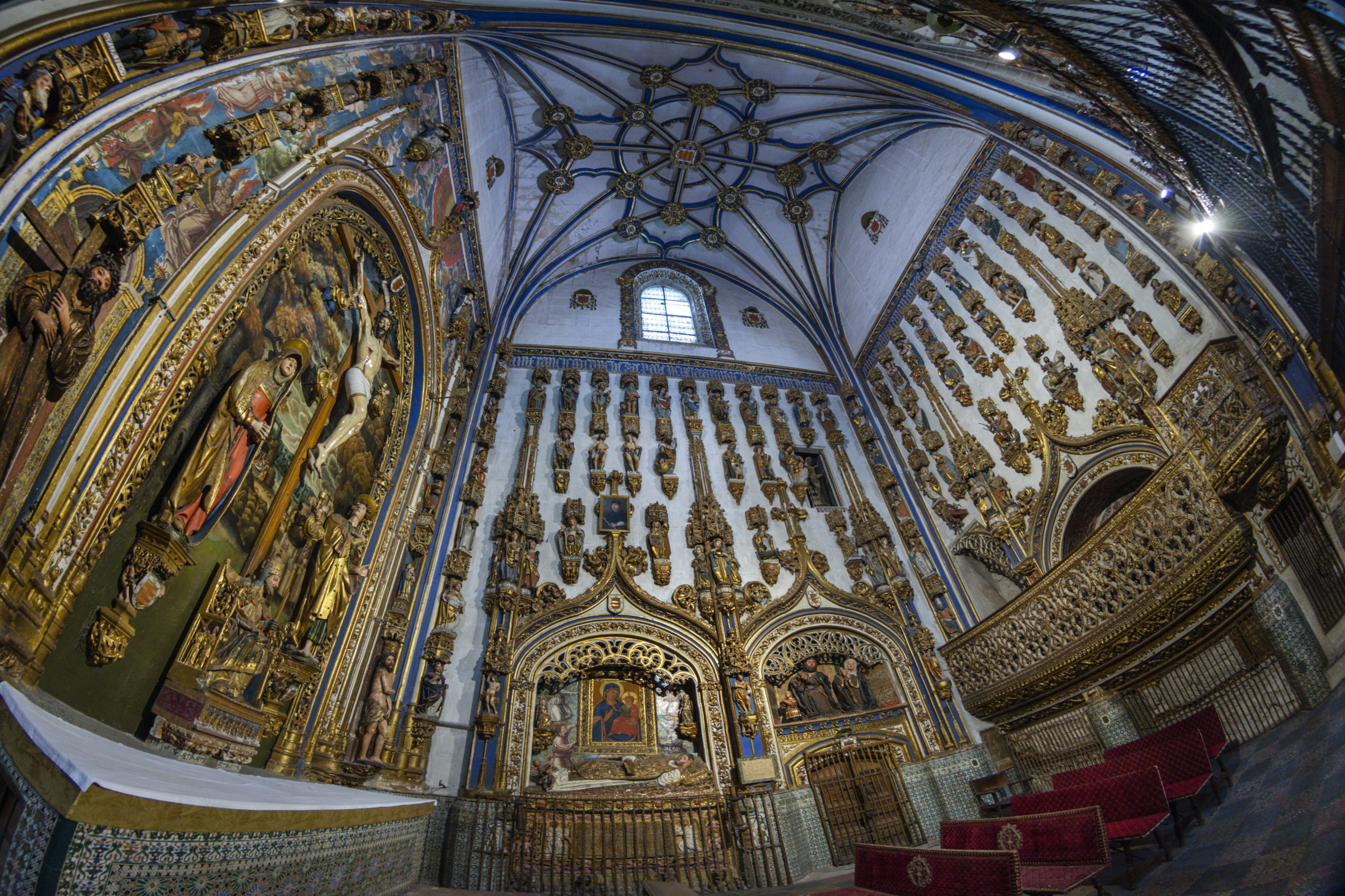 Más de cien imágenes escultóricas cuelgan sobre los muros de la capilla Dorada, en la Catedral Nueva, también conocida como de Todos los Santos, porque entre esas tallas se encuentran personajes sagrados de la historia de la Iglesia universal. Este espacio de oración, con una finalidad funeraria, fue fundada en 1525 por un canónigo del templo, Francisco Sánchez Palenzuela.