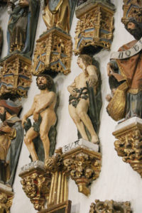 Adán y Eva se reflejan desnudos, y como detalla este historiador del Arte, “parece que ya han pecado y están avergonzados”. Otros personajes representados en esta capilla son Caín y Abel, “así como distintos personajes del antiguo testamento, y otros santos que tenían una gran devoción en el siglo XVI, como las mártires Santa Bárbara, Santa Lucía, Santa Águeda, o Santa Marina, que aparece con su cartela para diferenciarse también de Santa Margarita”.