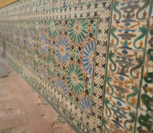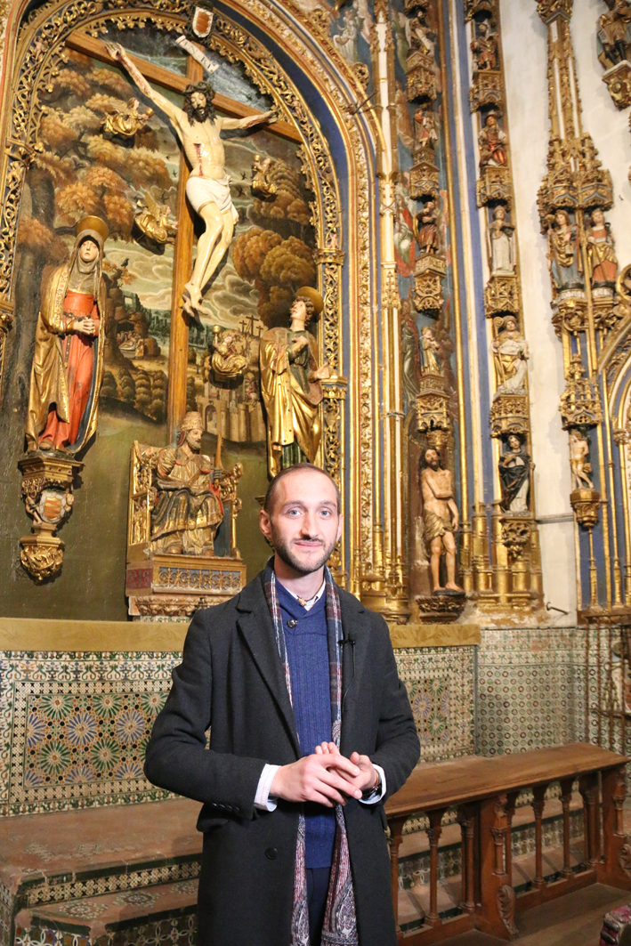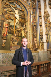 Otro detalle singular de la capilla de Todos los Santos son sus azulejos, en el suelo y las paredes, de Talavera de la Reina, originales del siglo XVI, “y con unos motivos que nos recuerdan a la Alhambra de Granada“, precisa. Y a los pies de la capilla aparece un pequeño coro y una tribuna, “con un púlpito donde estaba colocado un pequeño órgano que hoy está en la Catedral Vieja, de en torno a 1539, uno de los más antiguos que conserva la Catedral de Salamanca”.