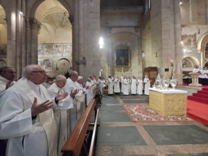 La Misa Crismal pone de manifiesto la comunión de la Iglesia diocesana. En ella se hace visible la unidad entre el obispo, los sacerdotes y todos los bautizados, que participan del único sacerdocio de Cristo llamados a continuar su misión en medio del mundo.