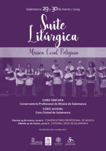 También en el mes de marzo, el 30 de marzo, tendrá lugar un concierto ‘Suite Litúrgica’ ofrecido por dos coros juveniles de la ciudad, organizado por el Conservatorio Profesional de Salamanca, la Fundación Salamanca Ciudad de Cultura y Saberes, y la Catedral. Entrada libre hasta completar el aforo.