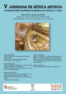 Asimismo, del 25 al 29 de marzo, la Catedral salmantina albergará las V Jornadas de Música Antigua, organizadas por el Conservatorio Superior de Castilla y León (COSCYL), que desde hace unos años programa conferencias y conciertos a cargo de los profesores de instrumentos de música antigua, que se imparten en el Conservatorio, como órgano, clave, viola da gamba o diferentes agrupaciones de música de cámara. Como apuntan desde la Catedral, “la finalidad es poner en valor este tipo de música y difundirla entre el público general de una manera más didáctica”. Las jornadas se desarrollarán en la capilla de Santa Catalina, salvo el concierto de órgano del miércoles 27 de marzo, con entrada libre hasta completar el aforo. (Adjuntamos el cartel con el programa).