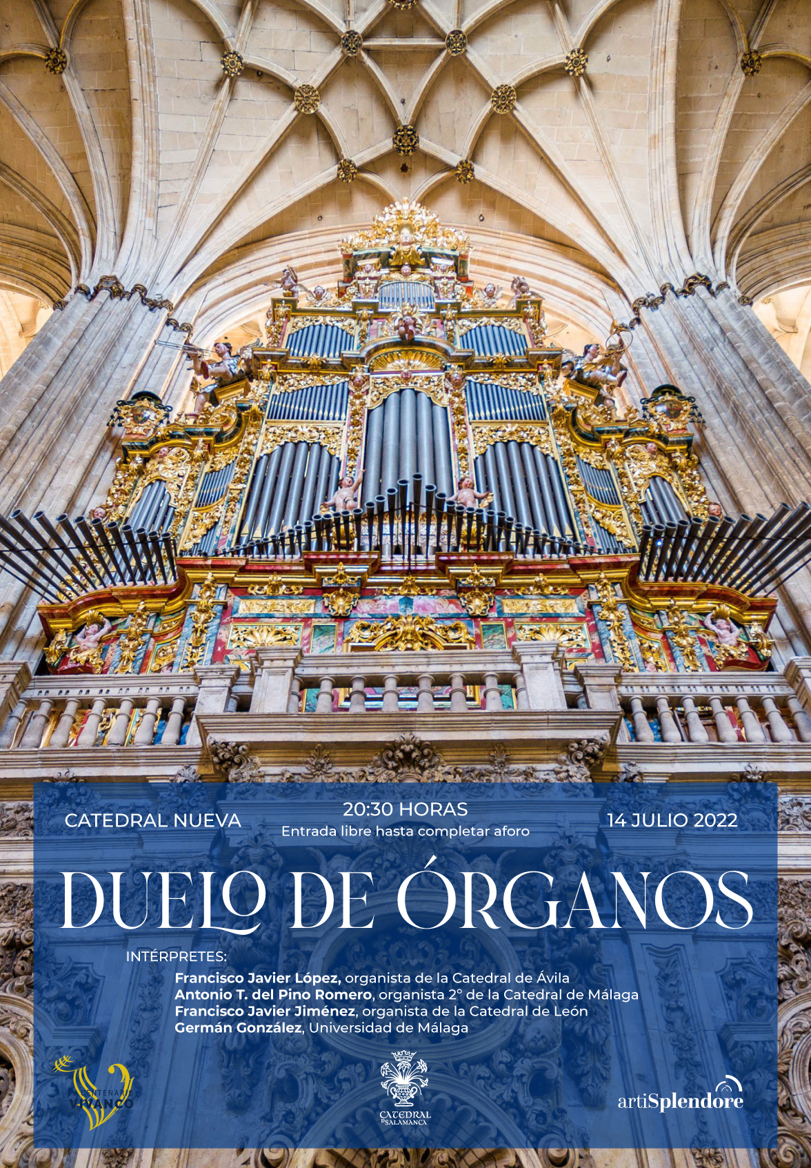 La Catedral de Salamanca suma este jueves, 14 de julio, un nuevo concierto de órganos a su programación del Año de la Música que está celebrando con motivo del IV Centenario de la muerte de Sebastián de Vivanco (ca. 1551-1622). El concierto, que lleva por título “Duelo de órganos”, correrá a cargo de Antonio T. del Pino Romero, organista 2º de la Catedral de Málaga; Francisco Javier López García, organista de la Catedral de Ávila; Francisco Javier Jiménez, organista de la Catedral de León; y, Germán González Sánchez, organista titular de las iglesias de San Pedro y de Santa Ana en Granada, quienes enfrentarán musicalmente los dos órganos que alberga el coro de los Churriguera de la Catedral Nueva, y otros dos órganos positivos que han traído para la ocasión.