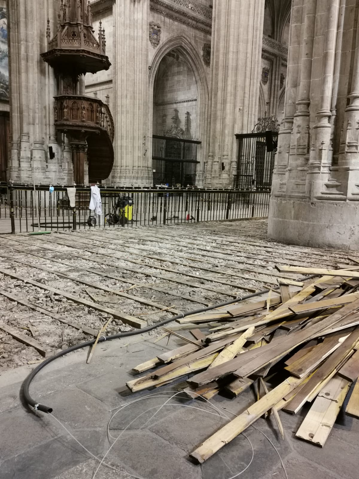 La intención inicial en un primer momento era reponer las tablas que estaban en mal estado, carcomidas o rotas, “y se intentó hacer eso”, pero como apunta este canónigo del templo, “los rastreles estaban en tal mala situación que cuando tratábamos de quitar una tabla se salían varias”. Además, debajo de las tablas encontraron residuos, tierra, escombros y cascotes…, “y evidentemente no es salubre una cosa de ese estilo en la Catedral”.