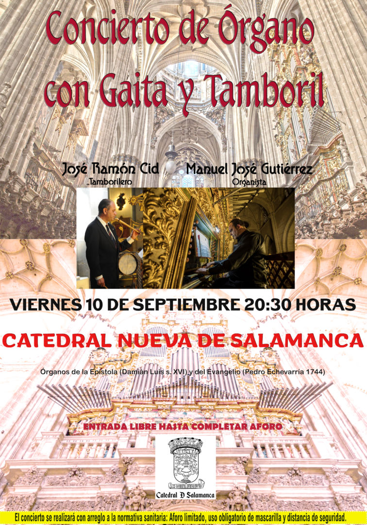 Con motivo de las fiestas en honor a la Virgen de la Vega, la Catedral Nueva de Salamanca acogerá el 10 de septiembre, a la 20:30 horas, un concierto de dos instrumentos con mucha historia: el órgano y la gaita. Interpretados por Manuel José Gutiérrez y José Ramón Cid respectivamente, “su unión será una experiencia musical poco frecuente”, según subrayan los organizadores. Integran el programa obras de Juan del Encina o Miguel Manzano entre otros, así como arreglos de los propios intérpretes sobre temas del folklore popular.