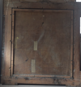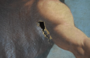 En este cuadro ya se había intervenido con anterioridad, como ellas mismas explican, “en la que se colocaron hasta cinco parches por el reverso, que provocaron deformaciones en el soporte”. Carmina Fernández aclaró que también el óleo presentaba repintes, “aplicados de manera burda y con levantamiento de la película pictórica”. Asimismo, descubrieron la rotura del soporte por el reverso y el anverso de la obra.