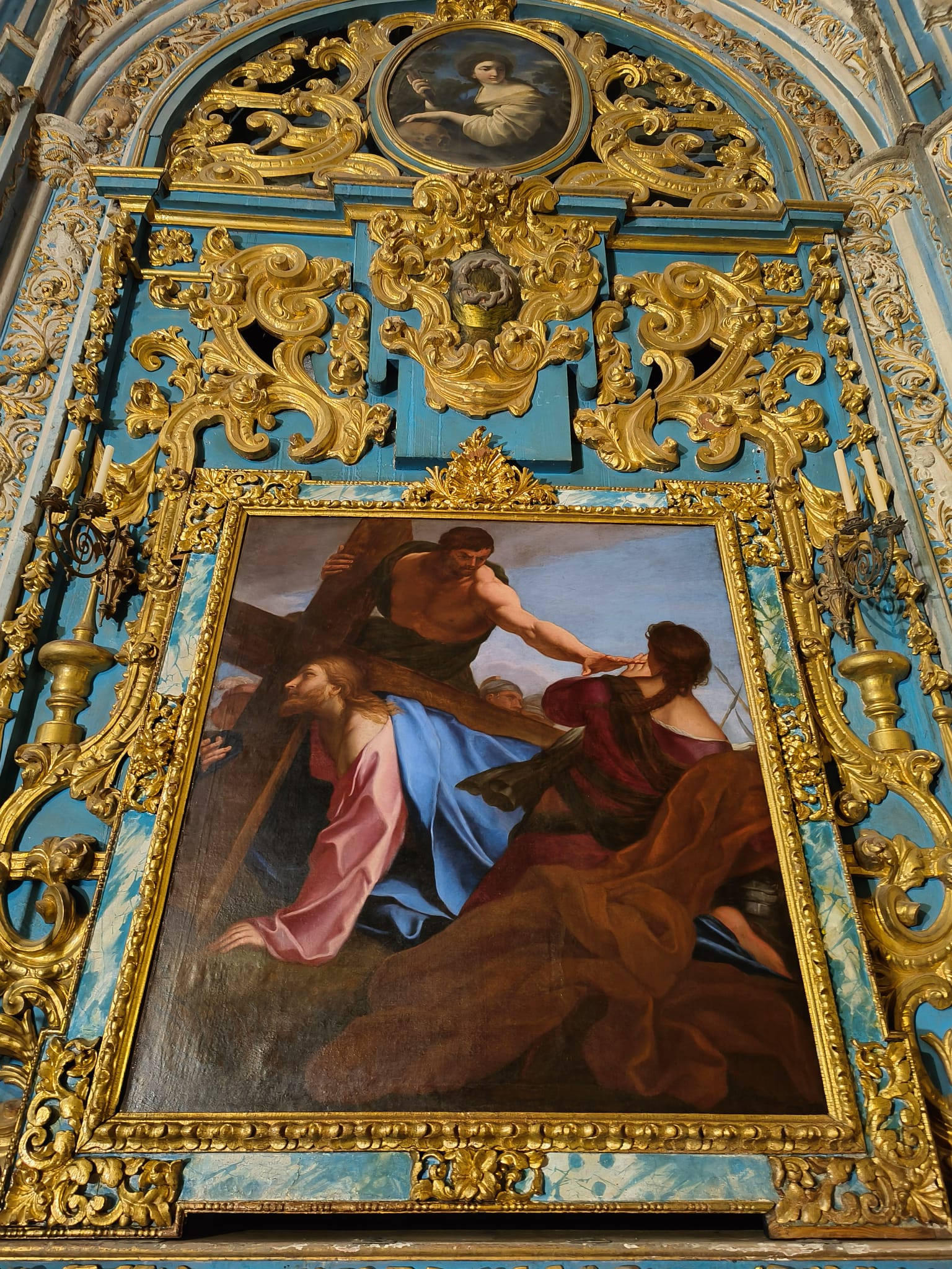 El lienzo representa el encuentro de Cristo y la Verónica durante su camino al calvario, y mide 125 cm de ancho y 135 cm de altura. Se encuentra en el centro de un retablo del siglo XVIII, dorado y policromado en tonos azules, y enmarcado con una moldura en esos mismos colores, con decoraciones vegetales talladas en los ángulos y en la mitad de cada travesaño.