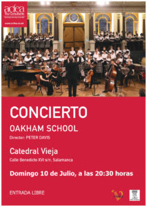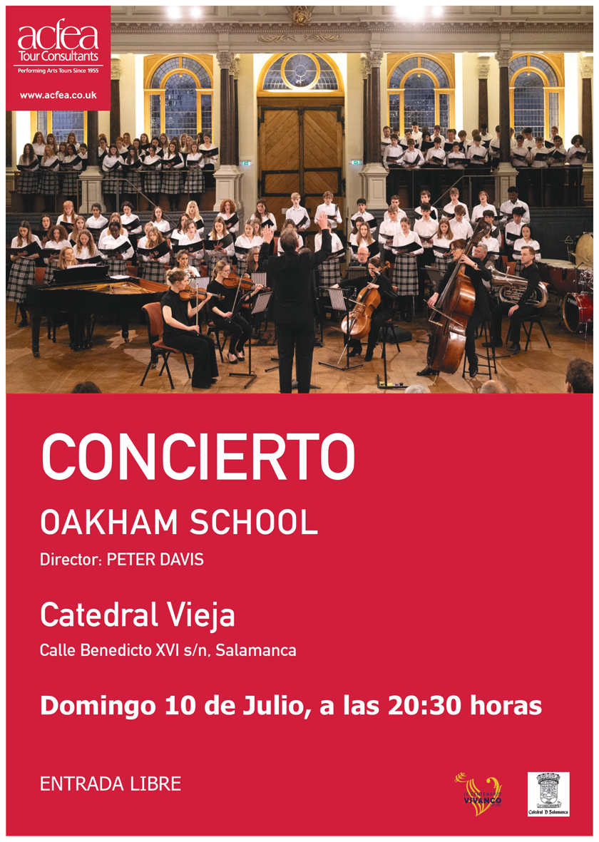 El primero de ellos será ofrecido por el Coro del Colegio Oakham de Reino Unido y su orquesta de cámara, el domingo, 10 de julio, en la Catedral Vieja, y se inserta dentro de la gira que questá realizando por nuestro país. Esta agrupación coral deleitará al público asistente “con piezas orquestales de A. Dvorák o E. Grieg, así como obras del repertorio coral sacro de autores como J. Brahms y W. A. Mozart”, informa Alberto Moñivas, organista de la Catedral de Salamanca.