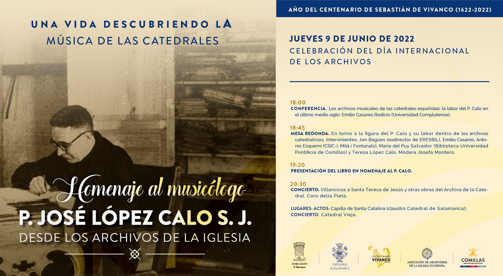El Archivo de la Catedral de Salamanca contribuye a esta conmemoración con un homenaje a la figura del P. José López Calo, sj, un referente de la musicología española y de la documentación musical de nuestro país. Junto con la Asociación de Archiveros de la Iglesia y la Biblioteca de la Universidad de Comillas han preparado una conferencia, una mesa redonda, la presentación de un libro homenaje que tendrán lugar el día 9 de junio, de 18:00 a 19:30 horas, en la capilla Santa Catalina de la Catedral Vieja. El broche final lo pondrá el Coro della Pietà con un concierto de villancicos a Santa Teresa y otras obras del archivo musical de la seo salmantina, a las 20:30 horas en la Catedral Vieja. La entrada es libre hasta completar el aforo. El programa completo puedes consultarlo aquí.
