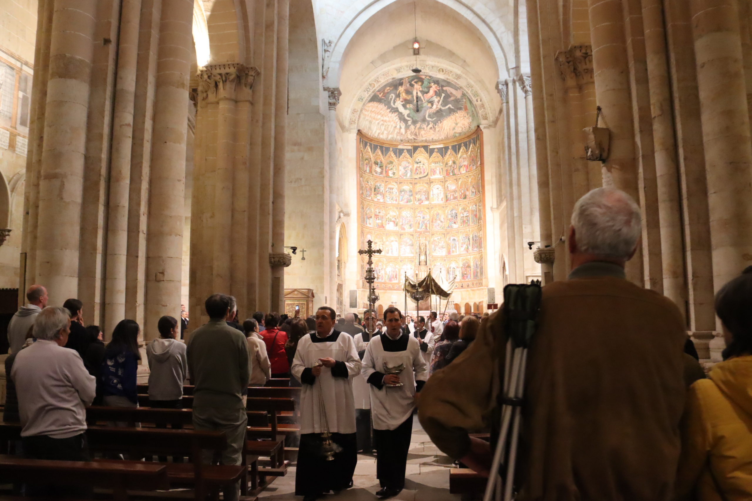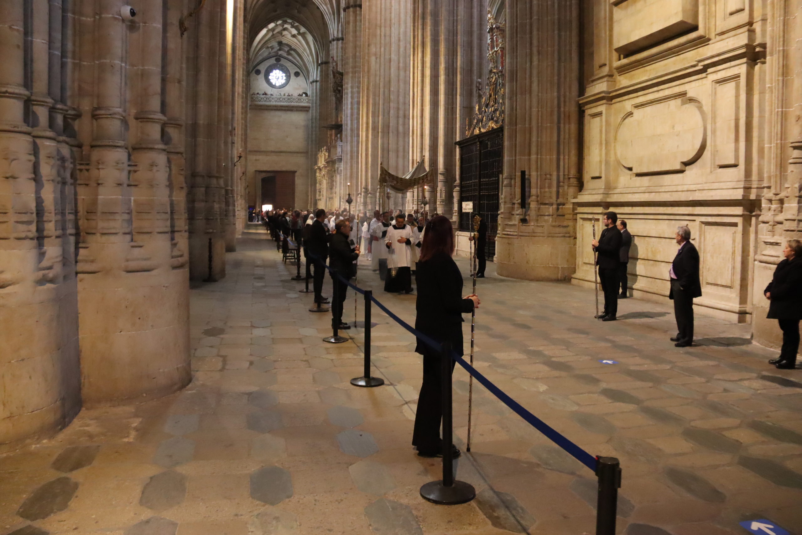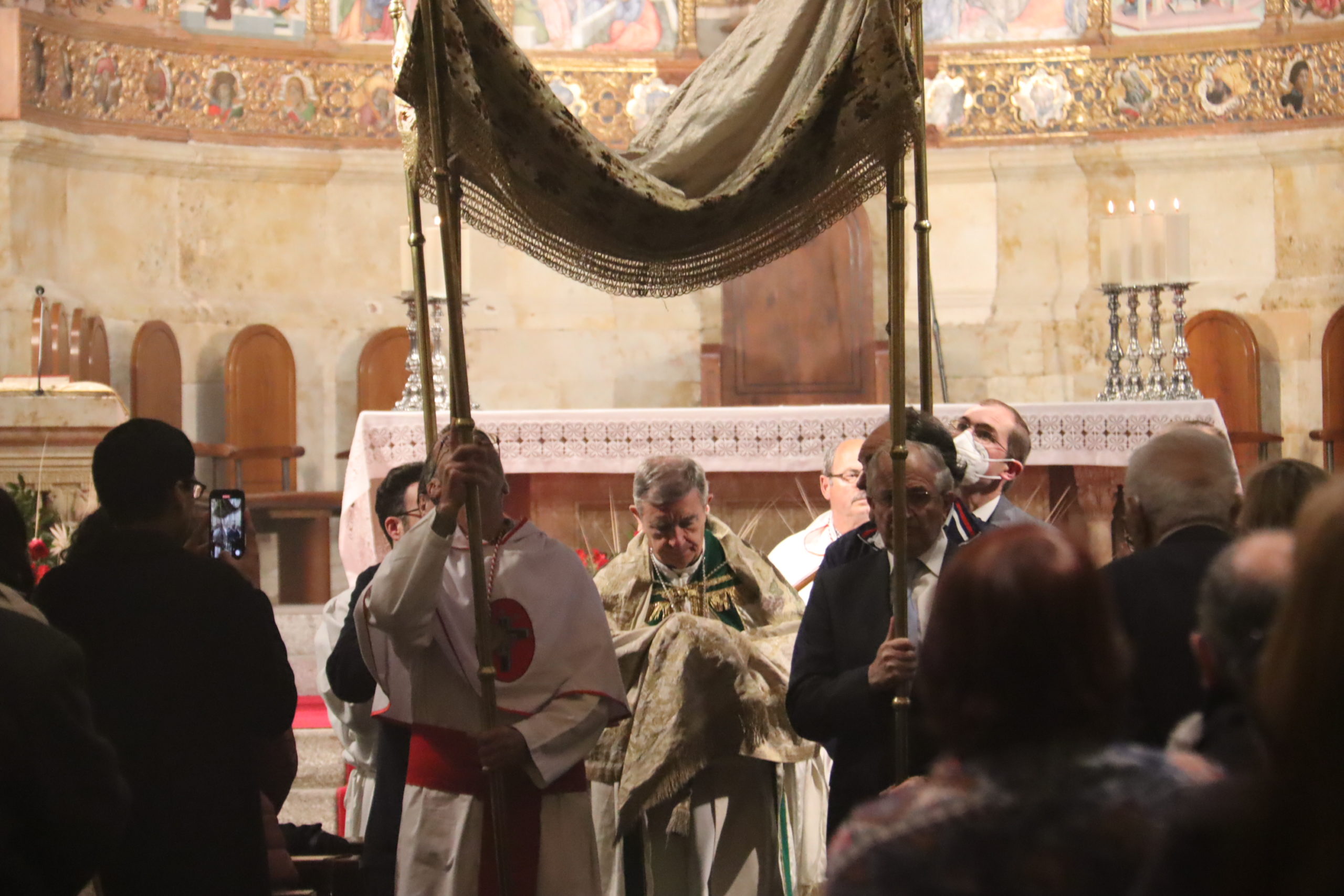 Después del lavatorio, dio comienzo la liturgia eucarística, en la que el pastor de la Diócesis de Salamanca ha evocado la cena pascual que Jesús compartió con sus discípulos. Tras la comunión, en un ambiente de profundo recogimiento, el obispo acompañado de los concelebrantes, los acólitos y la asamblea ha llevado la Eucaristía, procesionalmente y bajo palio, hasta la capilla de San José de la Catedral Nueva donde se ha instalado el altar para la reserva y la adoración.