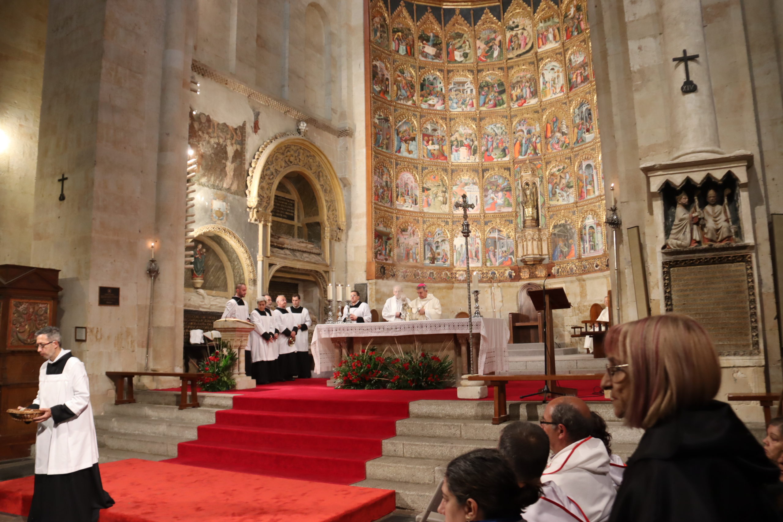 El obispo de Salamanca, Mons. José Luis Retana, presidió este Jueves Santo la Santa Misa “In Cena Domini”, con la que se ha iniciado el Triduo Pascual en la Catedral. Una celebración en la que ha conmemorado la institución de la eucaristía, el sacerdocio y el mandamiento del amor fraterno, manifestado con el signo del lavatorio de los pies. Un gesto que el obispo ha rememorado al término de su homilía, en la que despojado de su casulla y con una toalla en su cintura se ha agachado a lavar y besar los pies de varios cofrades de la Hermandad de Jesús Amigo de los Niños, del Cristo Yacente y de Nuestra Señora de la Soledad, situados en las escaleras del presbiterio.