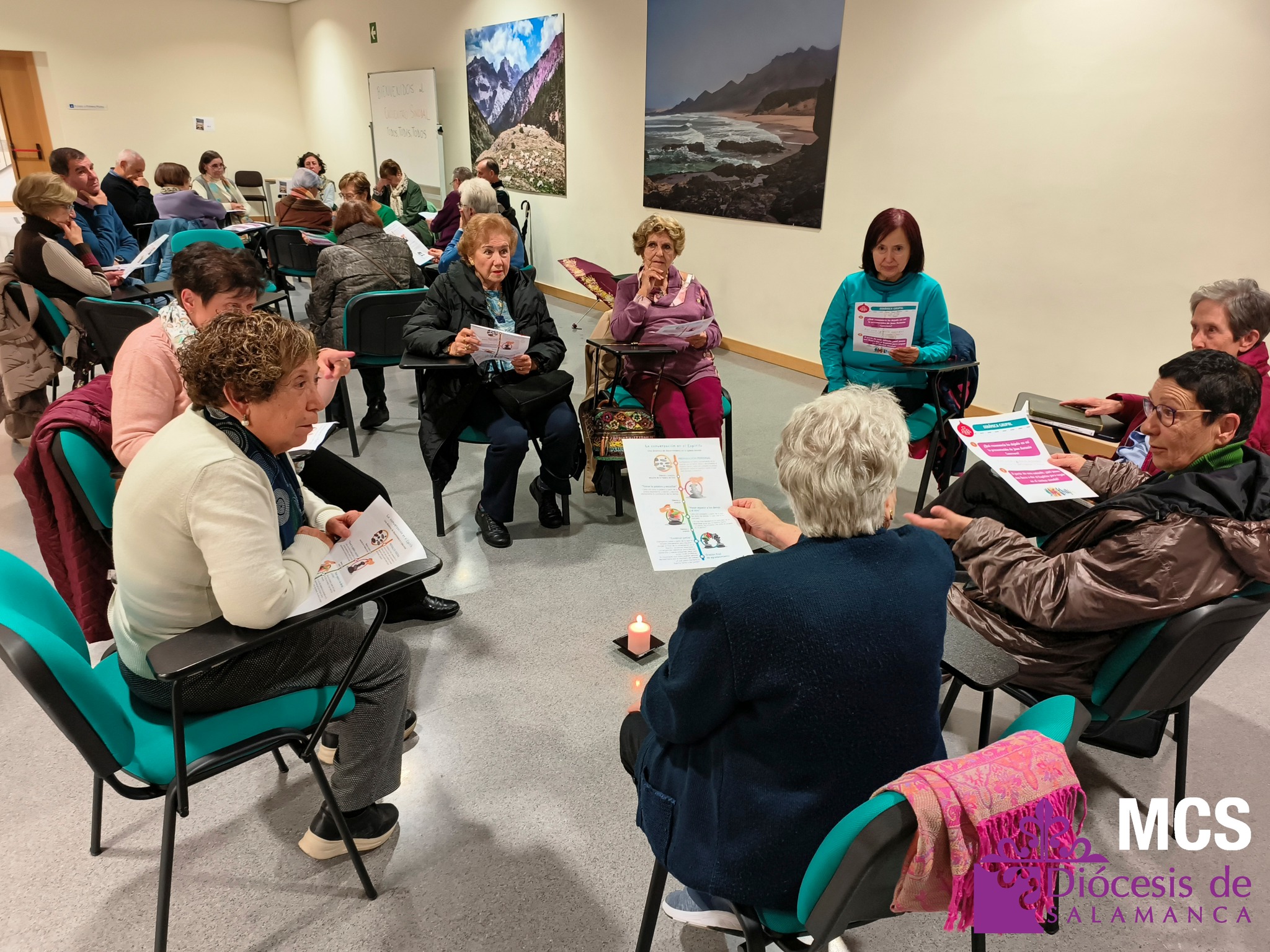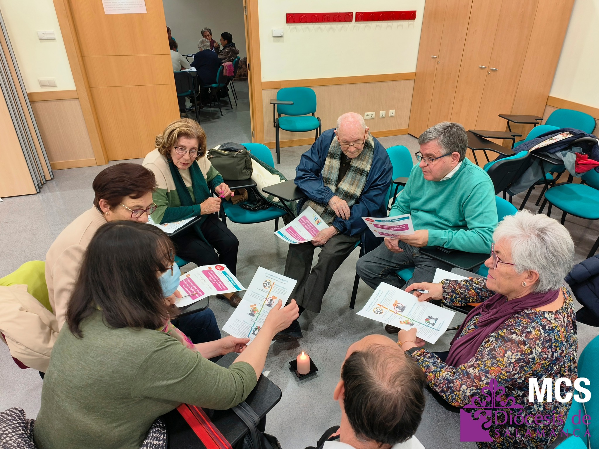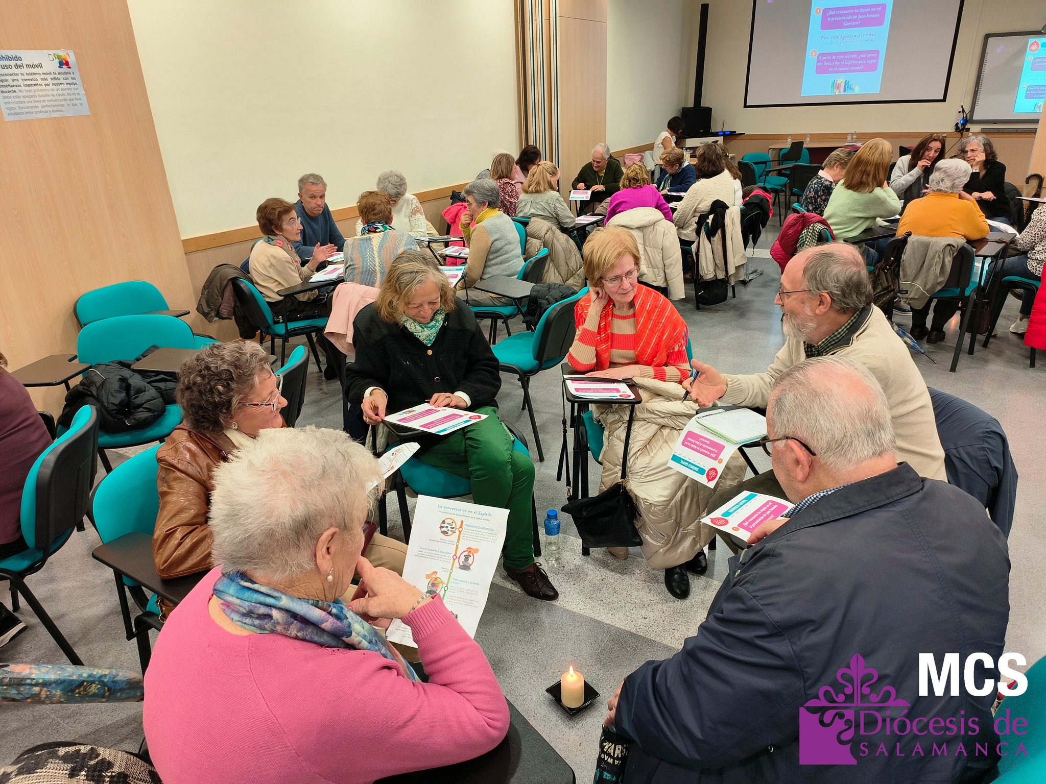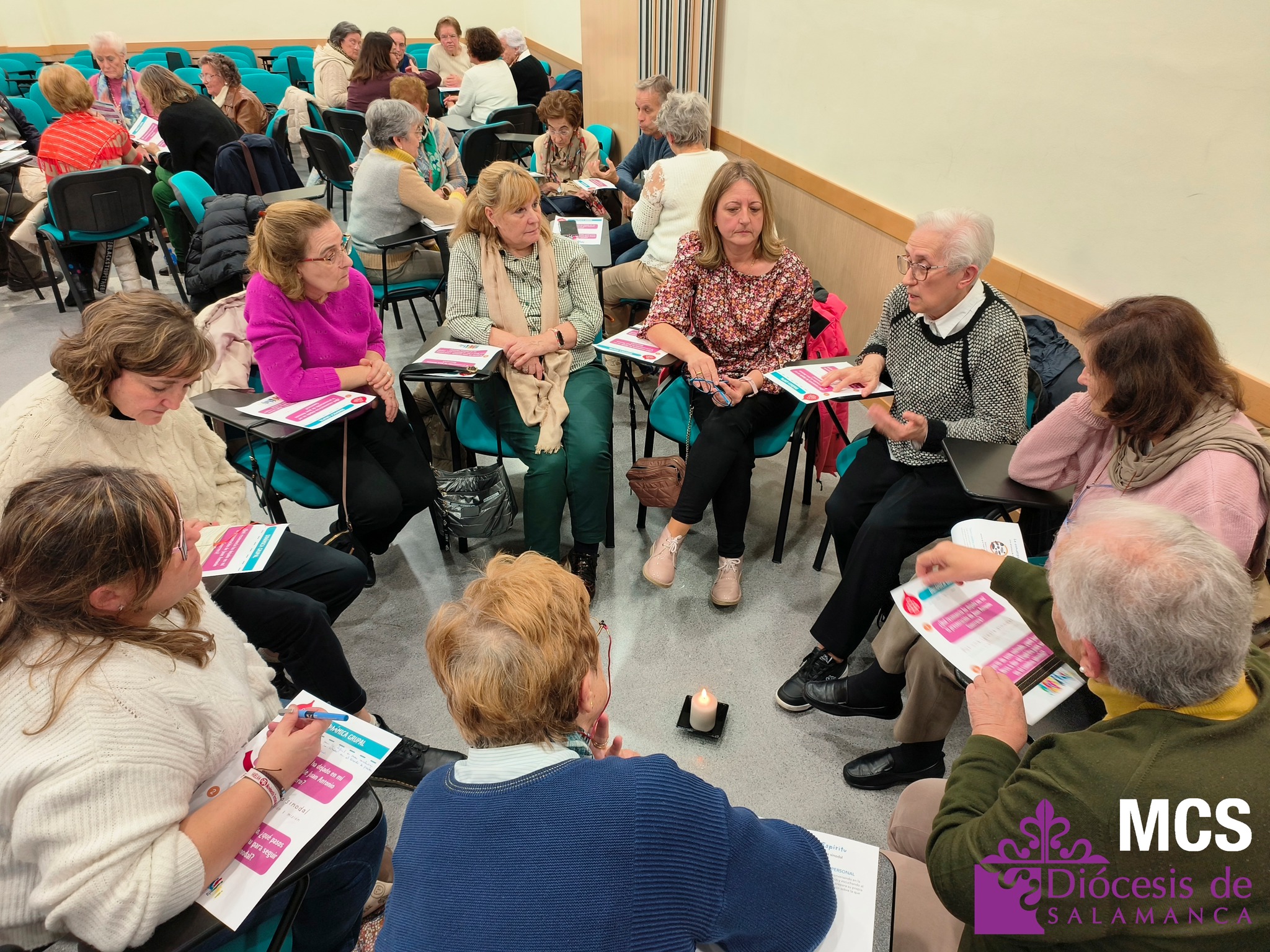 En total, trabajaron doce grupos de unas ocho personas cada uno, que además tuvieron ocasión de presentarse y compartir su grupo o parroquia de referencia, así como opinar y escuchar a los demás siguiendo el método de conversación espiritual. Y en el centro de todos ellos, una vela encendida para hacer presente al Espíritu.