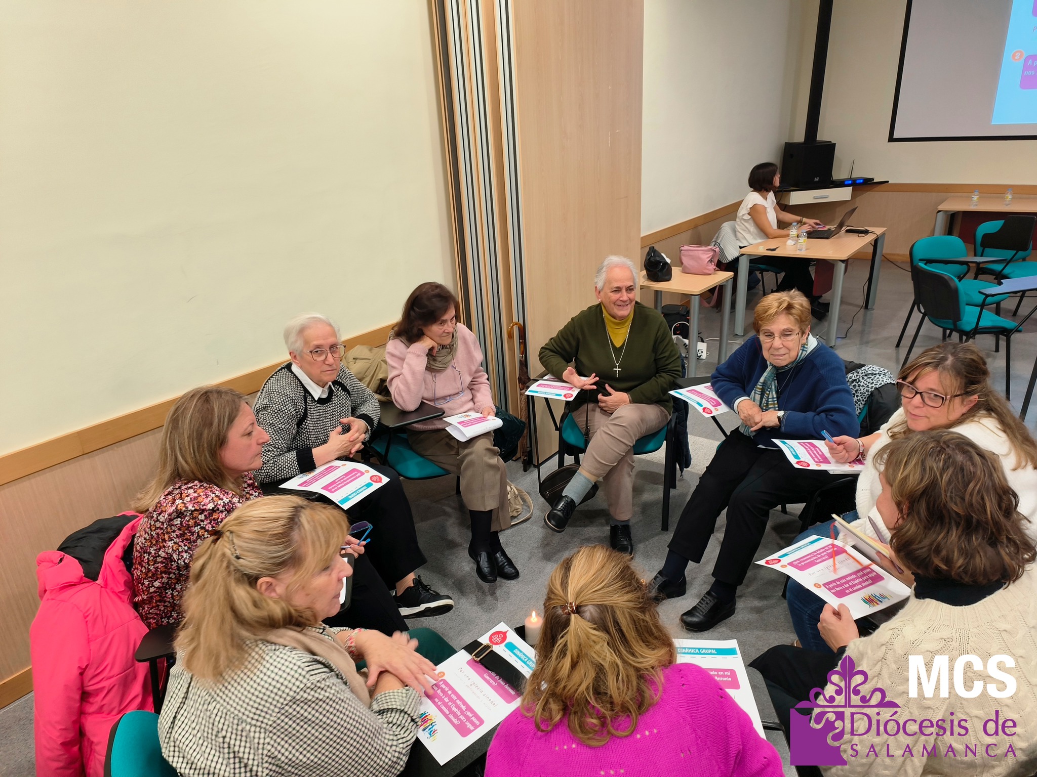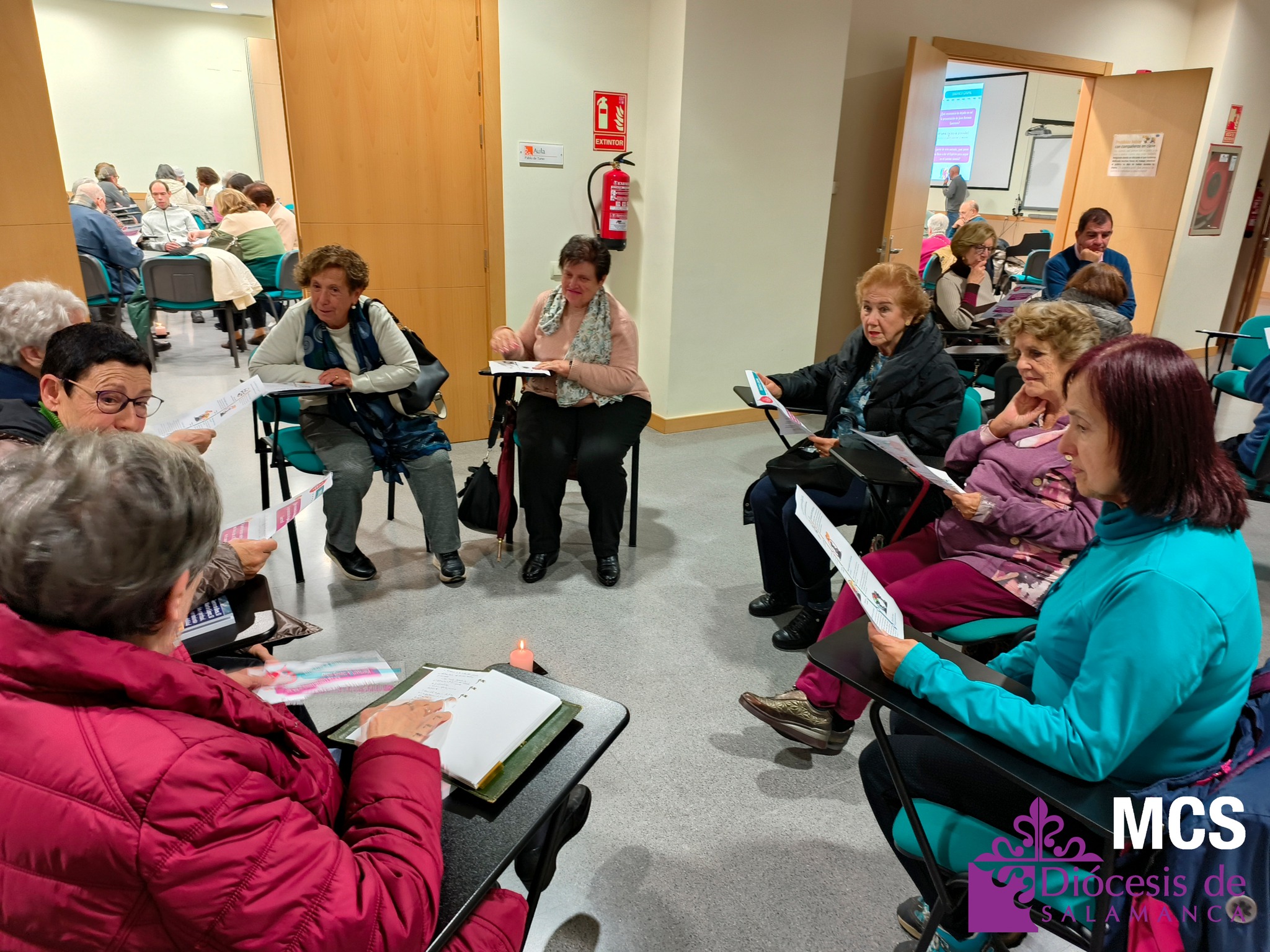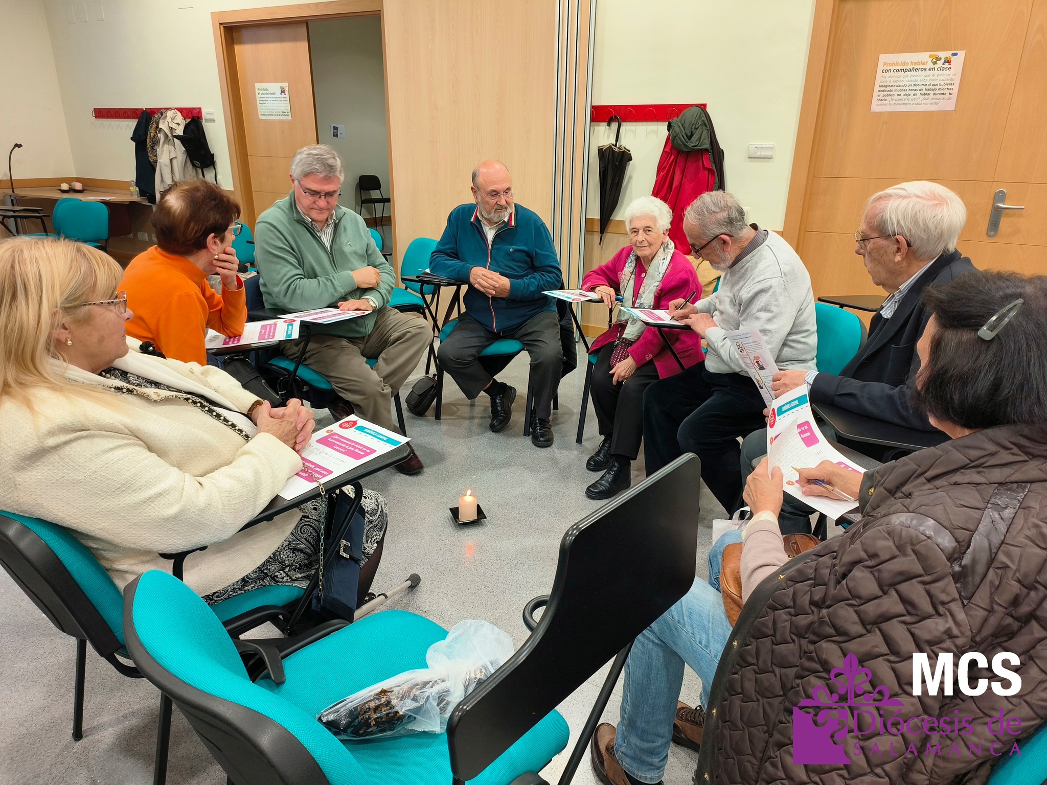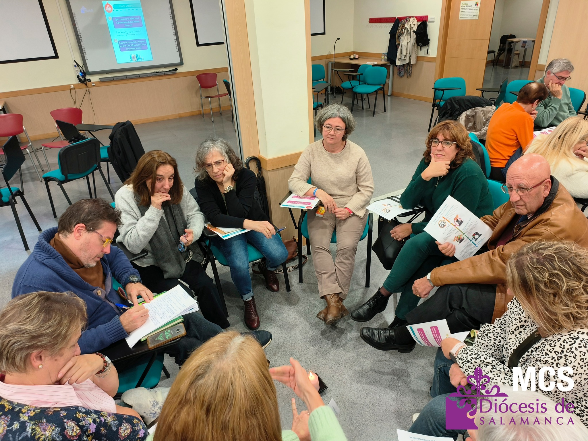 En total, trabajaron doce grupos de unas ocho personas cada uno, que además tuvieron ocasión de presentarse y compartir su grupo o parroquia de referencia, así como opinar y escuchar a los demás siguiendo el método de conversación espiritual. Y en el centro de todos ellos, una vela encendida para hacer presente al Espíritu.