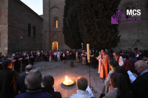 3. El “inicio de la vigilia o lucernario” se puede hacer a la entrada del templo. El celebrante principal deberá estar acompañado por un número limitado de ministros, mientras todos los fieles se mantendrán en sus lugares. Se bendice el fuego, se hacen los ritos de preparación y se enciende el cirio tal como indica el Misal. El sacerdote y los ministros, manteniendo la distancia de seguridad, hacen la procesión por el pasillo central y se cantan las tres invocaciones “Luz de Cristo”. No es recomendable repartir entre los fieles las velas y que las vayan encendido del cirio y luego pasen la luz unos a otros. Después de las invocaciones se canta el Pregón Pascual.