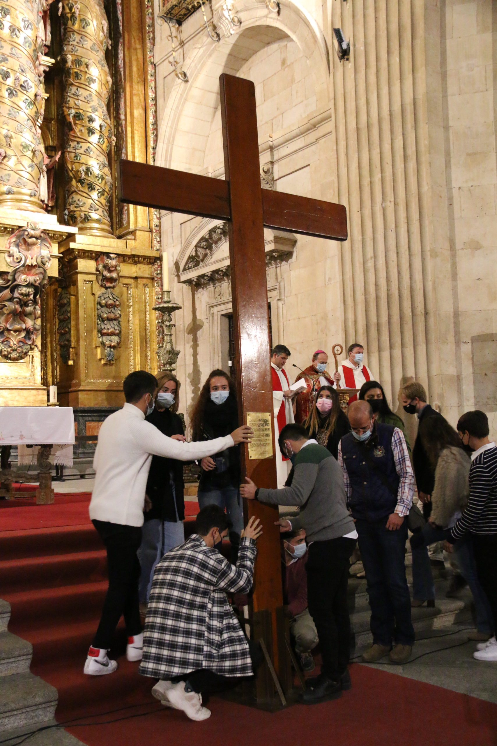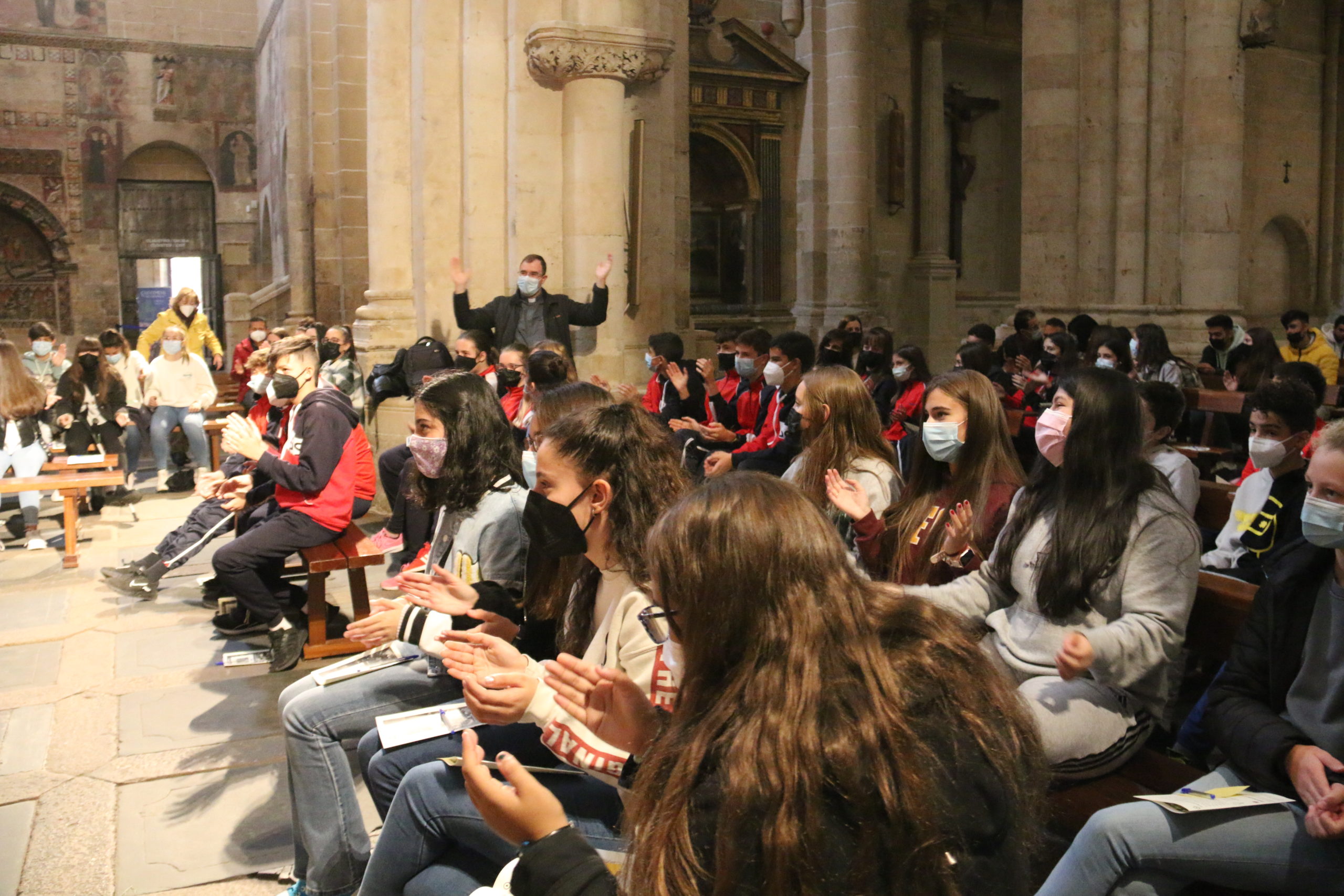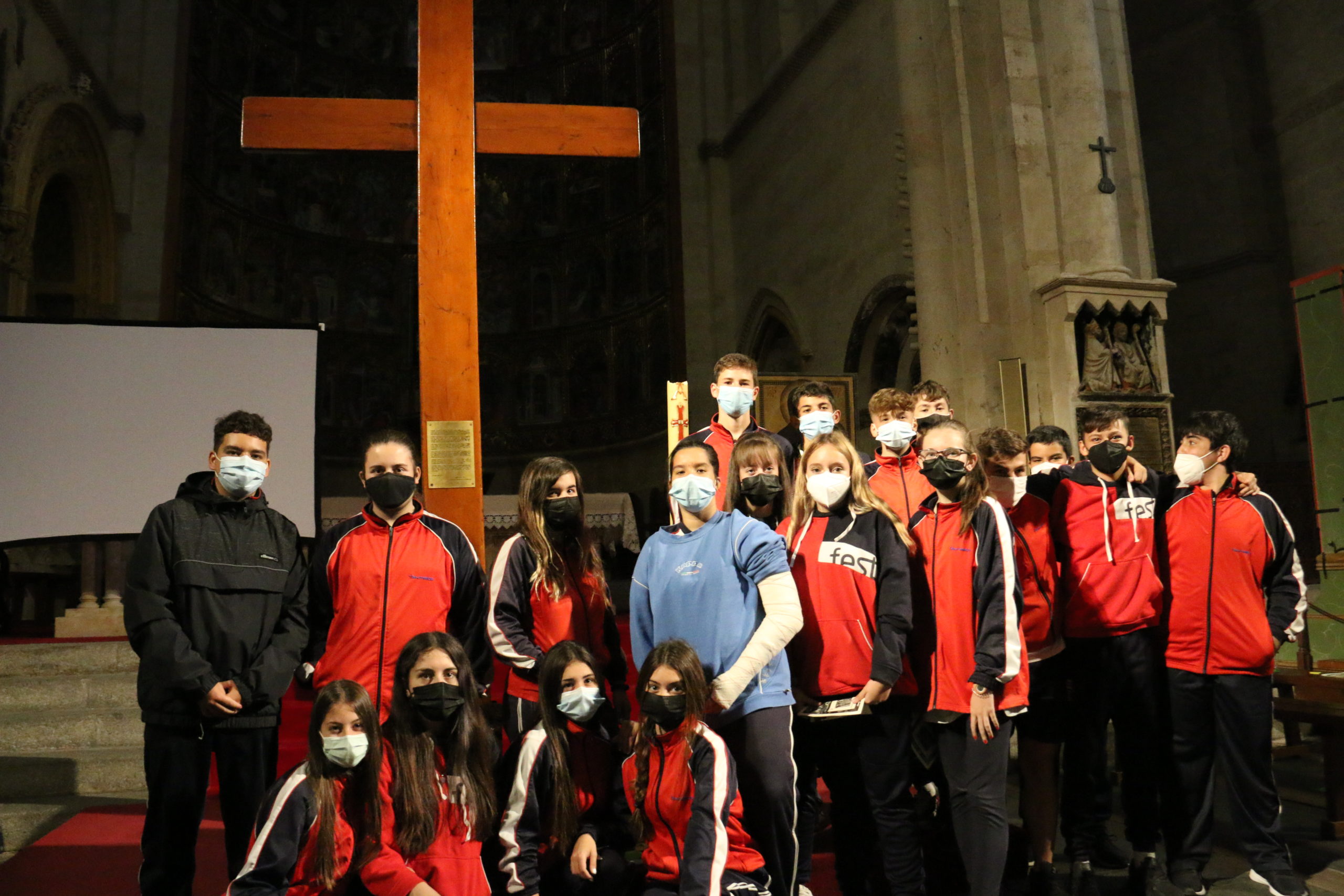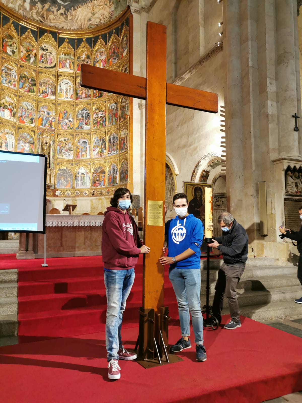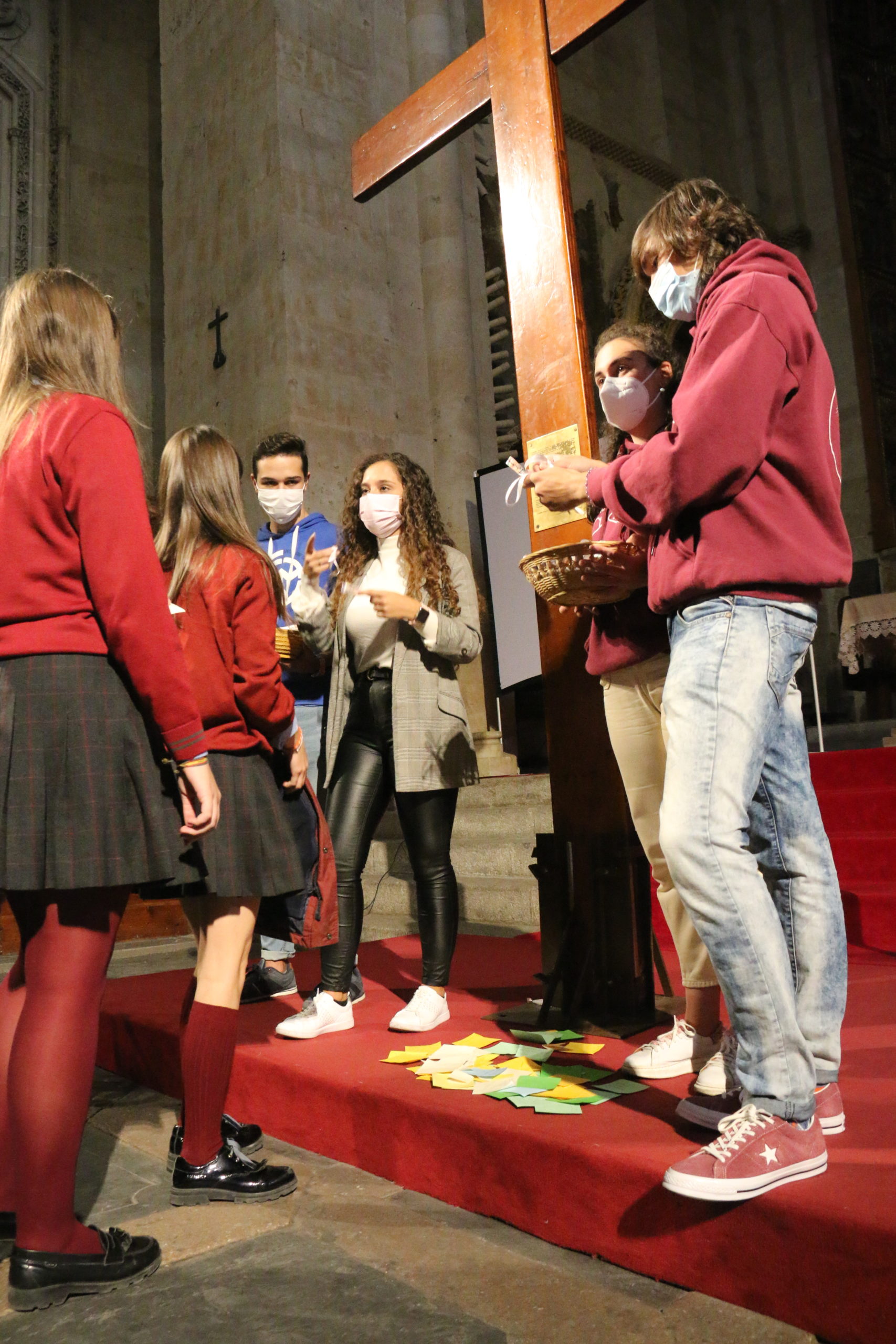 En la Catedral Vieja tuvo lugar un encuentro con 476 jóvenes de ESO y Bachillerato de 12 centros salmantinos, entre ellos, un grupo de Ciudad Rodrigo, a los que se les presentó ambos símbolos ubicados en el altar. Tras una lectura del Evangelio de San Juan, se les invitó a reflexionar sobre: “Y tú, ¿qué harías por el mundo?“. El encuentro, dividido en dos grupos de más de 200 alumnos, concluyó con la oración “Instrumentos de paz”, de San Francisco de Asís. Uno a uno, los jóvenes se acercaron a la Cruz de las Jornadas Mundiales de la Juventud para hacer un gesto de adoración.