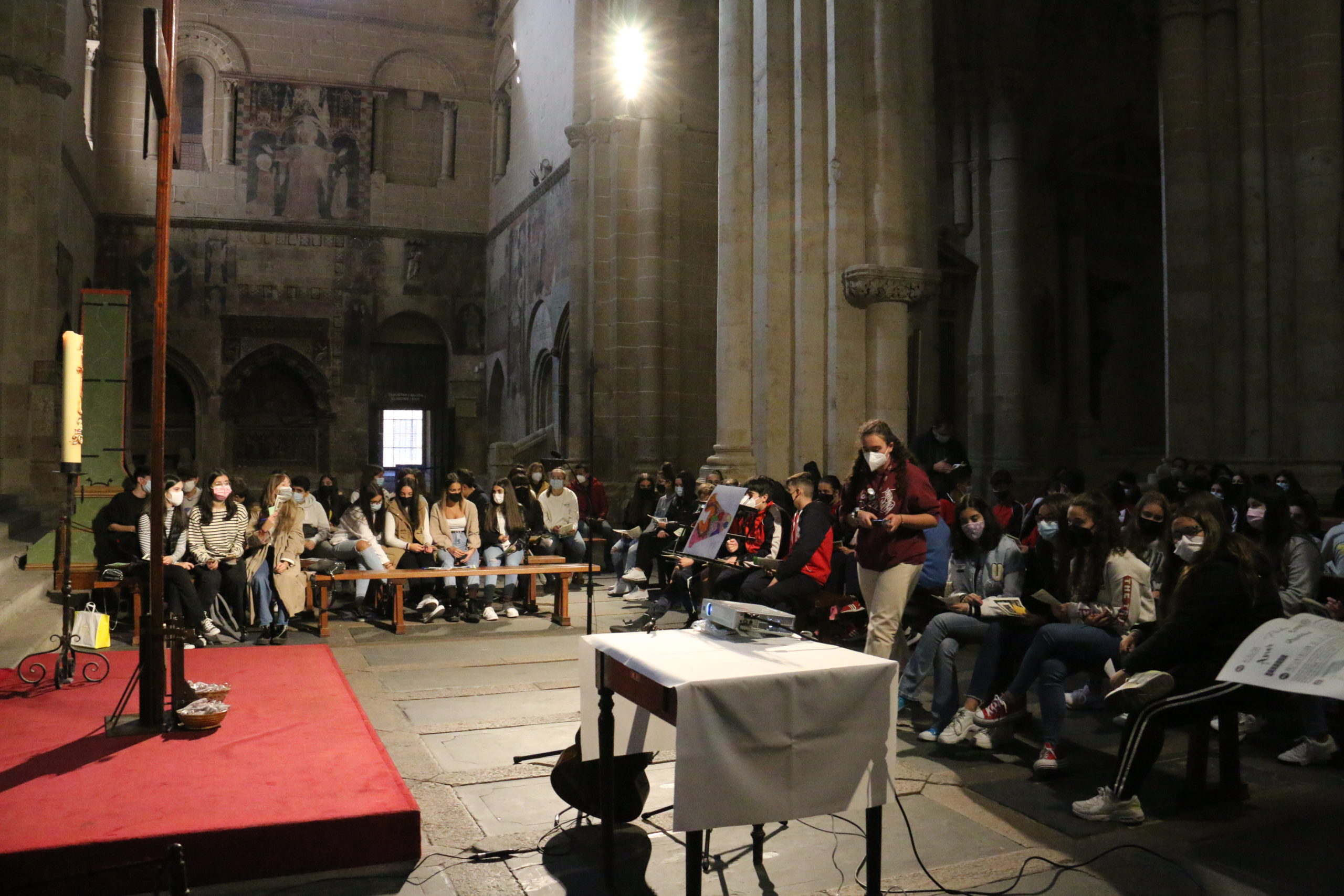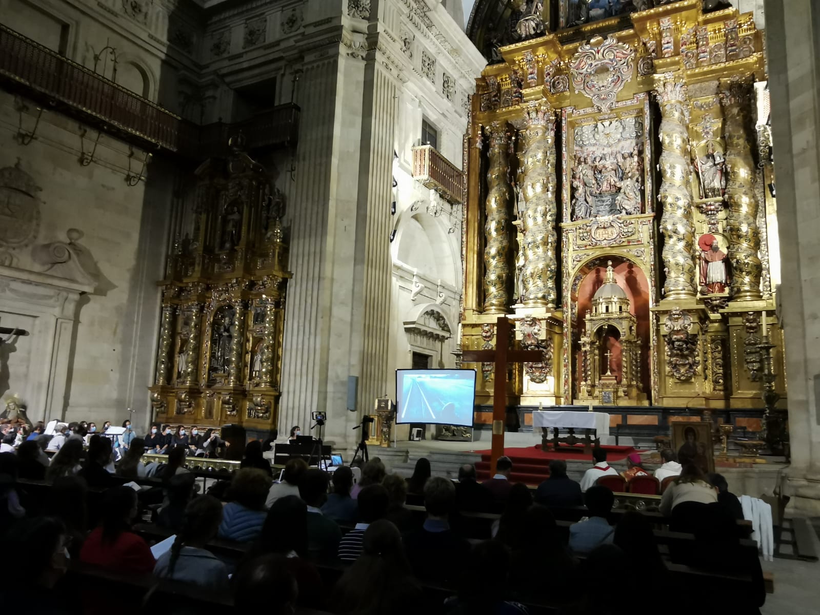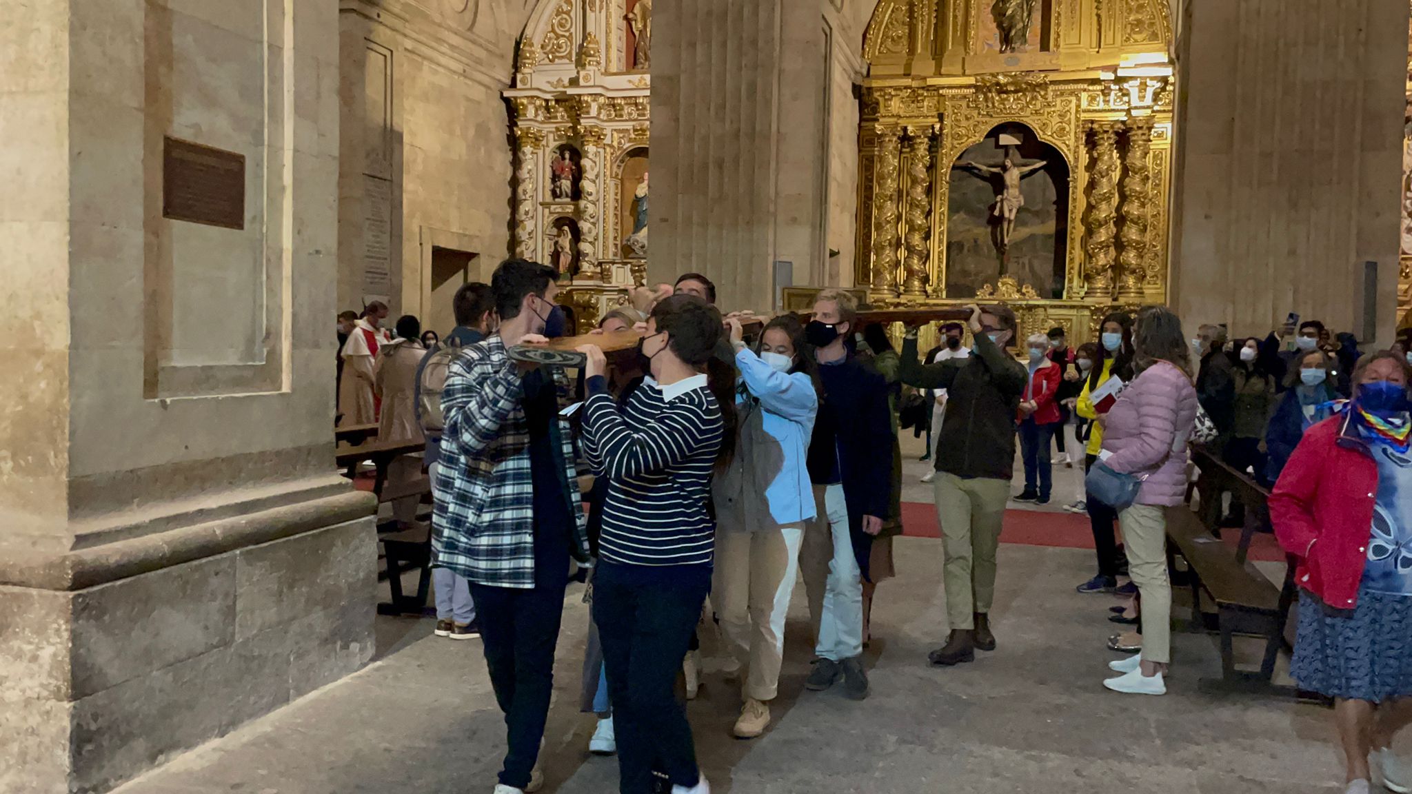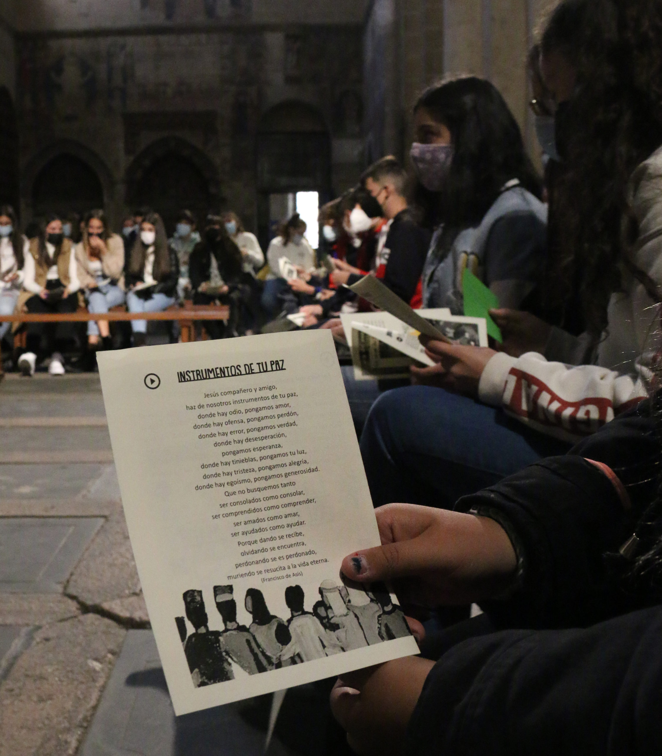 En la Catedral Vieja tuvo lugar un encuentro con 476 jóvenes de ESO y Bachillerato de 12 centros salmantinos, entre ellos, un grupo de Ciudad Rodrigo, a los que se les presentó ambos símbolos ubicados en el altar. Tras una lectura del Evangelio de San Juan, se les invitó a reflexionar sobre: “Y tú, ¿qué harías por el mundo?“. El encuentro, dividido en dos grupos de más de 200 alumnos, concluyó con la oración “Instrumentos de paz”, de San Francisco de Asís. Uno a uno, los jóvenes se acercaron a la Cruz de las Jornadas Mundiales de la Juventud para hacer un gesto de adoración.